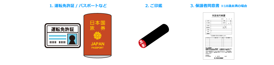 1.身分を証明する書類 2.ご印鑑 3.保護者同意書(18歳未満または高校生の場合)