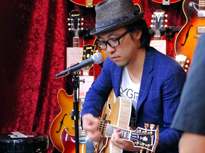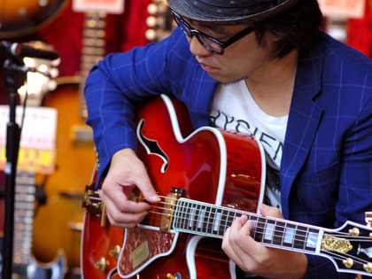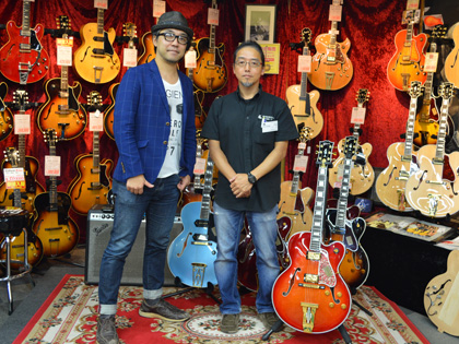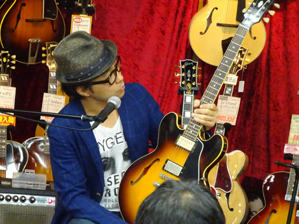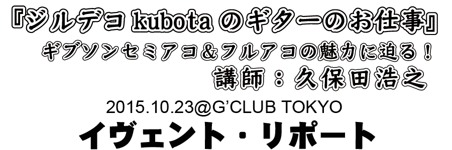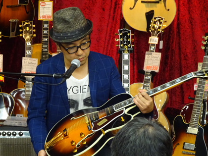 さる2015年10月23日、G'CLUB TOKYO ではジルデコイ・アソシエーションのギターリスト久保田浩之氏をお迎えして、恒例企画『G'CLUB 名物 勉強会』を行いました。今回ギブソン・メンフィス、カスタムクリムゾン製セミアコ&フルアコの構造などの解説を交えながら、久保田氏には当店在庫品より選び抜いた数本のデモ演奏していただき、それぞれのインプレッションなどを語って頂きました。スタンダードなプレイはもちろんのこと、バードランドを歪ませてロックなフレーズを弾きまくるといった久保田氏ならではのプレイも飛び出し、愉快なトークと相まって会場は終始楽しい雰囲気に包まれていました。また、質問コーナーや即席サイン会も行われ、お客様との交流もばっちりな、和やかなイヴェントとなりました。ご来場いただいた皆様、ありがとうございました。