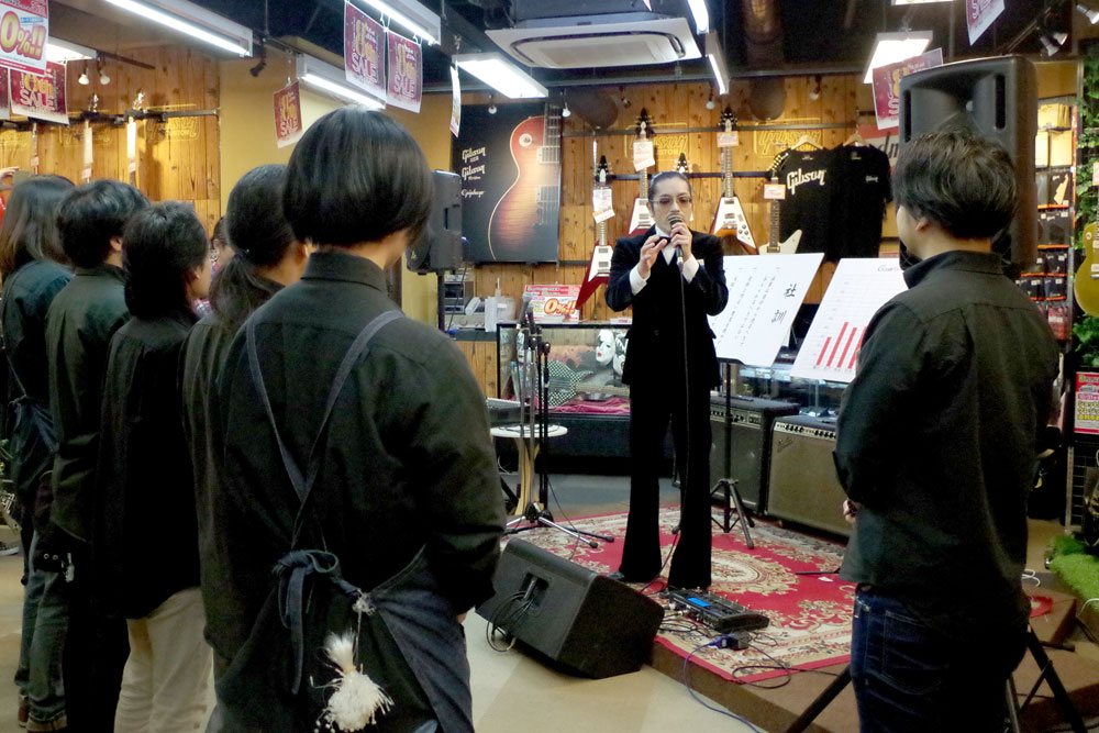 店長、ハンドマイクで熱唱始めるの図。