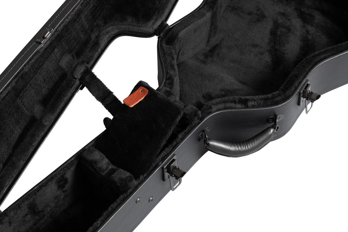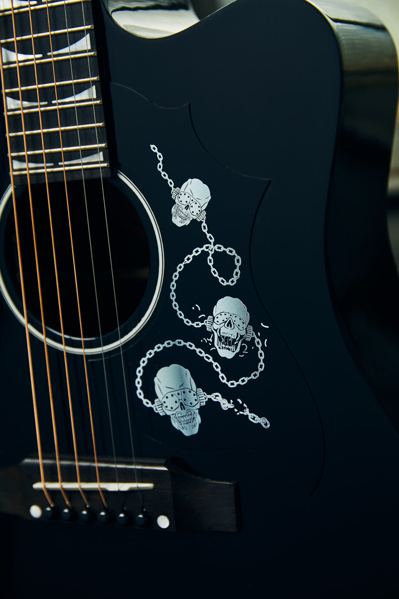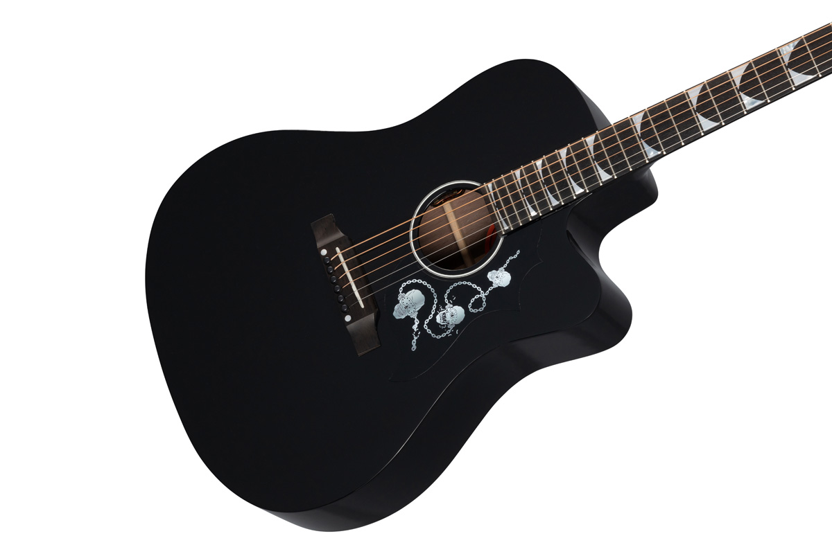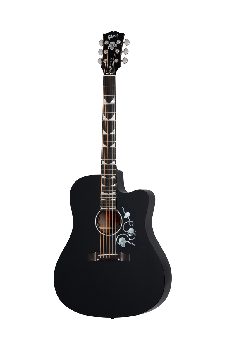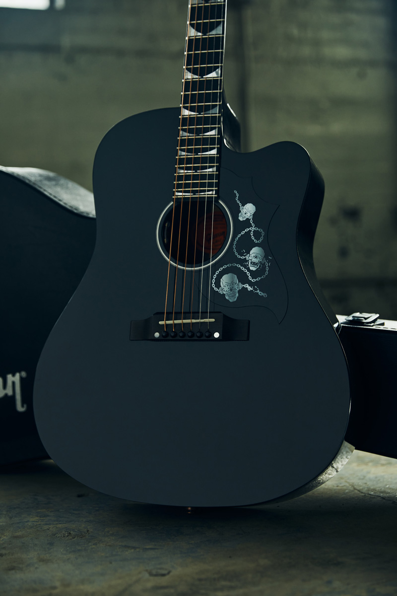 『ギブソン デイヴ・ムステイン ソングライター』は、伝統あるソングライター・モデルのデザインがベースになっています。ボディのサイド/バックにはウォルナット材が採用され、ボディの厚みは若干薄くデザインされている為より快適な演奏が可能です。さらに、ハイ・フレットへのアクセスを容易にするカッタウェイ、24. 75インチスケールのマホガニー・ネック、24フレットのエボニー指板(ギブソンのアコースティックギターで初めての24フレット仕様)、マザーオブパールのティース・インレイ、Grover® Rotomaticチューナー、TUSQ®ナット・サドル・ブリッジピン、そしてピックアップにはLR Baggs™ VTCアンダーサドル・ピックアップが搭載されています。メガデスのキャラクターとして有名なVic Rattleheadのアートワークはピックガード上とヘッドストック上のマザーオブパール・インレイにて施されています。カスタムハードシェルケースが付属します。