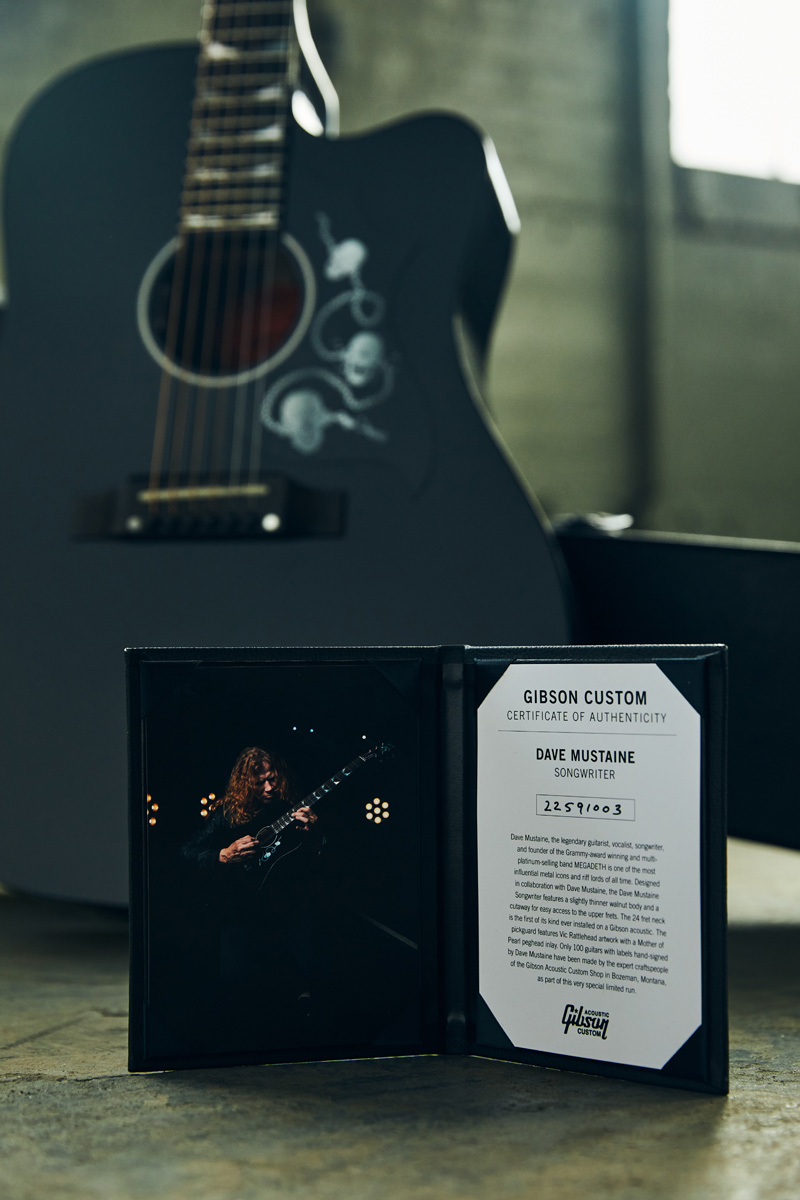 『ギブソン デイヴ・ムステイン ソングライター』は、デイヴ・ムステインの初のギブソン・アコースティックからのシグネチャー・モデルです。米国モンタナ州ボーズマンにあるギブソンの熟練のルシアーと、伝説のギタリスト、ボーカリスト、ソングライター、そしてグラミー賞受賞バンド“メガデス”の創設者であるデイヴ・ムステインが共同で開発したアコースティックギターです。今回特別に、通常版とは別に直筆サイン入り限定版も発売されます。