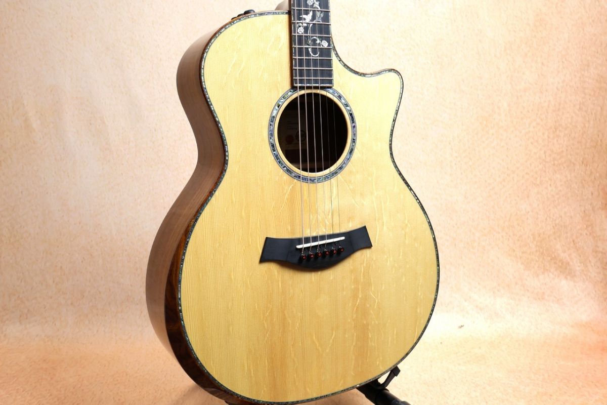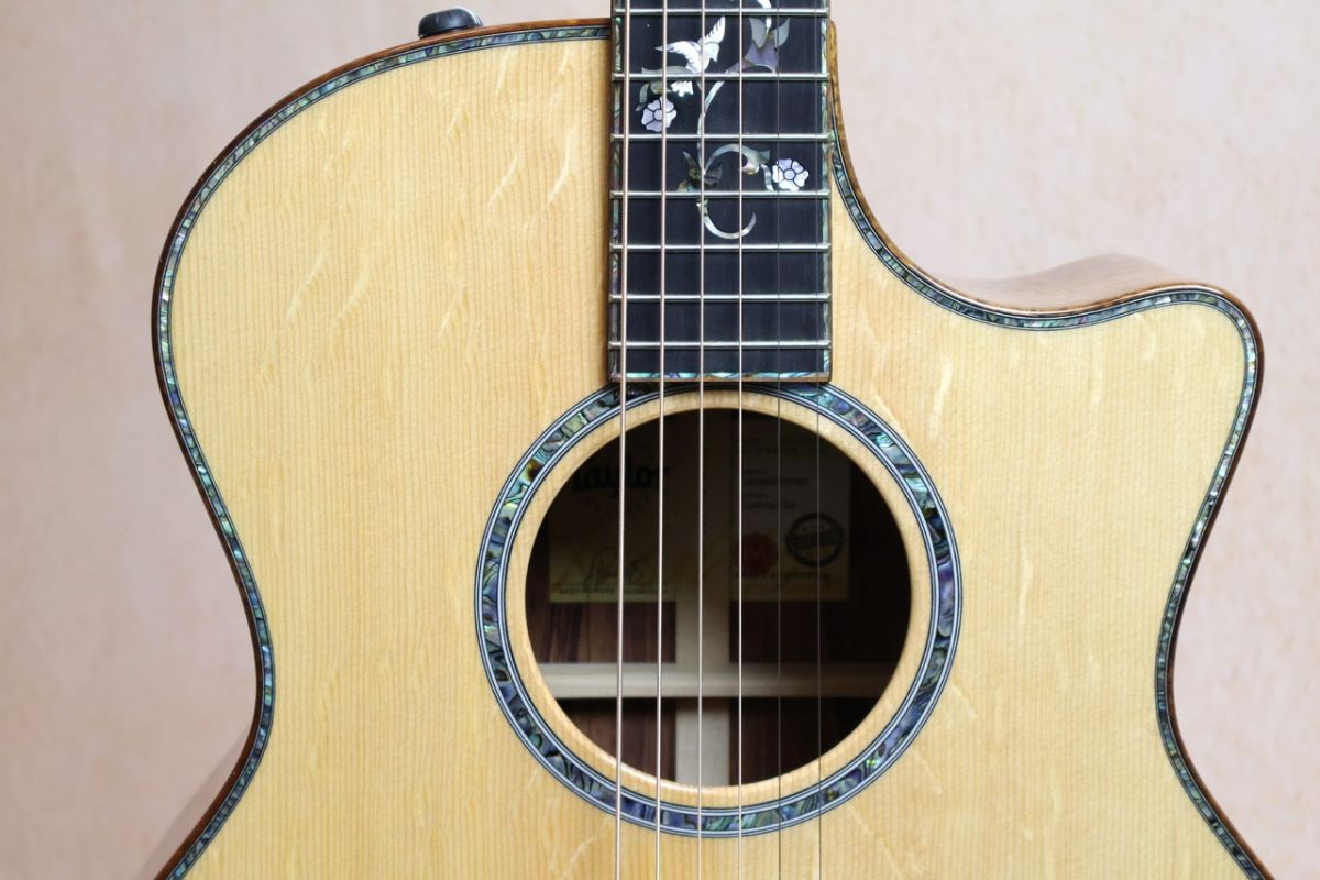 細かなベアクロウのびっしりと詰まった木目が美しいシトカ・スプルースとホンジュラス・ローズウッド特有のやや赤みがかった濃い茶色に濃い杢目が特徴。