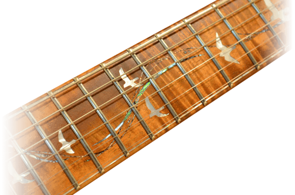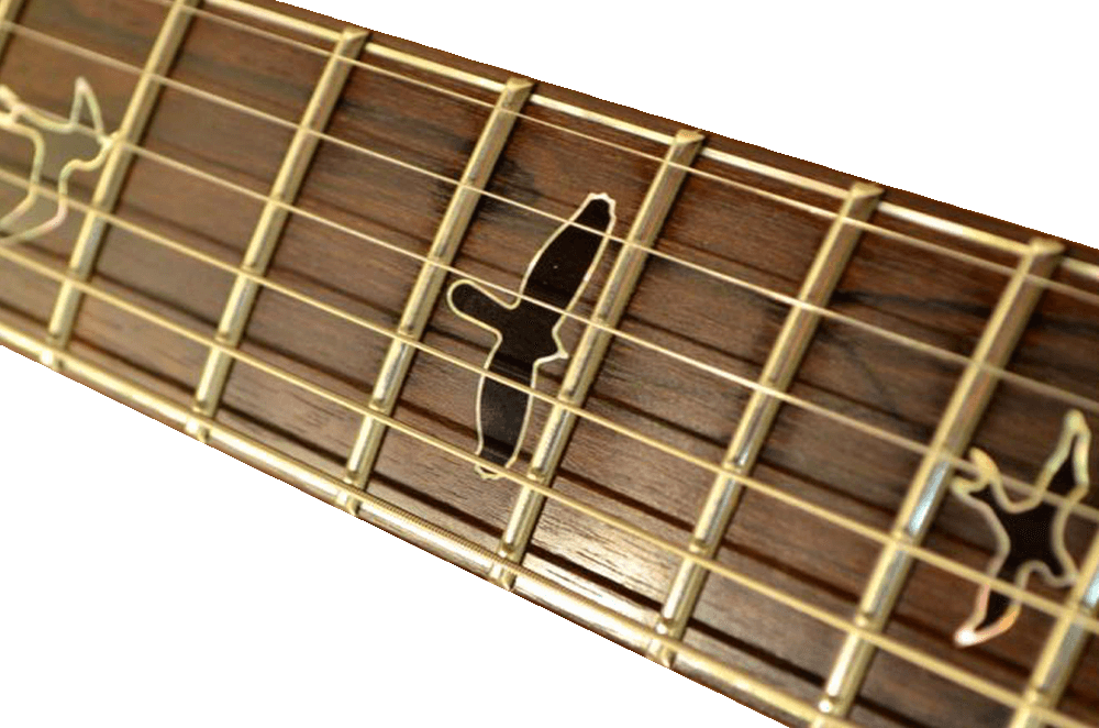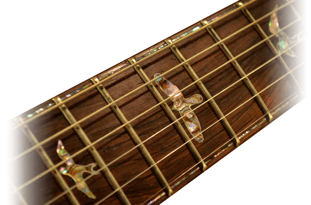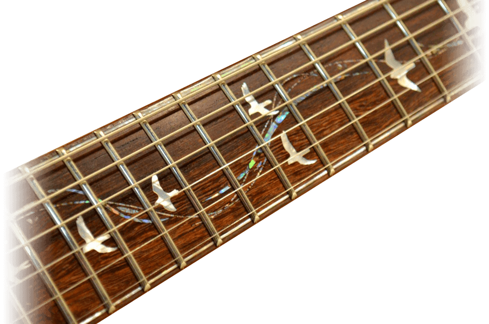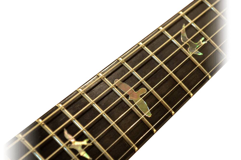Fingerboard Inlay: Mother of pearl 30th Anniversary birds with paua "Vine" inlay as well as mother of pearl purfling