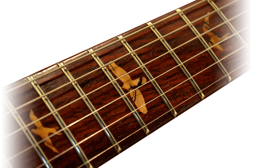 Fingerboard Inlays:Mammoth ivory birds with mother of pearl purfling