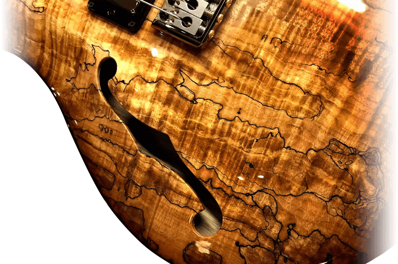 Fingerboard Inlays:Spalted Maple 20th Anniversary birds with gold mother of pearl wisps as well as spalted maple purfling