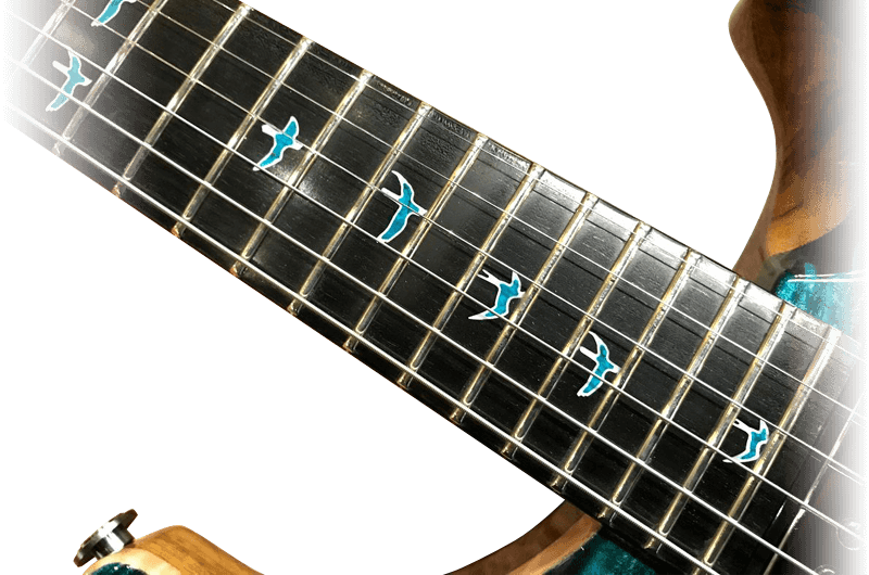 Fingerboard Inlays:Chrysocolla with black vein 30th Anniversary birds with mother of pearl gold mother of pearl outlines