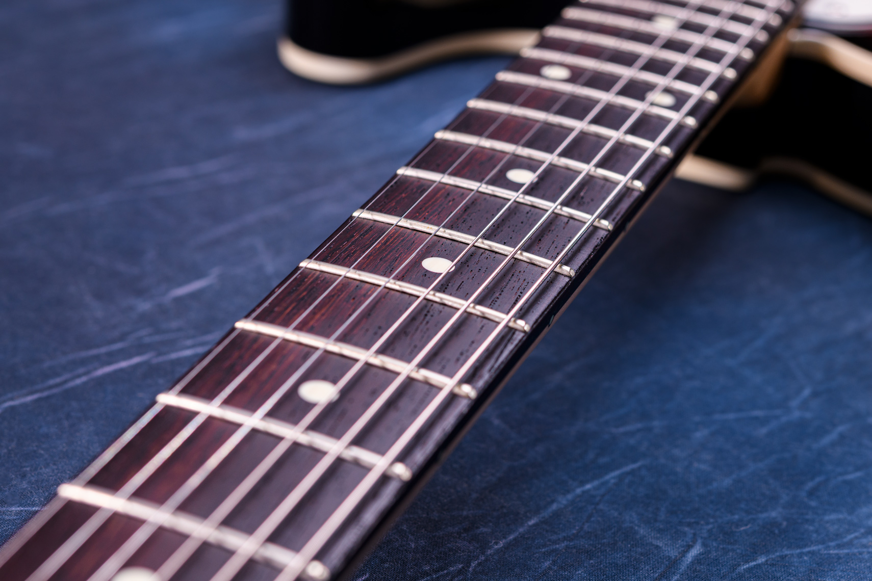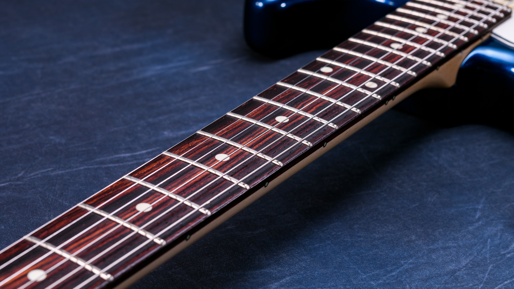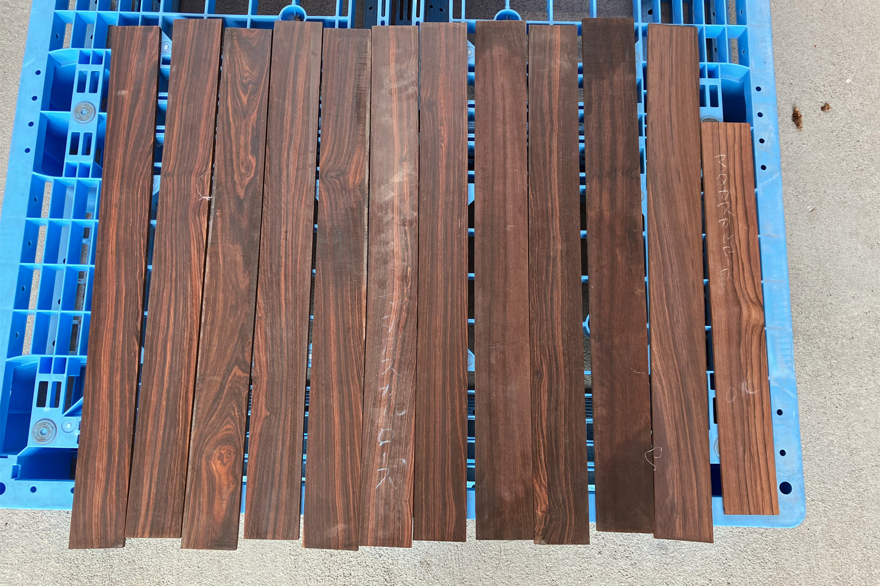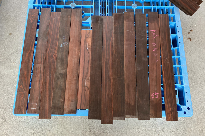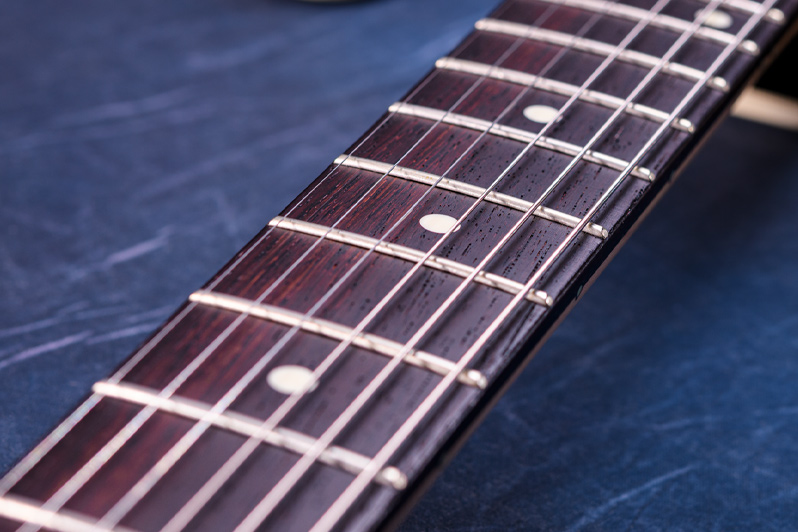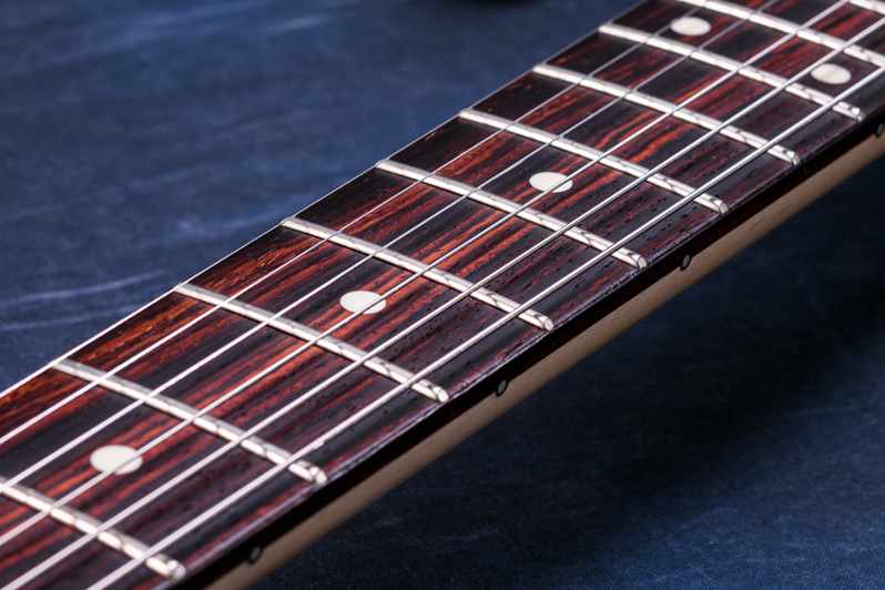 指板材には、担当スタッフが大町工場に赴き選定した希少なマダガスカルローズウッドを採用。ハカランダのようなレスポンスに優れた特性を持ち、通常のローズウッド指板にはない豊かな鳴りが特長です。豊富なストックから目詰まりが良く美しい木目の材のみを選定しています。