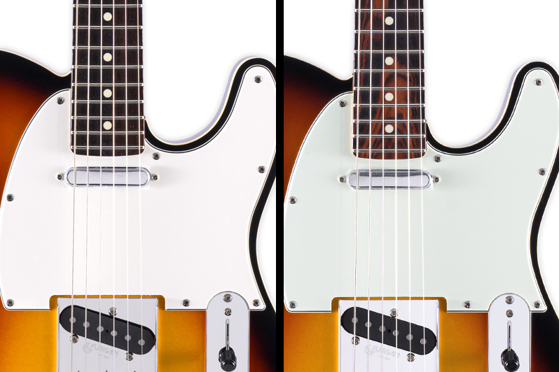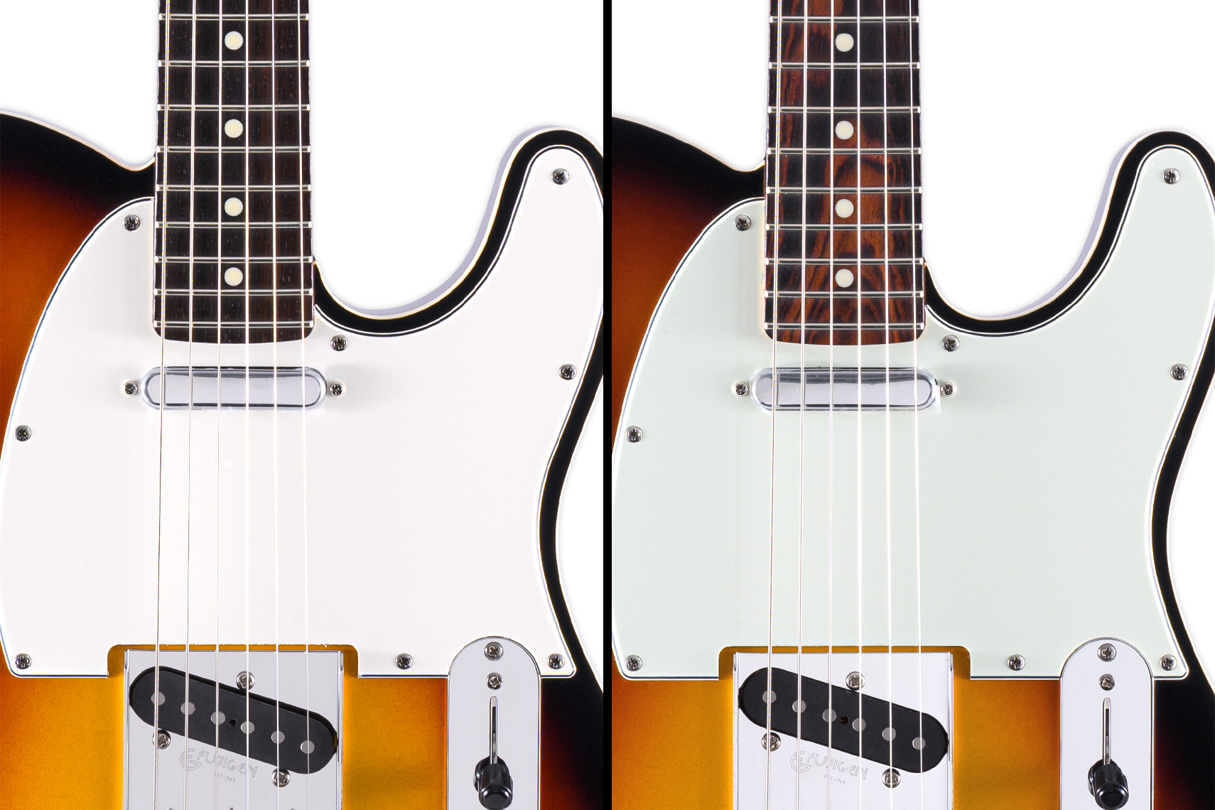 上位機種の NTE210RAH の仕様であるボディバインディングを採用しています。カラーには、黄色味が強く木目の透けない「'63 3-Tone Sunburst」をフィニッシュし、1960年代製のヴィンテージのようなルックスに仕上げました。加えて2種類のカラーのピックガードが付属。過渡期のルックスを、お好みに合わせて選べます。