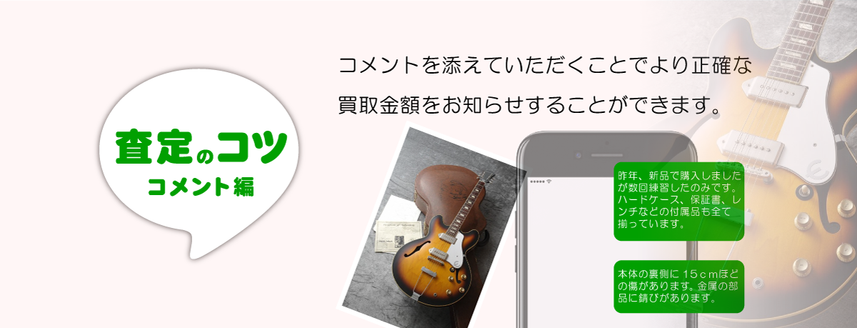 購入した時期や、付属品の有無、傷、ヘコミなど情報をコメントしていただくのも、正確な査定に近づけるコツ!