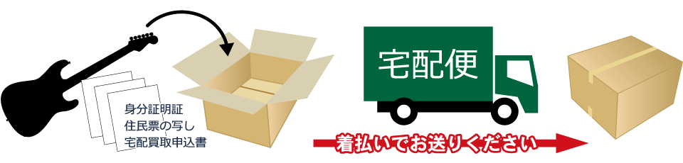 楽器と一緒に身分証明書(運転免許証など)のコピーと住民票の写し(コピー不可)、宅配買取申込書にご記入の上お送りください。 → 宅配買取申込書(PDF)