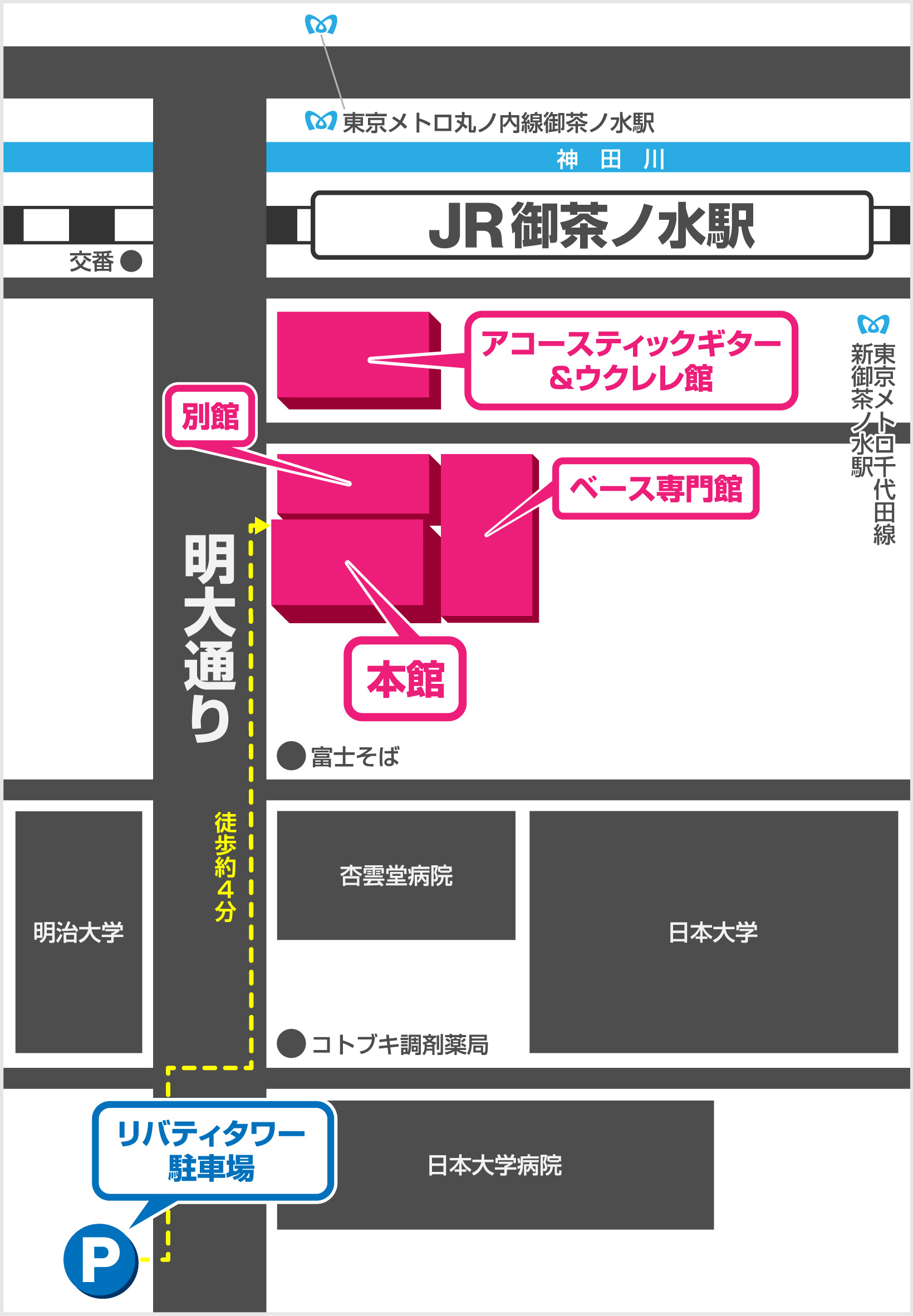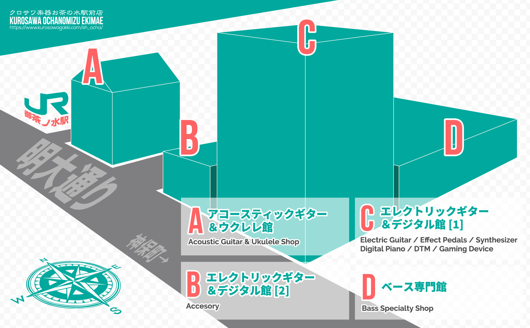 JR御茶ノ水駅・御茶ノ水橋出口、東京メトロ丸ノ内線・御茶ノ水駅からすぐ。"楽器の街・お茶の水" の大型総合楽器店「クロサワ楽器お茶の水駅前店」。エレキギター、ベース、エフェクター、アンプ、アクセサリーなどの楽器用品と、キーボード、シンセサイザー、電子ピアノ、DTM&レコーディング関連商品、ゲーミングデバイスをあつかう【エレクトリックギター&デジタル館】、アコースティックギターおよびウクレレは【アコースティックギター&ウクレレ館】、ベースの事なら【ベース専門館】と、豊富な在庫と各分野の専門スタッフがお客様の楽器ライフを丸ごとサポート!皆様のご来店をスタッフ一同心よりお待ちしております。