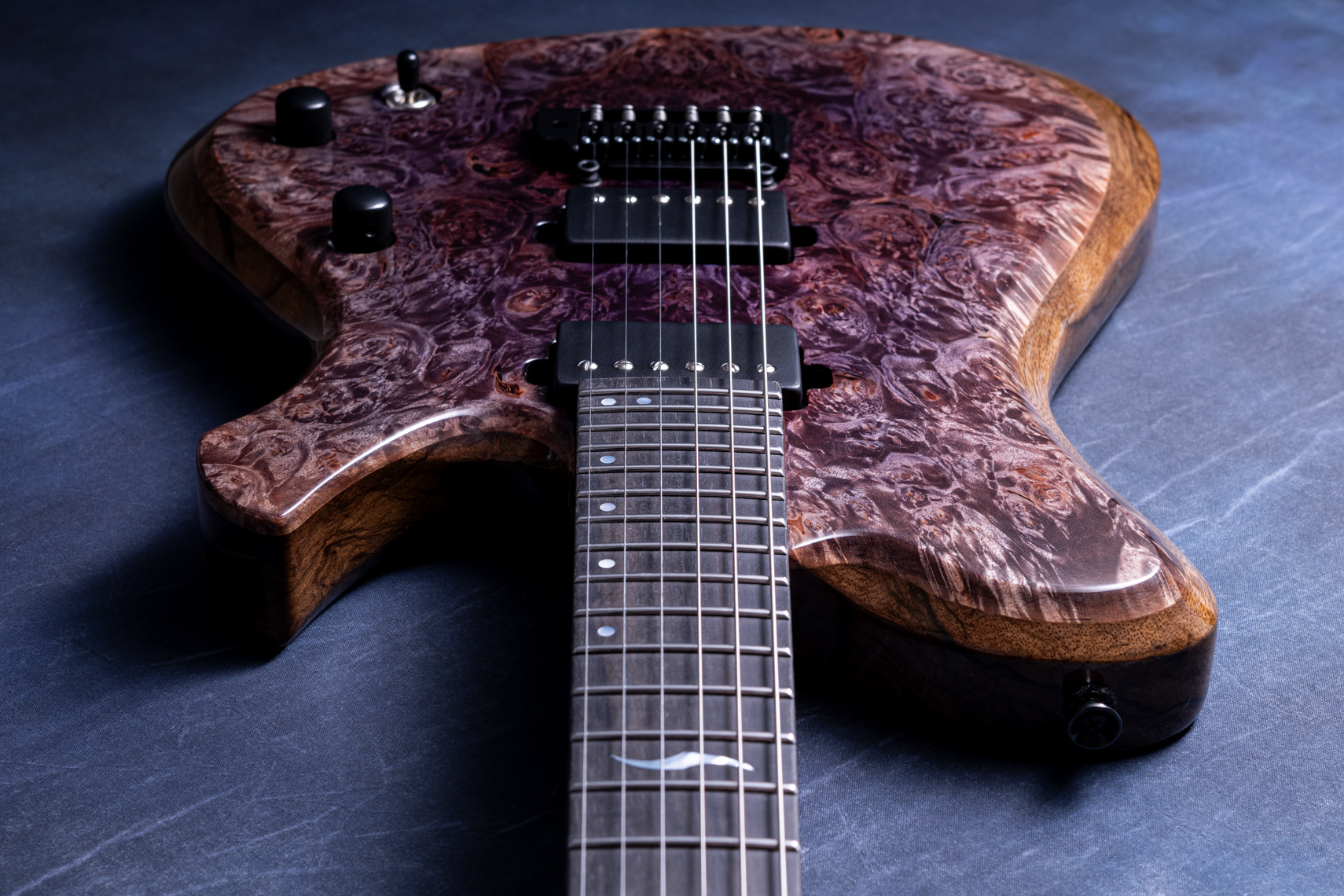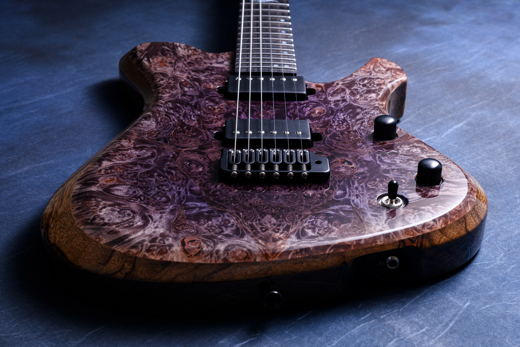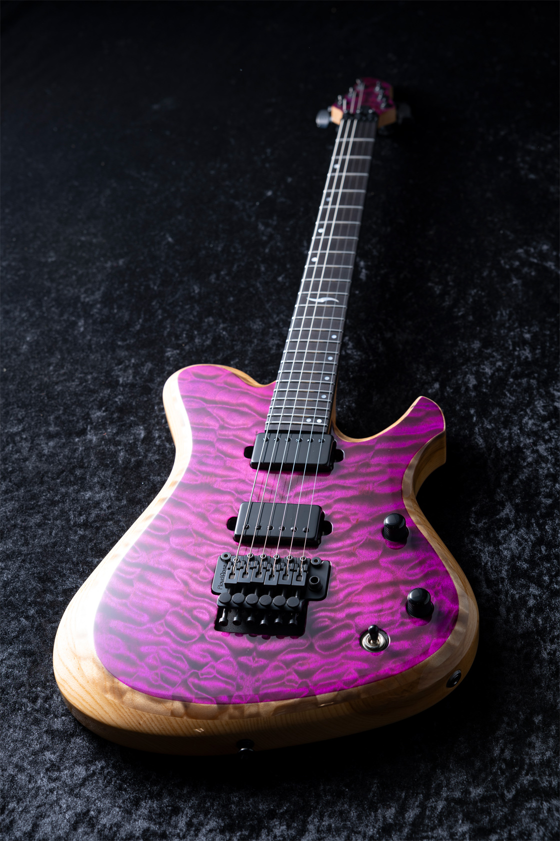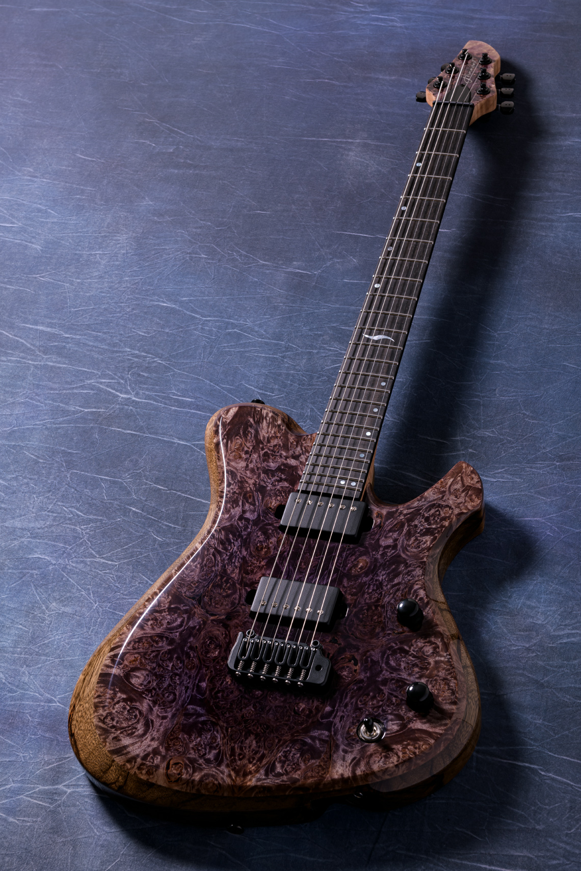 「Impulse」はテレキャスターを彷彿とさせるシングルカットのボディシェイプをオフセットさせ、シャープなアウトラインを追加したデザインです。ルックスの印象を左右するボディトップには厳選されたメイプルバールが使用され、パープルステインによる妖艶なカラーリングに染められた一本。