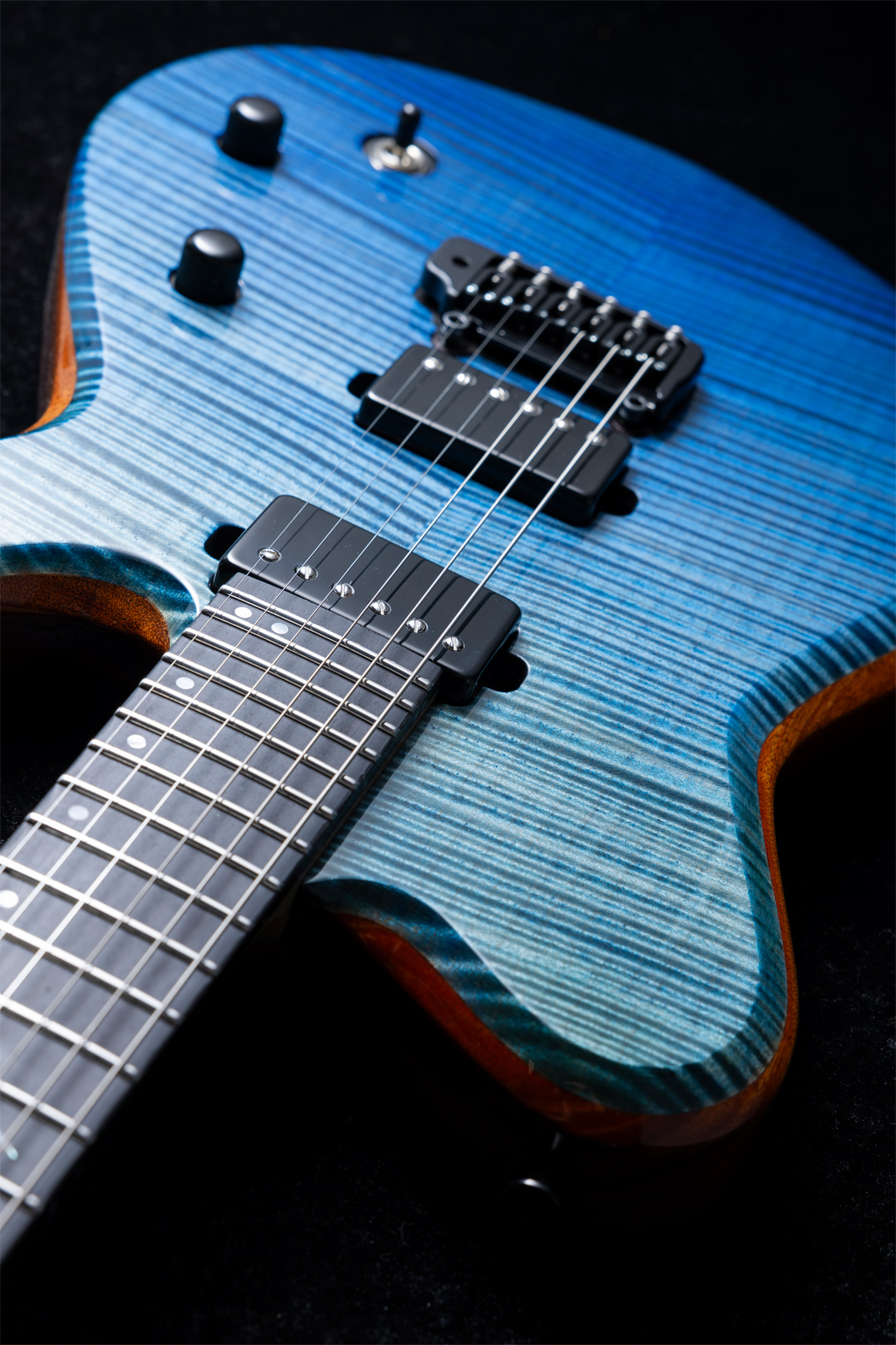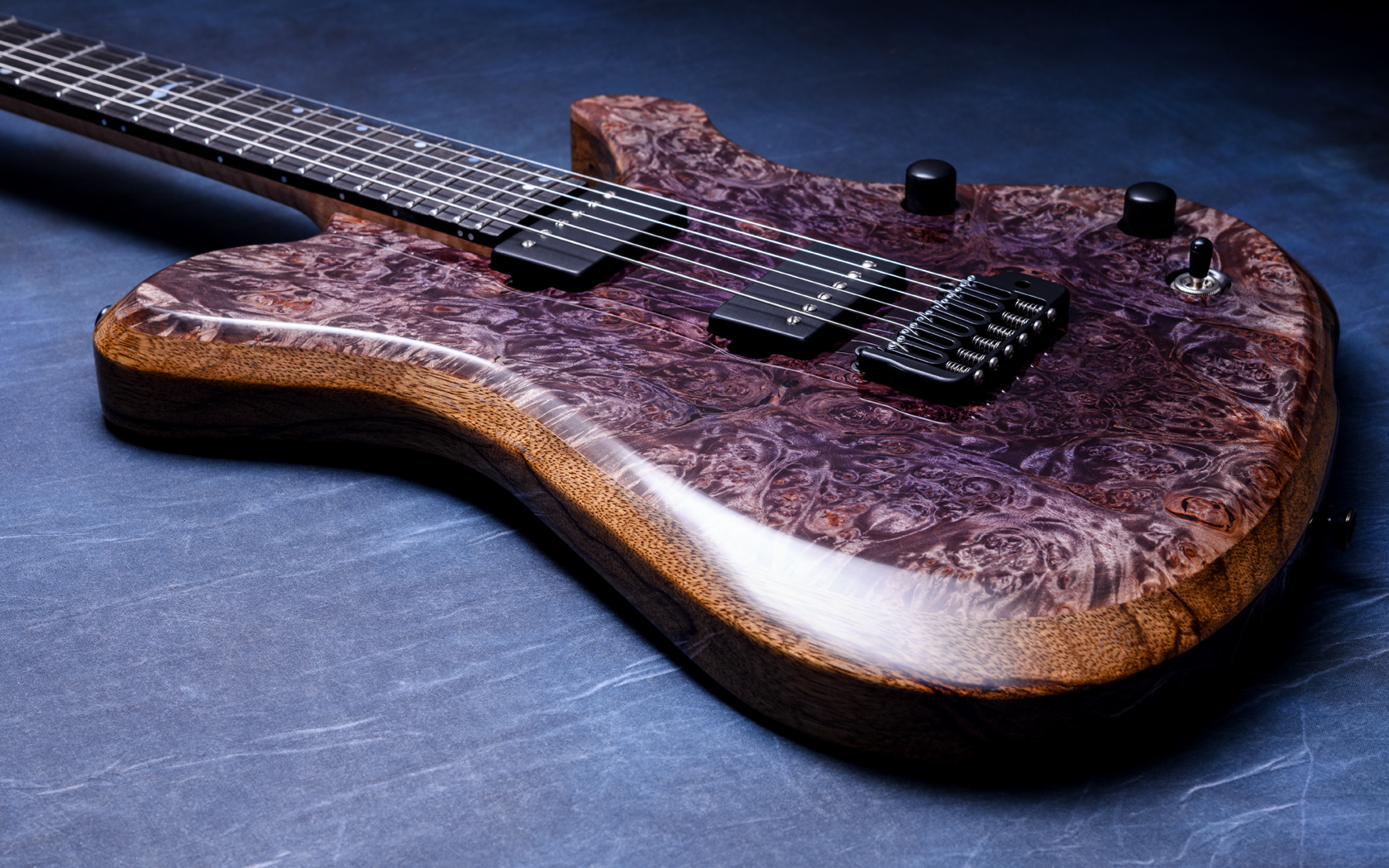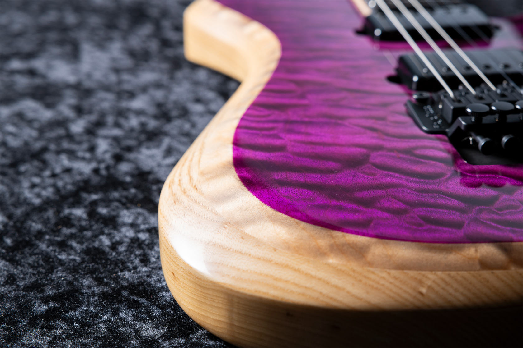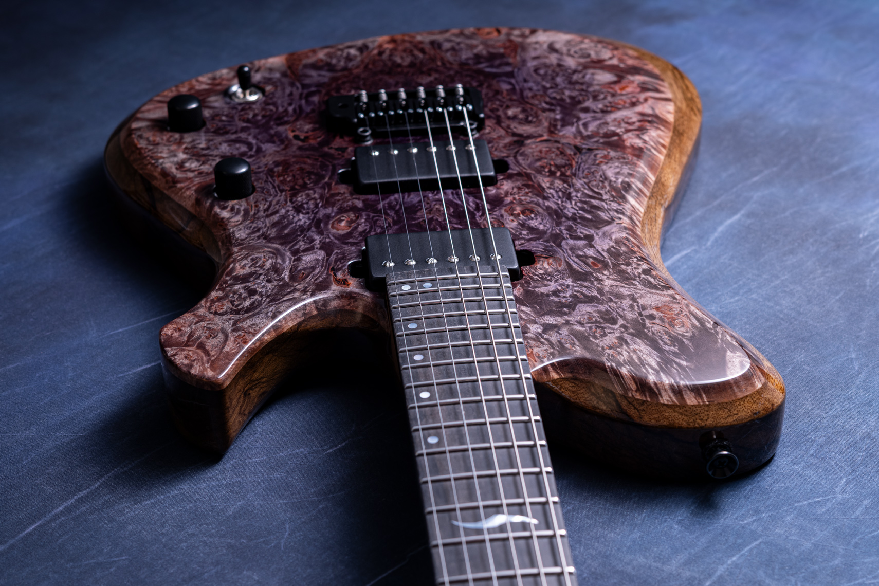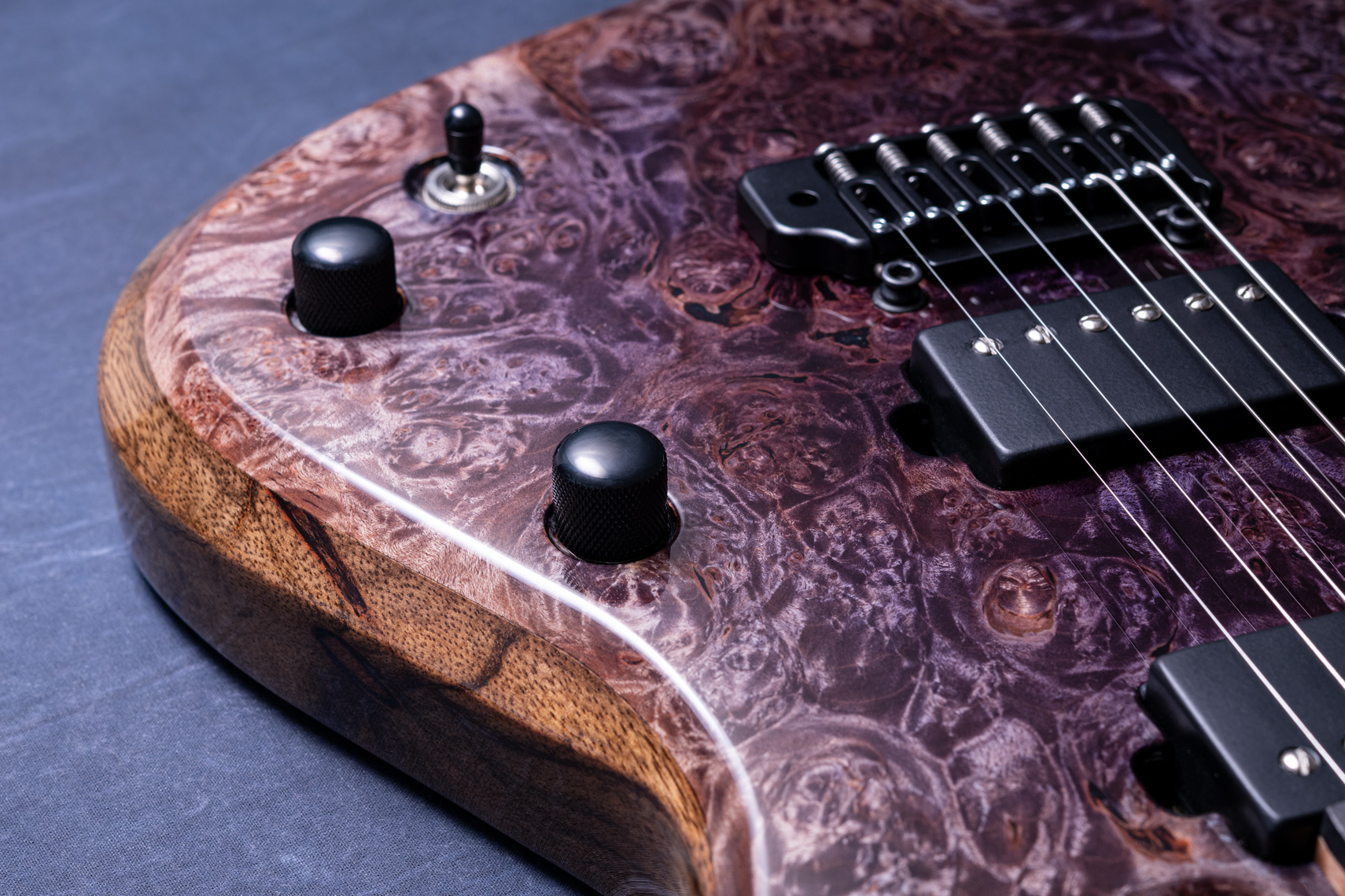 「Impulse」はテレキャスターを彷彿とさせるシングルカットのボディシェイプをオフセットさせ、シャープなアウトラインを追加したデザインです。ルックスの印象を左右するボディトップには厳選されたメイプルバールが使用され、パープルステインによる妖艶なカラーリングに染められた一本。