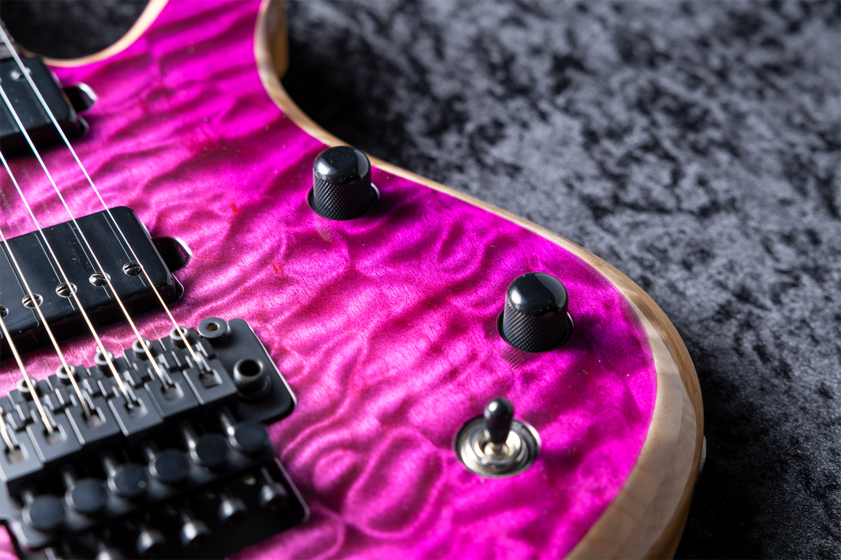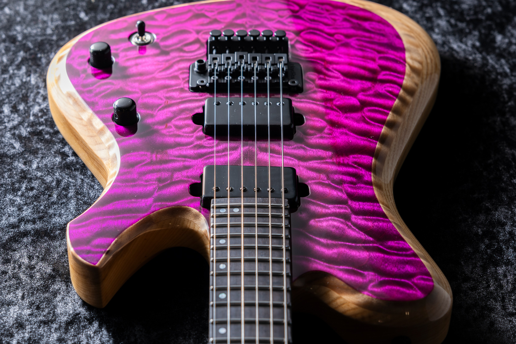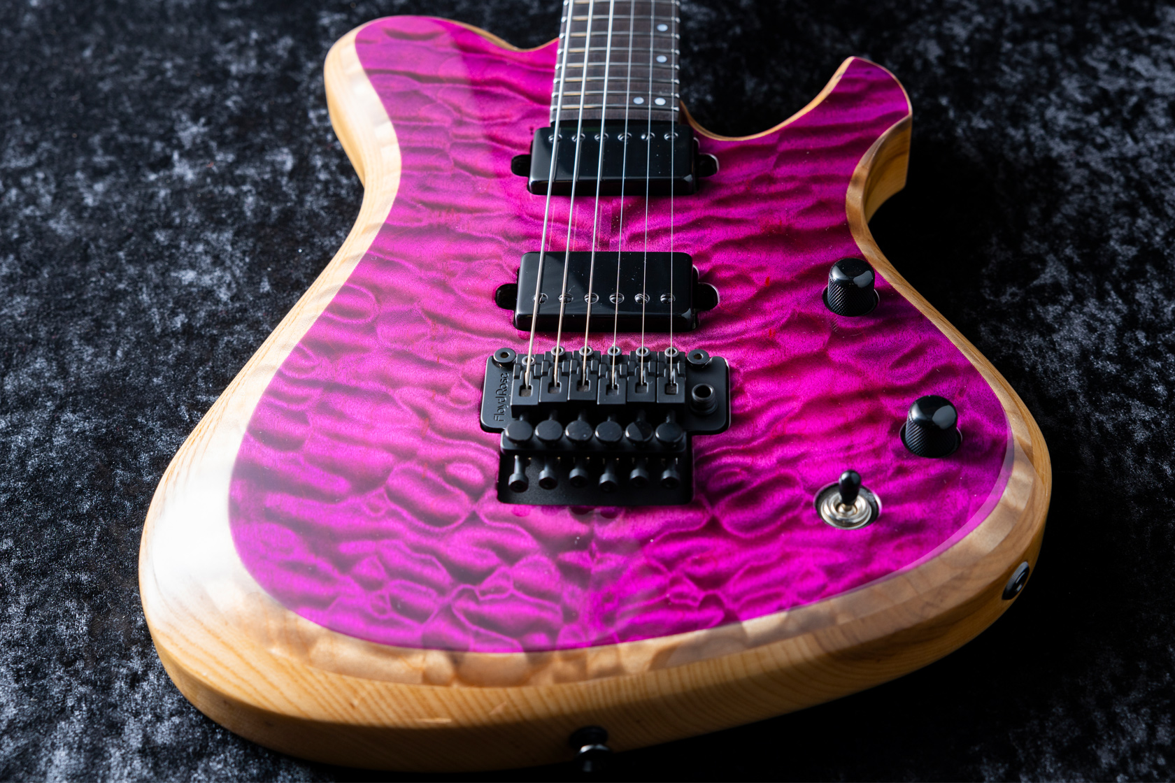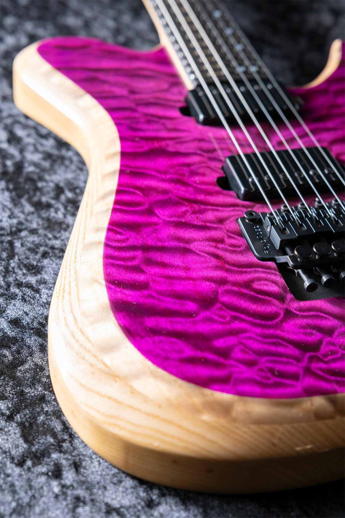 「Impulse」はテレキャスターを彷彿とさせるシングルカットのボディシェイプをオフセットさせ、シャープなアウトラインを追加したデザインです。ルックスの印象を左右するボディトップには厳選されたメイプルバールが使用され、パープルステインによる妖艶なカラーリングに染められた一本。