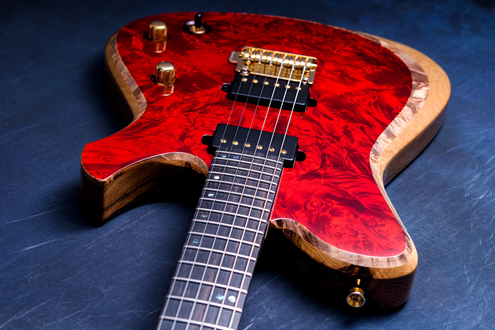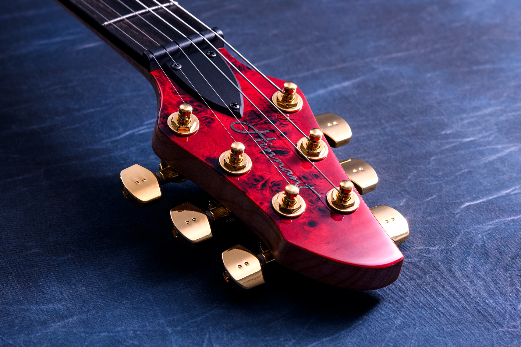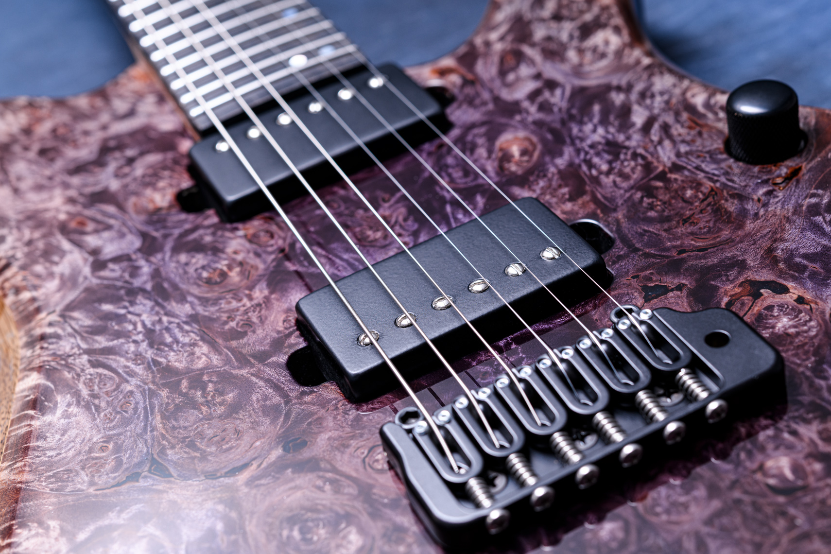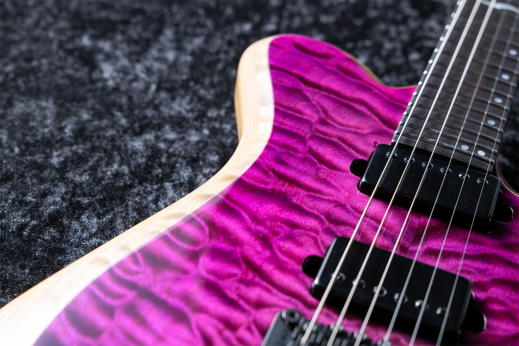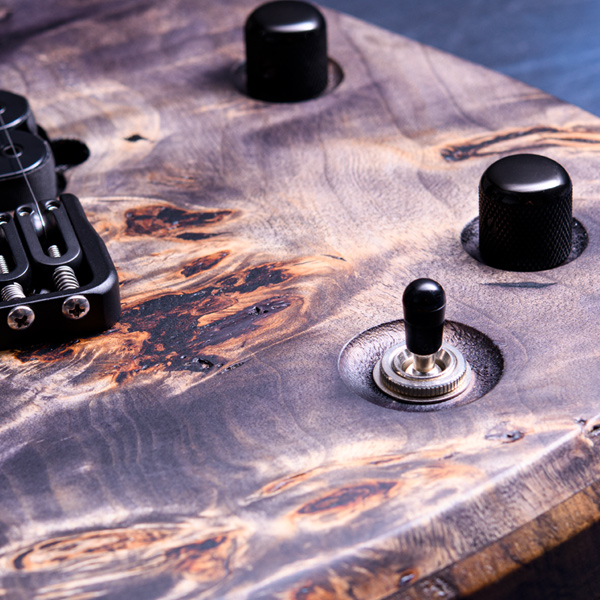 「Impulse」はテレキャスターを彷彿とさせるシングルカットのボディシェイプをオフセットさせ、シャープなアウトラインを追加したデザインです。ルックスの印象を左右するボディトップには厳選されたメイプルバールが使用され、パープルステインによる妖艶なカラーリングに染められた一本。