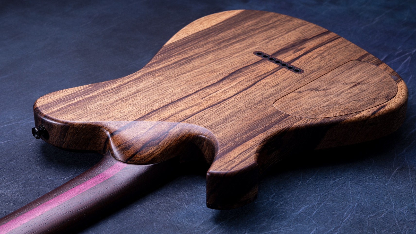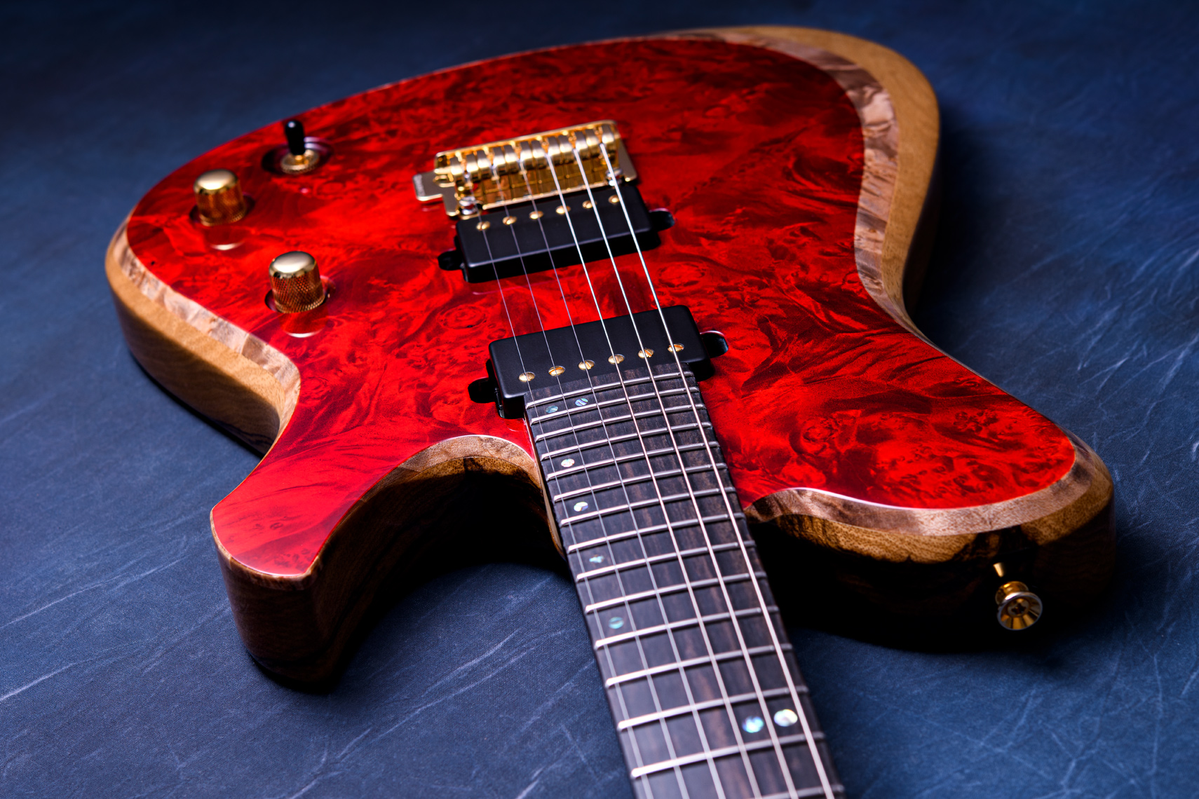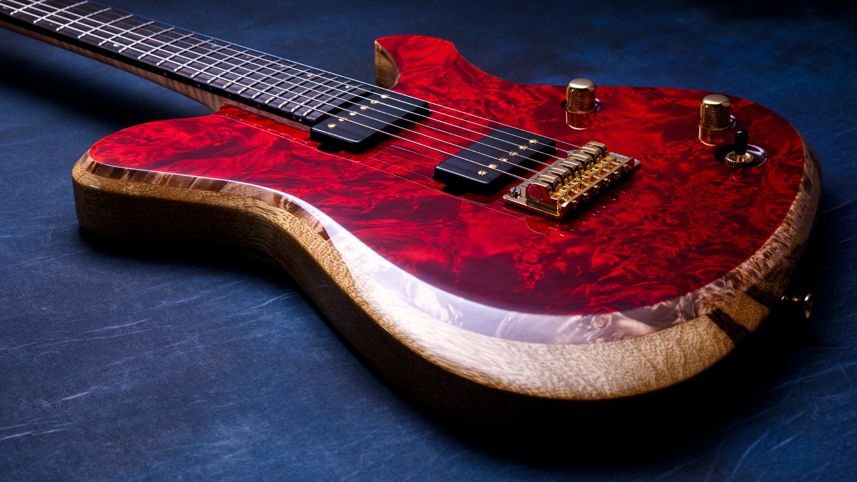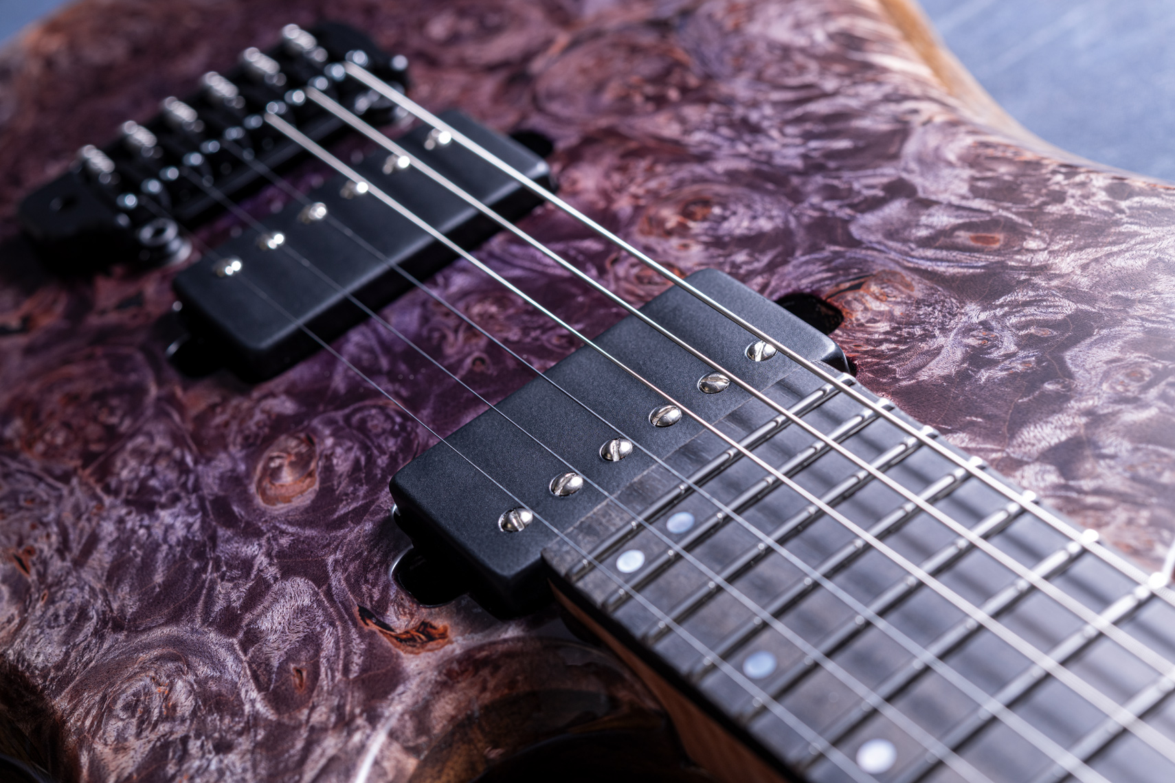 「Impulse」はテレキャスターを彷彿とさせるシングルカットのボディシェイプをオフセットさせ、シャープなアウトラインを追加したデザインです。ルックスの印象を左右するボディトップには厳選されたメイプルバールが使用され、パープルステインによる妖艶なカラーリングに染められた一本。