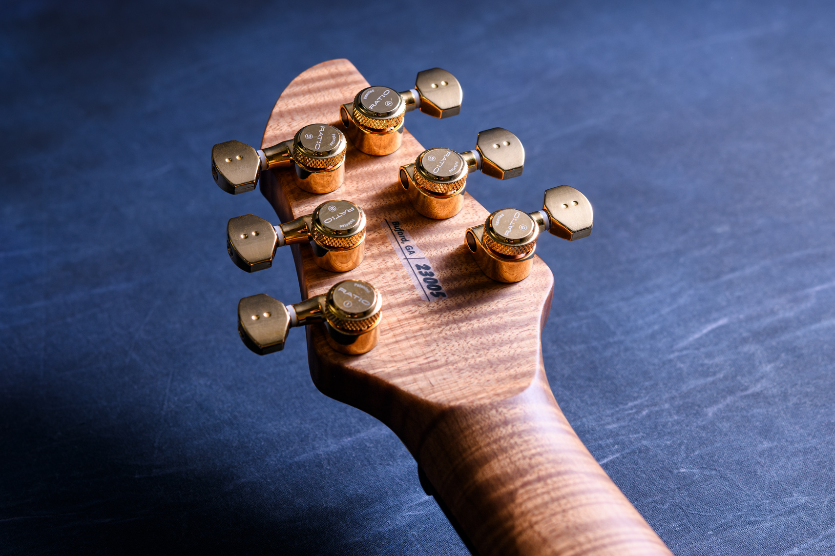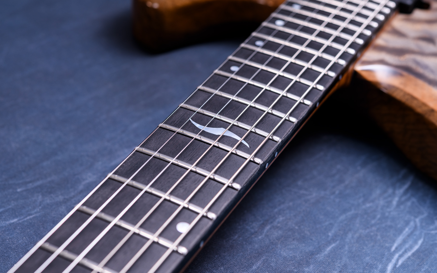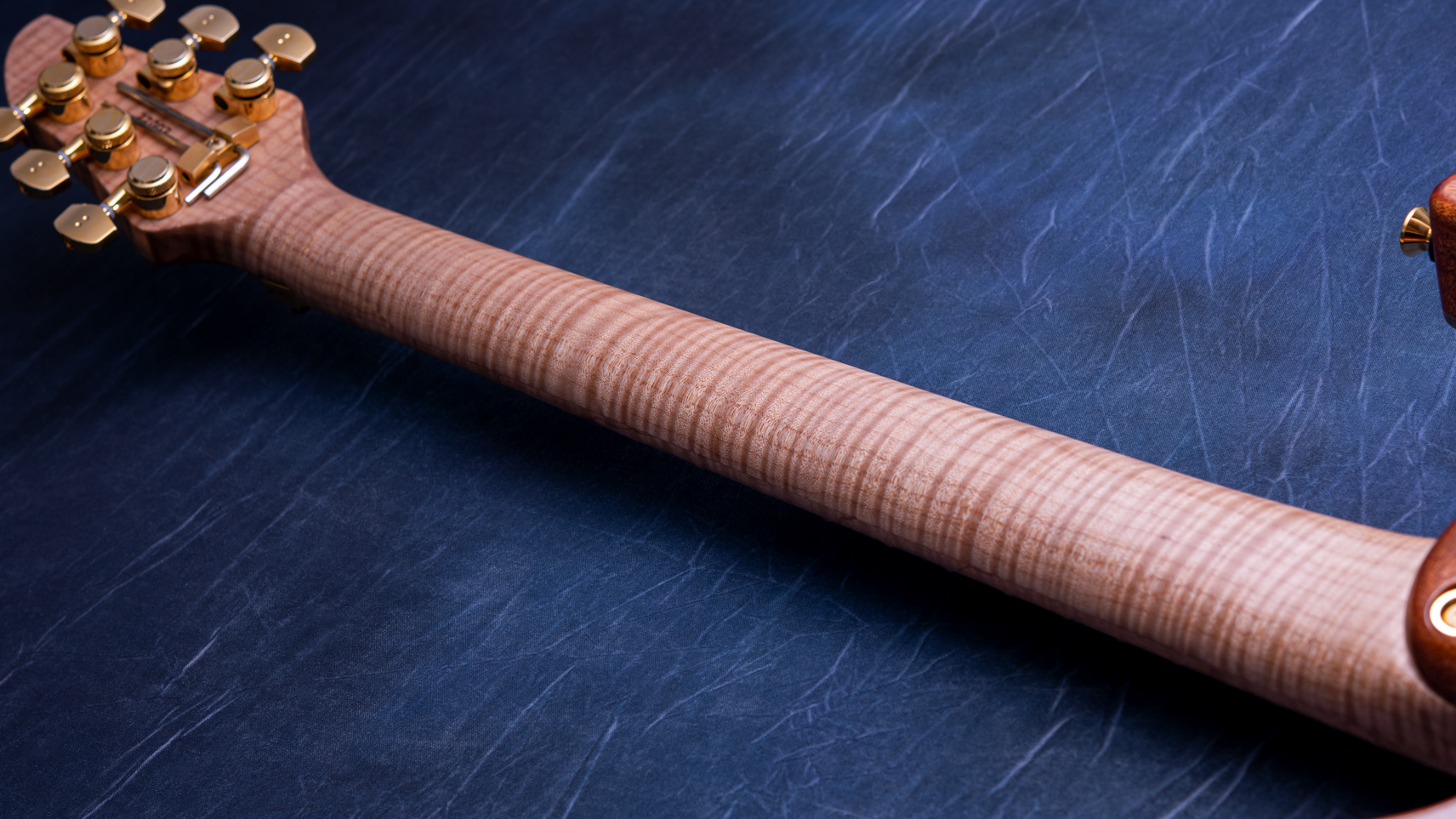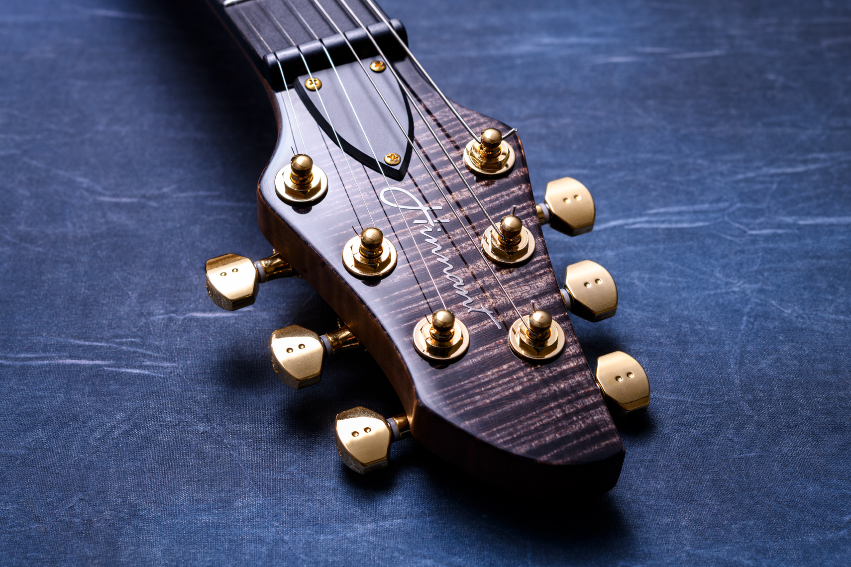 ネック材にも良質な5Aフレイムメイプルネックをセレクト。演奏時のフィーリングを決定づけるフィンガーボードには黒く良質なエボニーが使用されております。大手のメーカーではこのような均一に黒く良質なエボニー材を一定数用意することが難しく、製品に使用することが困難となっていますが、小規模かつ完全ハンドメイドで製作しているからこそ、このような希少な材も出し惜しみせず使用することが可能なのです。