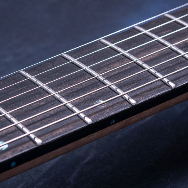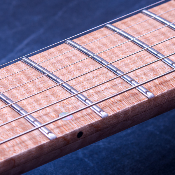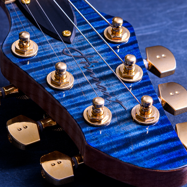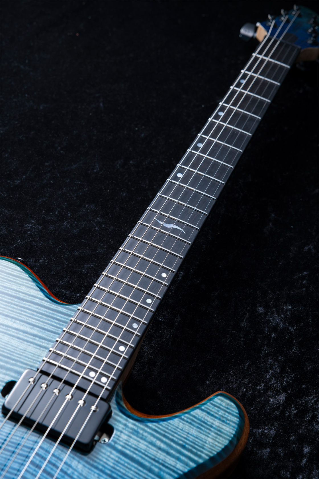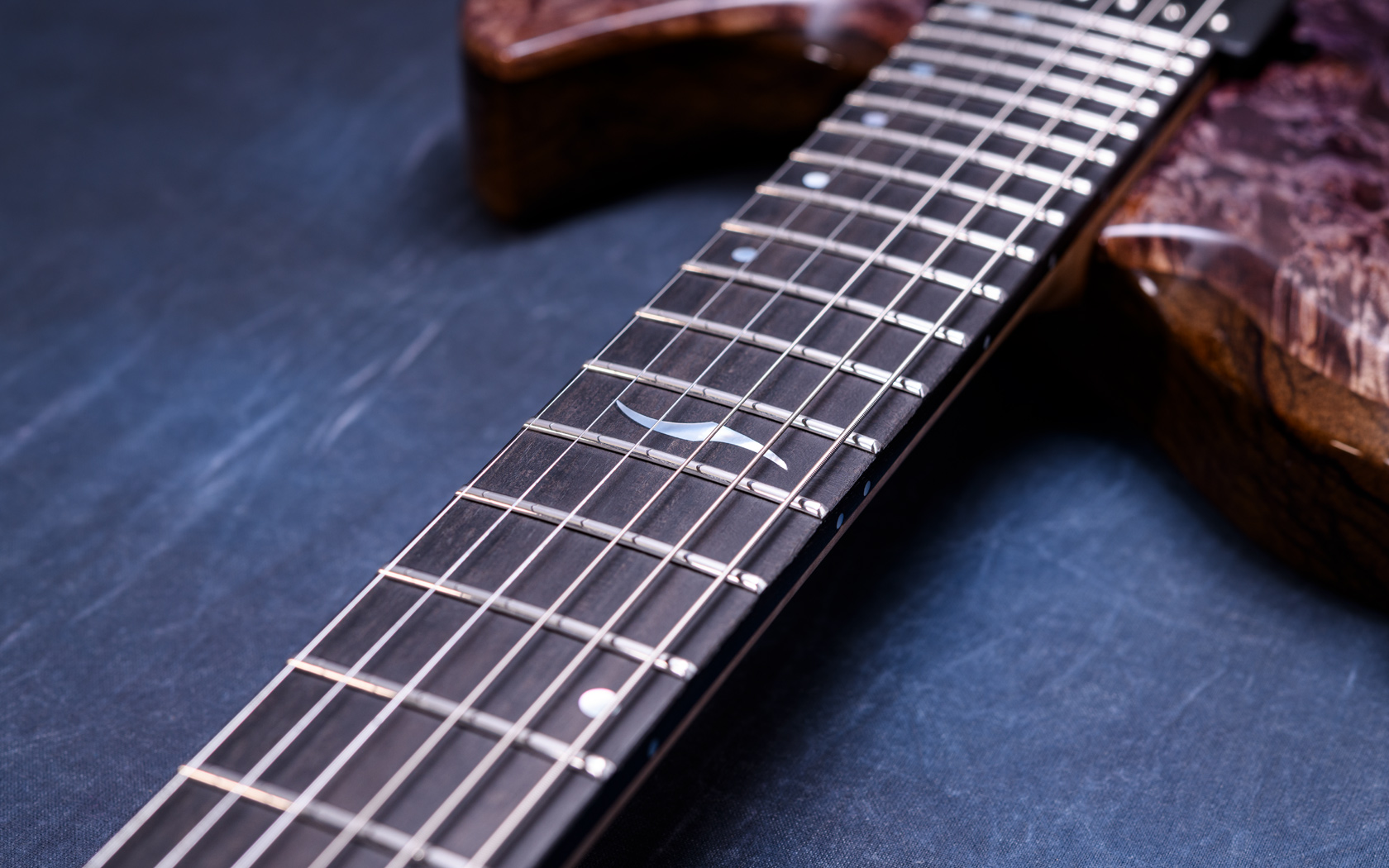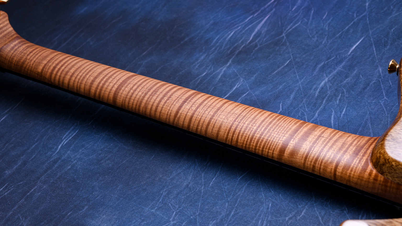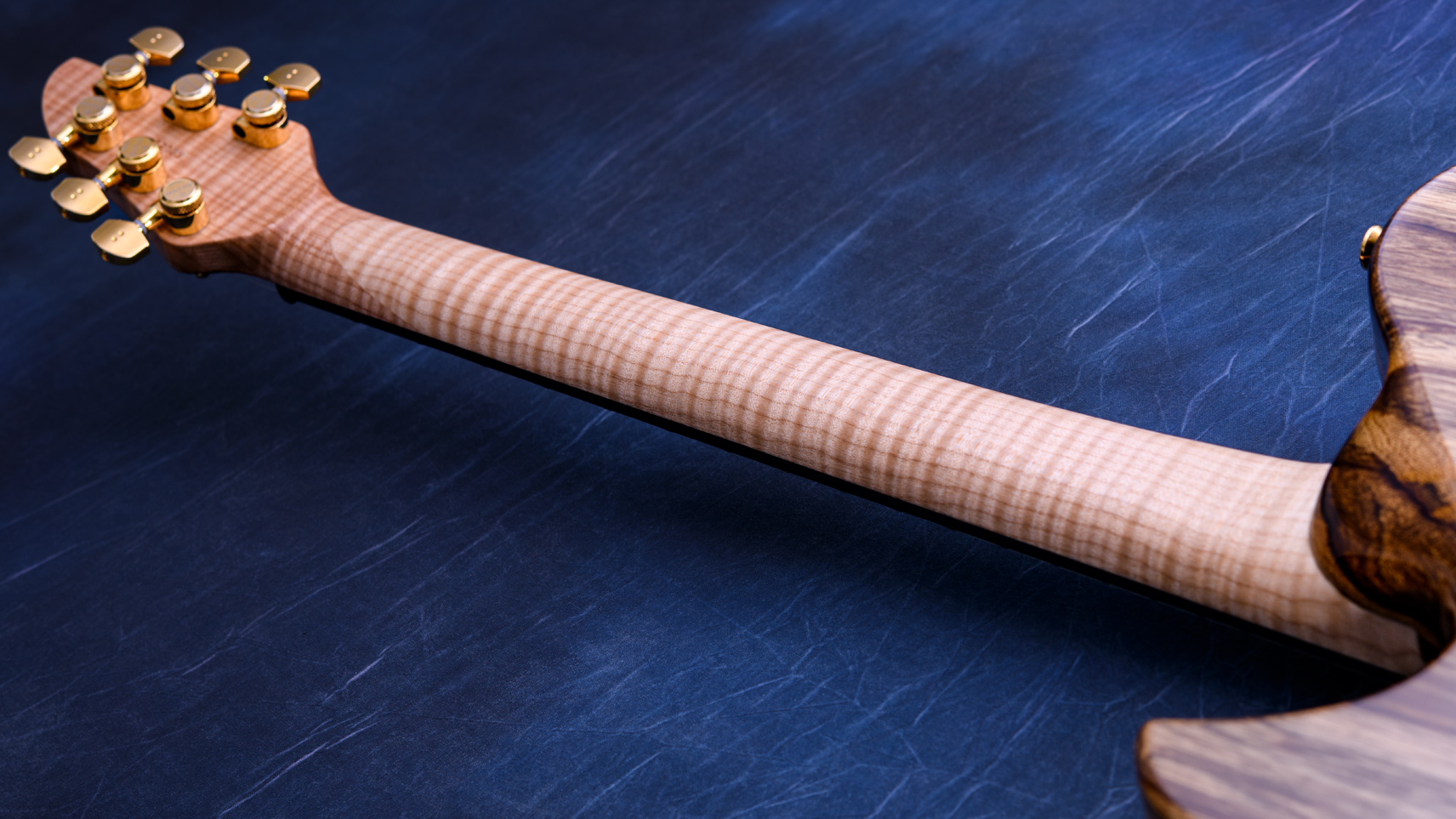 ネック材にも良質な5Aフレイムメイプルネックをセレクト。演奏時のフィーリングを決定づけるフィンガーボードには黒く良質なエボニーが使用されております。大手のメーカーではこのような均一に黒く良質なエボニー材を一定数用意することが難しく、製品に使用することが困難となっていますが、小規模かつ完全ハンドメイドで製作しているからこそ、このような希少な材も出し惜しみせず使用することが可能なのです。