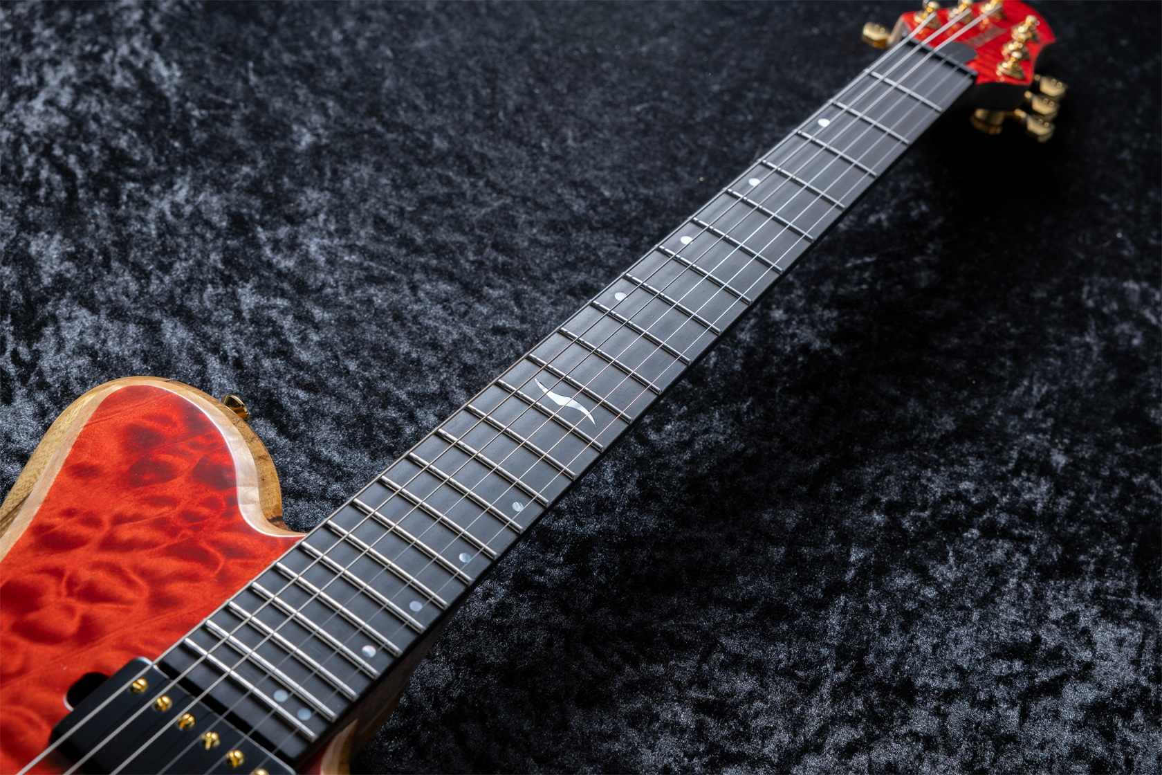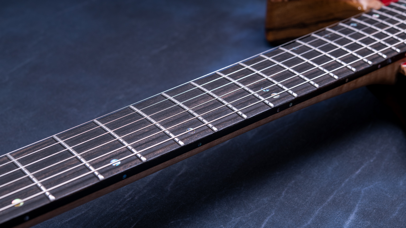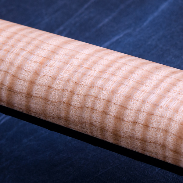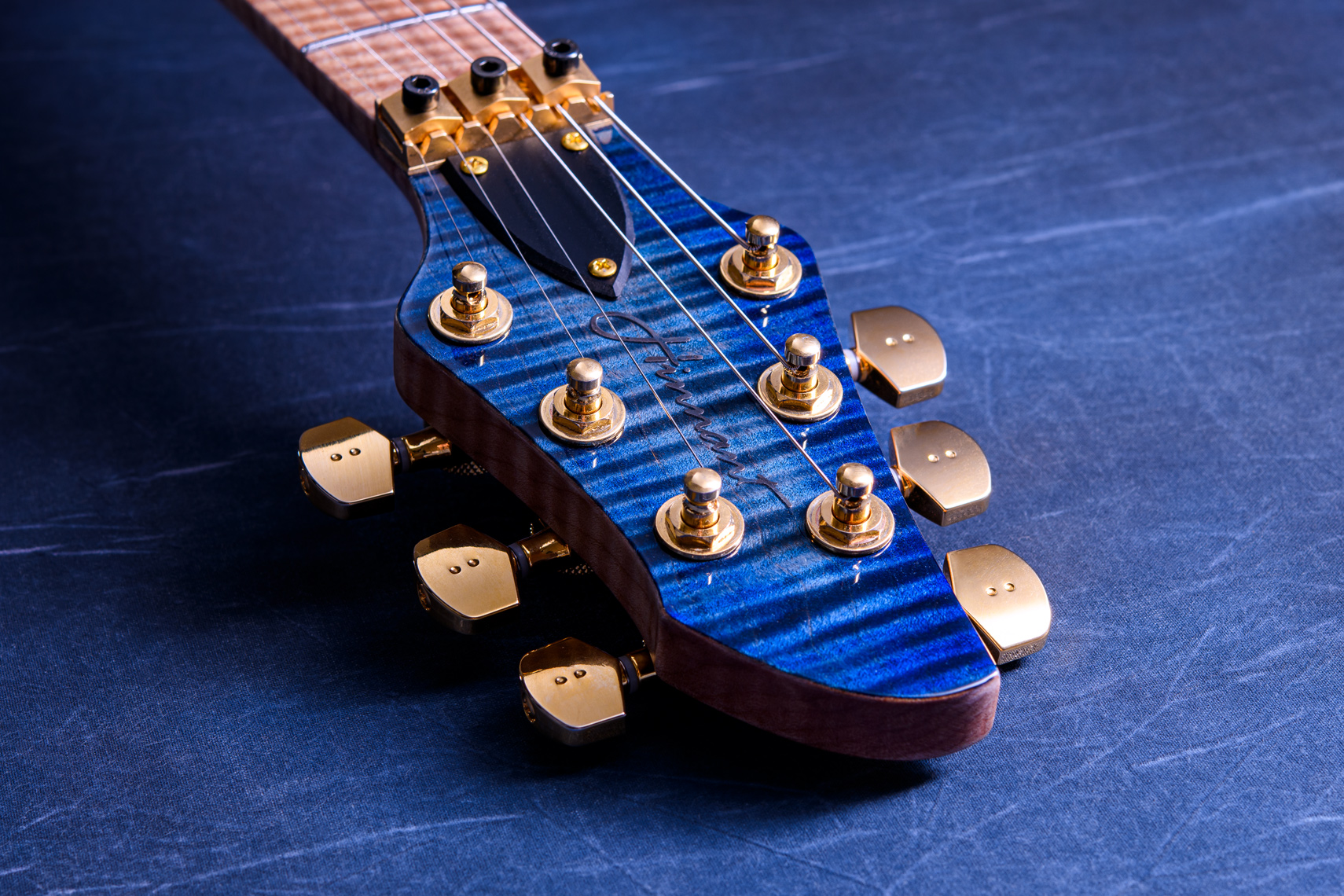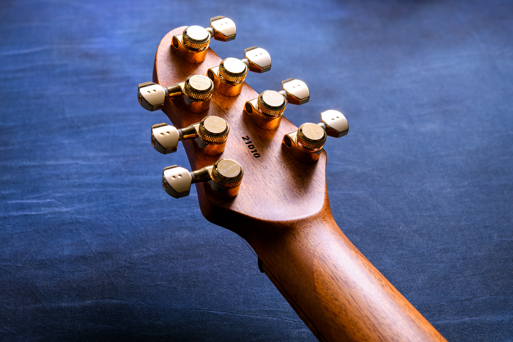 ネック材にも良質な5Aフレイムメイプルネックをセレクト。演奏時のフィーリングを決定づけるフィンガーボードには黒く良質なエボニーが使用されております。大手のメーカーではこのような均一に黒く良質なエボニー材を一定数用意することが難しく、製品に使用することが困難となっていますが、小規模かつ完全ハンドメイドで製作しているからこそ、このような希少な材も出し惜しみせず使用することが可能なのです。