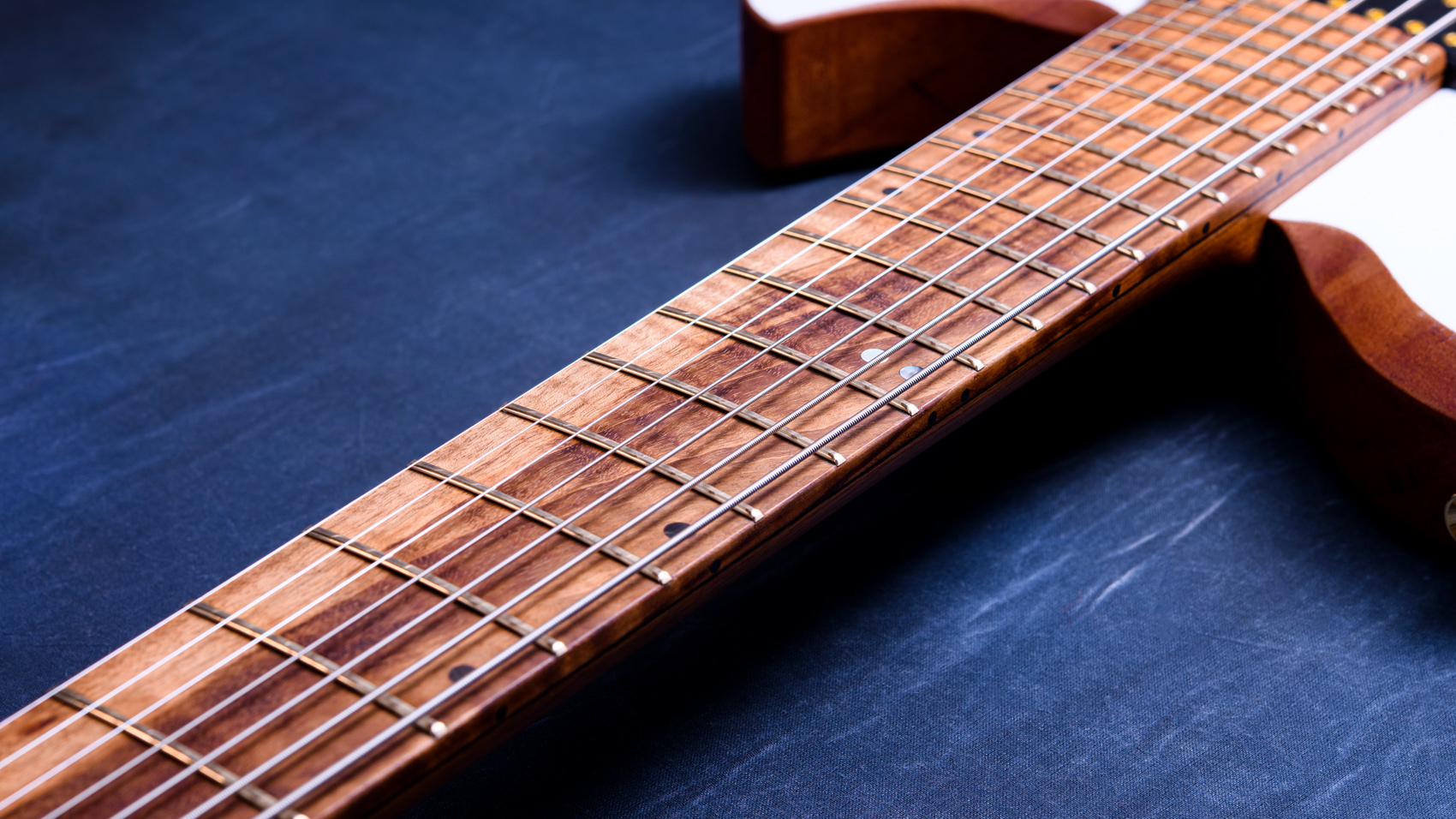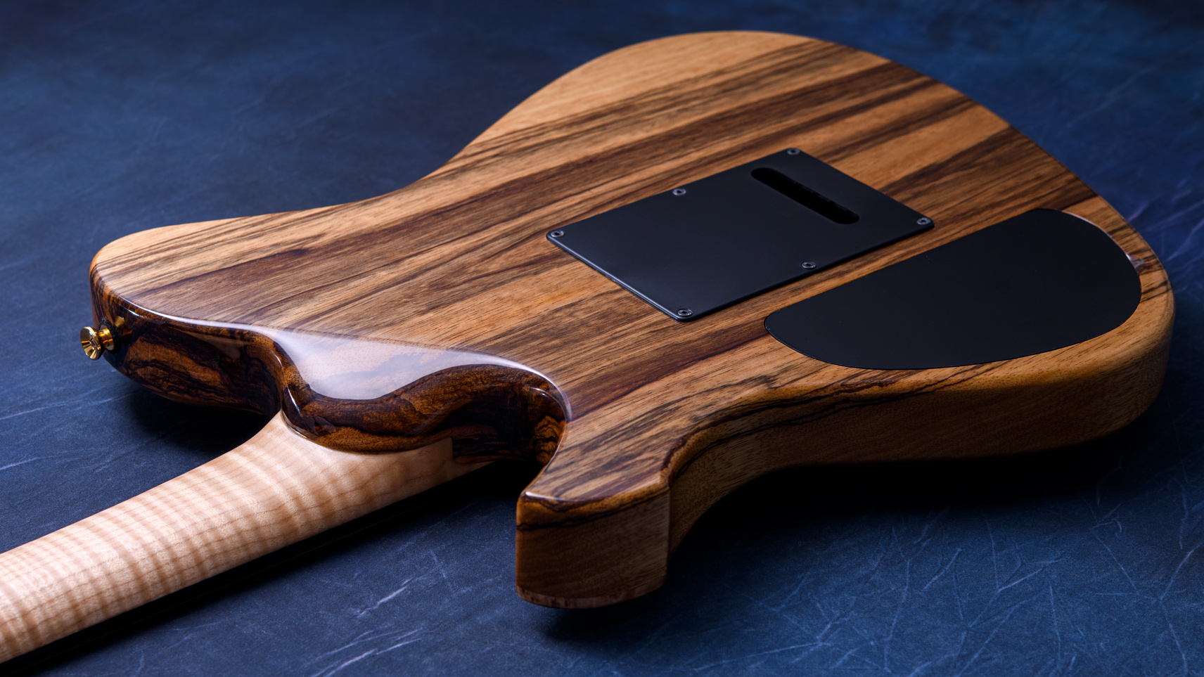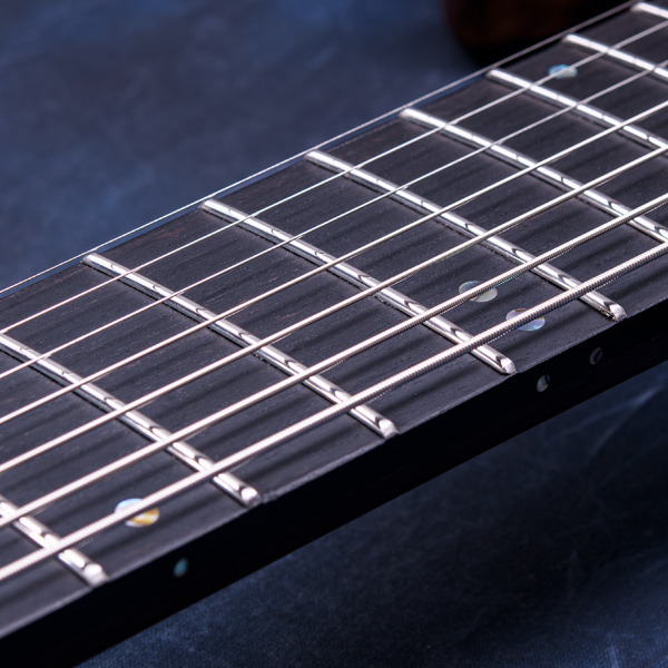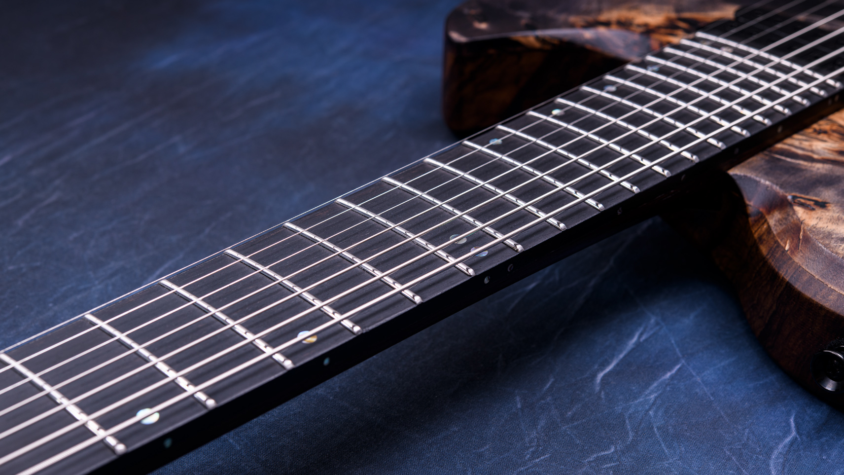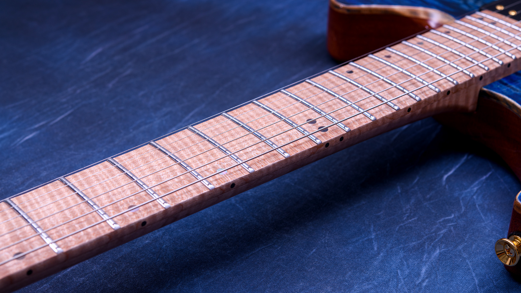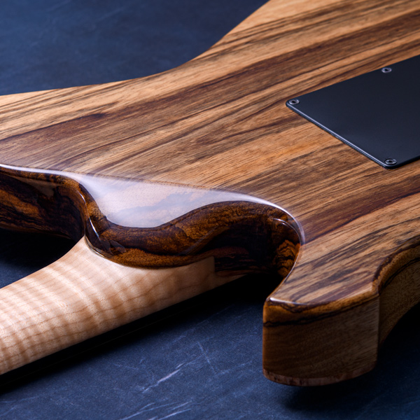 ネック材にも良質な5Aフレイムメイプルネックをセレクト。演奏時のフィーリングを決定づけるフィンガーボードには黒く良質なエボニーが使用されております。大手のメーカーではこのような均一に黒く良質なエボニー材を一定数用意することが難しく、製品に使用することが困難となっていますが、小規模かつ完全ハンドメイドで製作しているからこそ、このような希少な材も出し惜しみせず使用することが可能なのです。