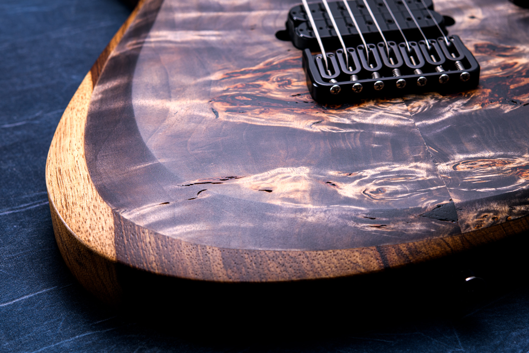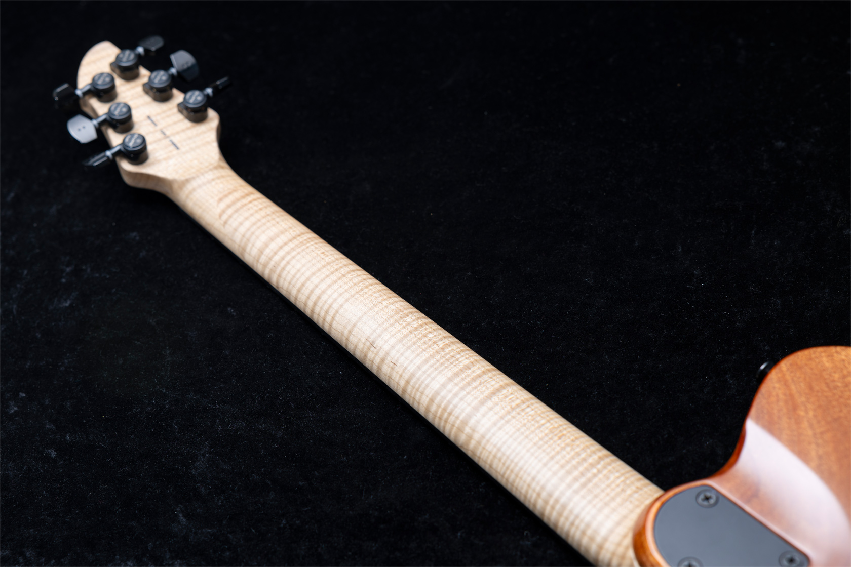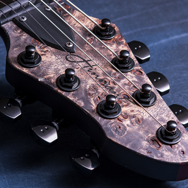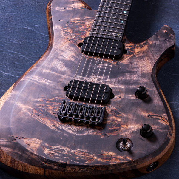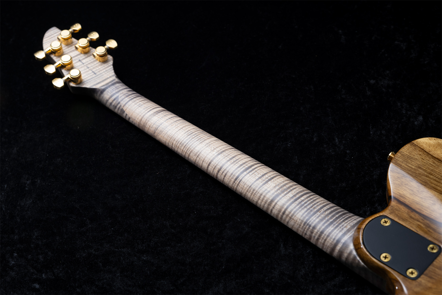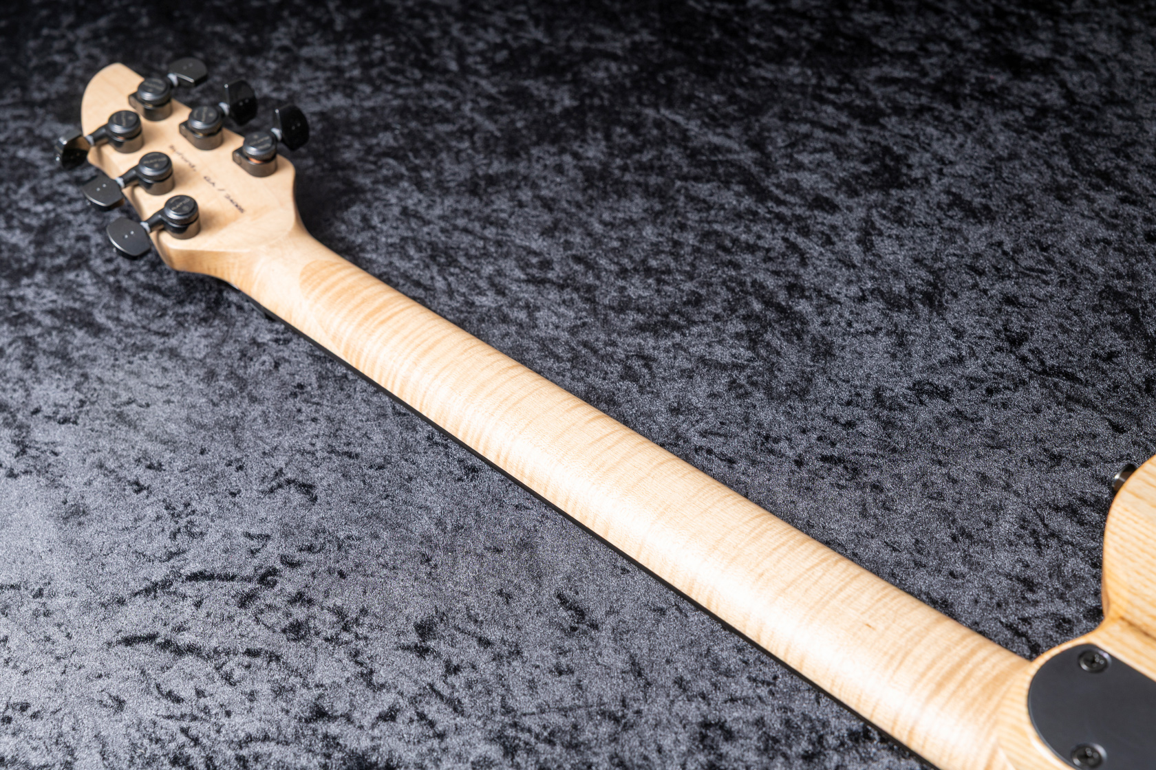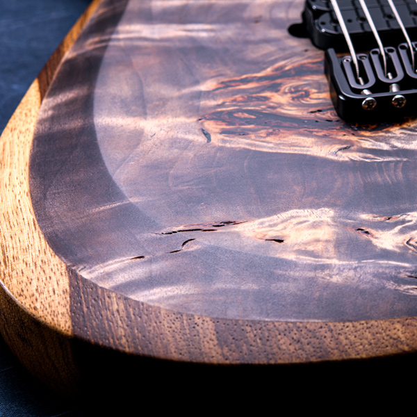 5Aグレードのフレイムメイプルネックに黒々としたエボニーの指板材を使用。ボディは中音域特性の良いブラックリンバに担当者がセレクトしたバールメイプルをラミネイト。
