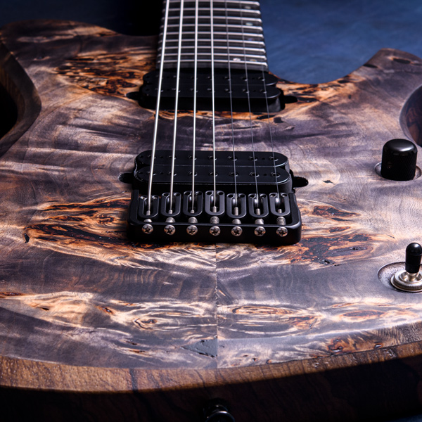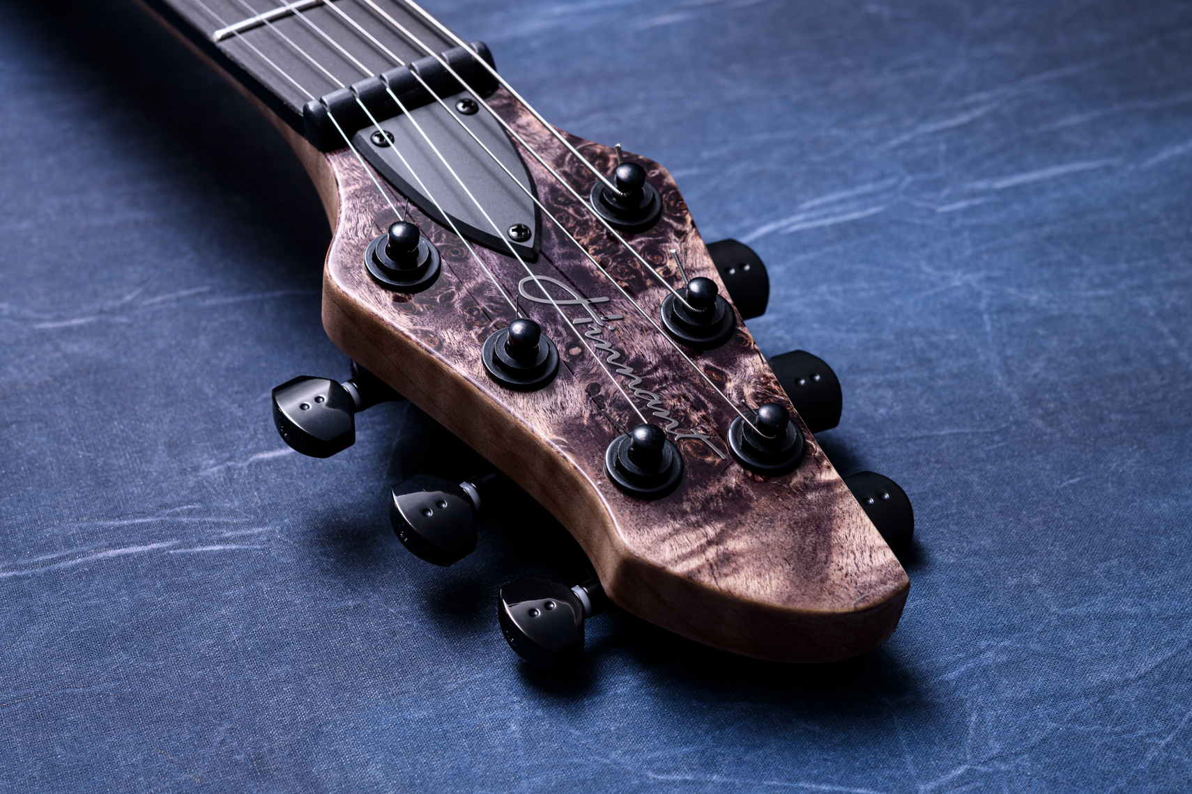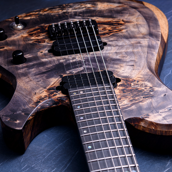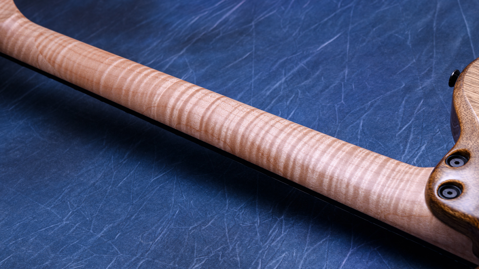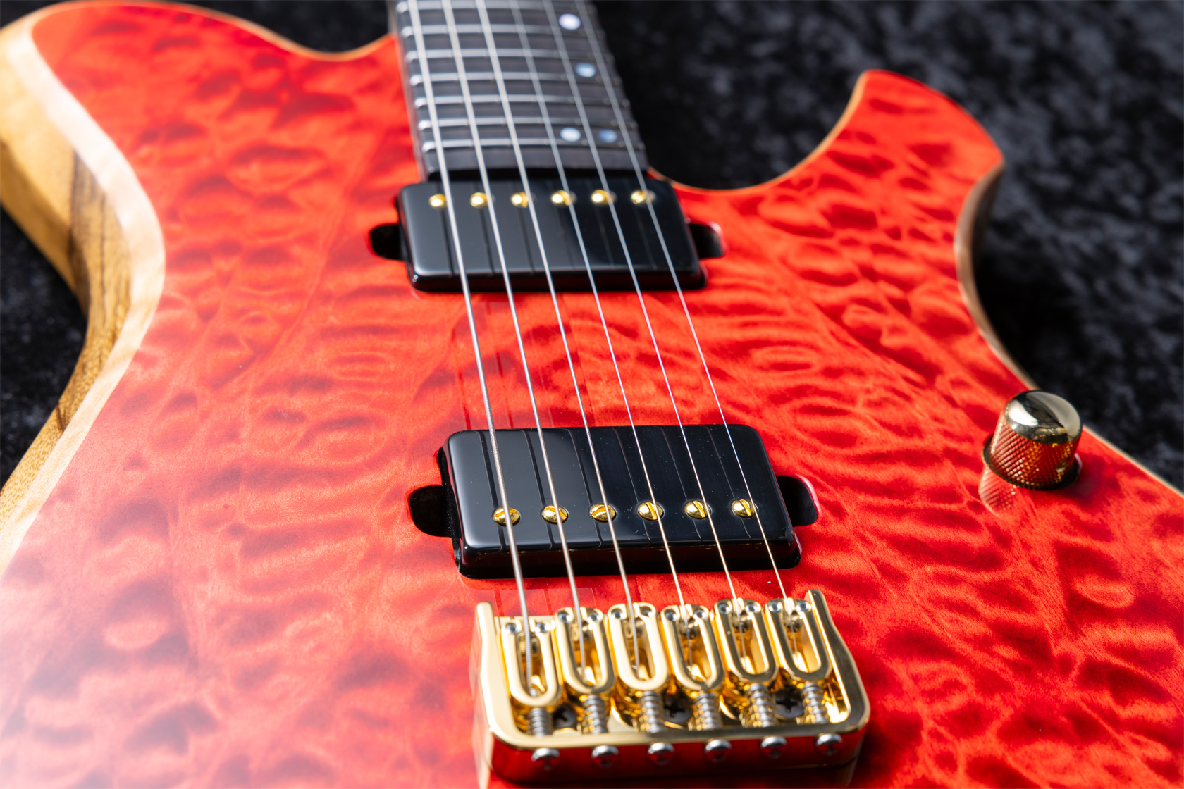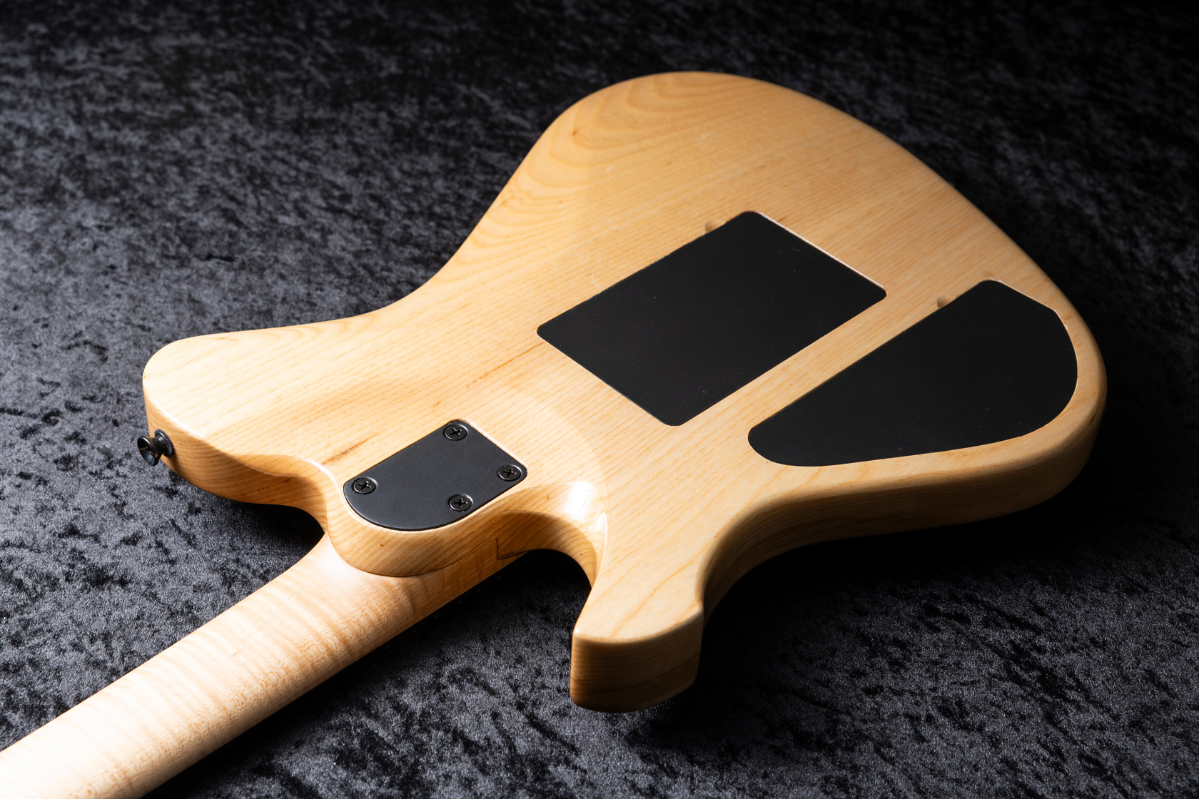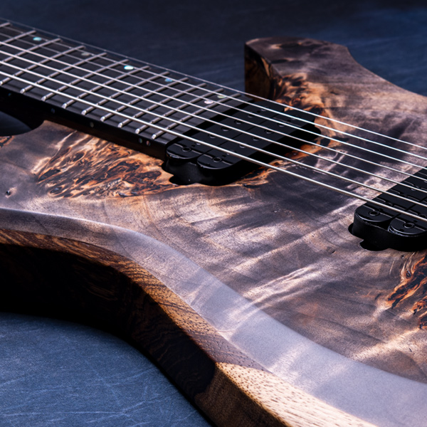 5Aグレードのフレイムメイプルネックに黒々としたエボニーの指板材を使用。ボディは中音域特性の良いブラックリンバに担当者がセレクトしたバールメイプルをラミネイト。