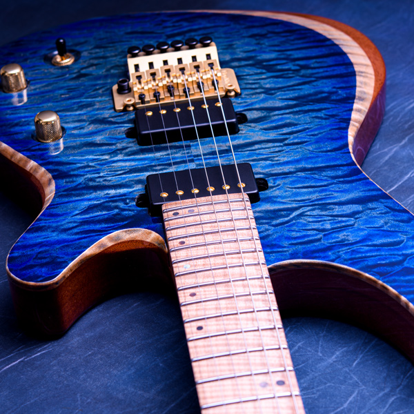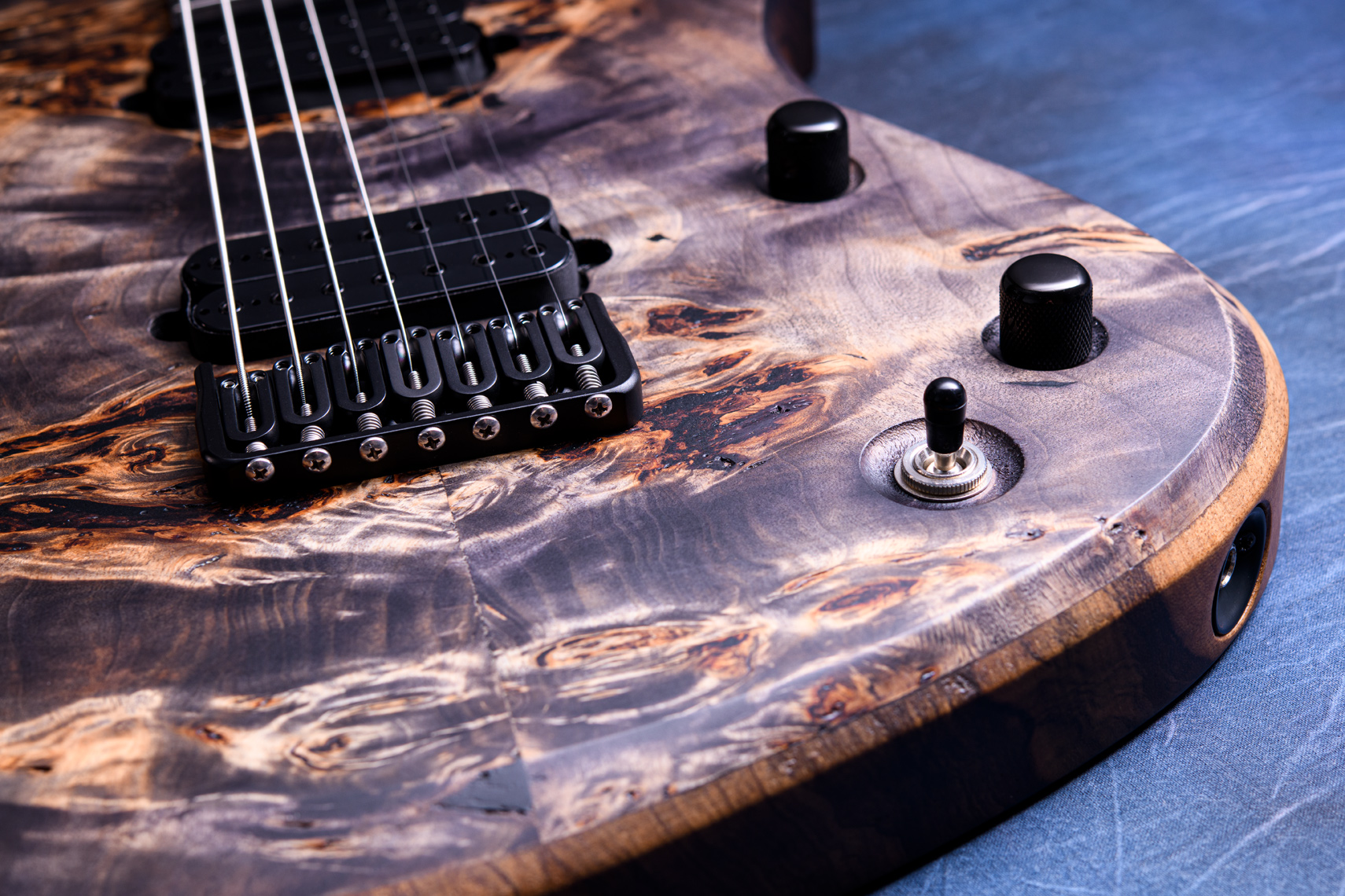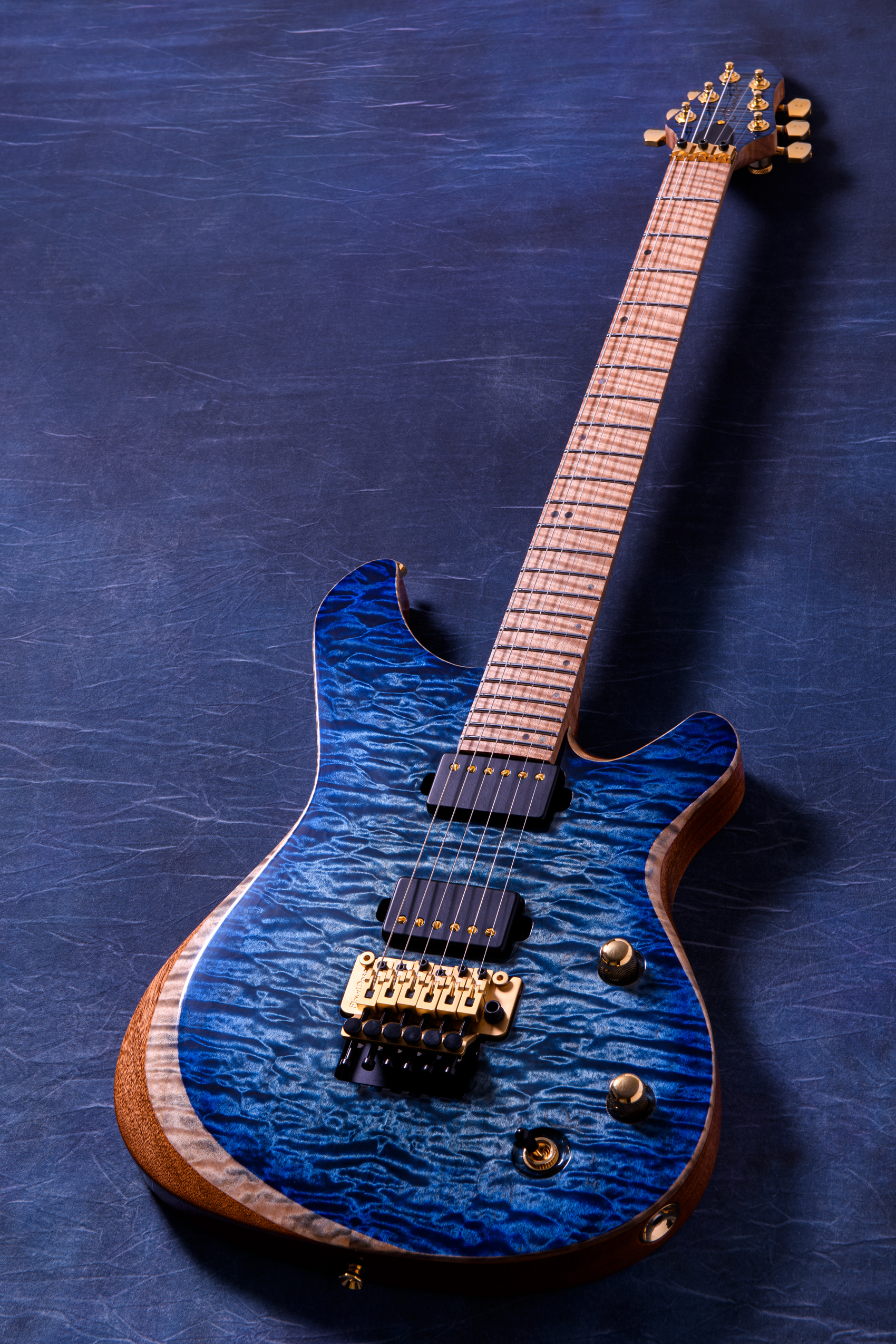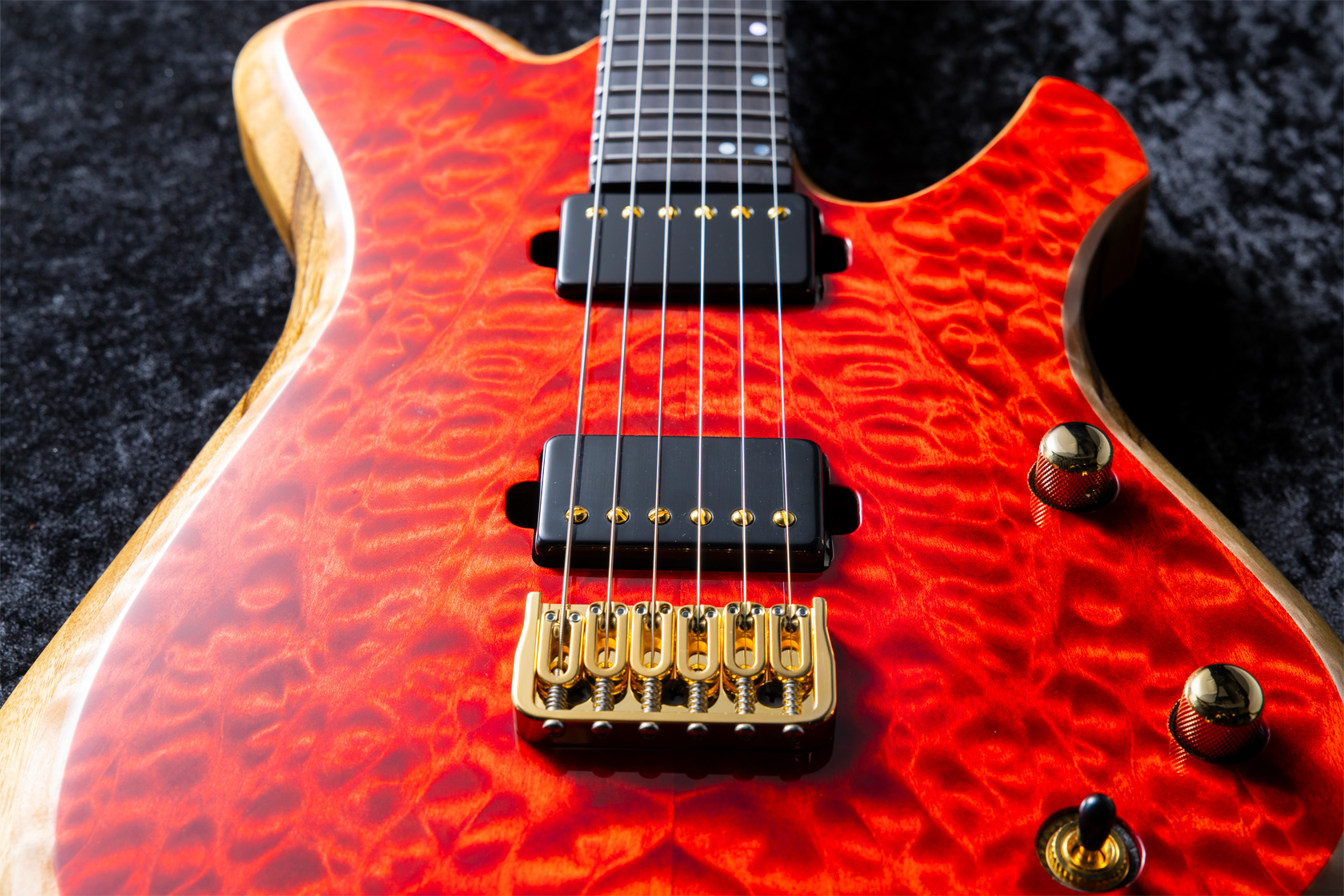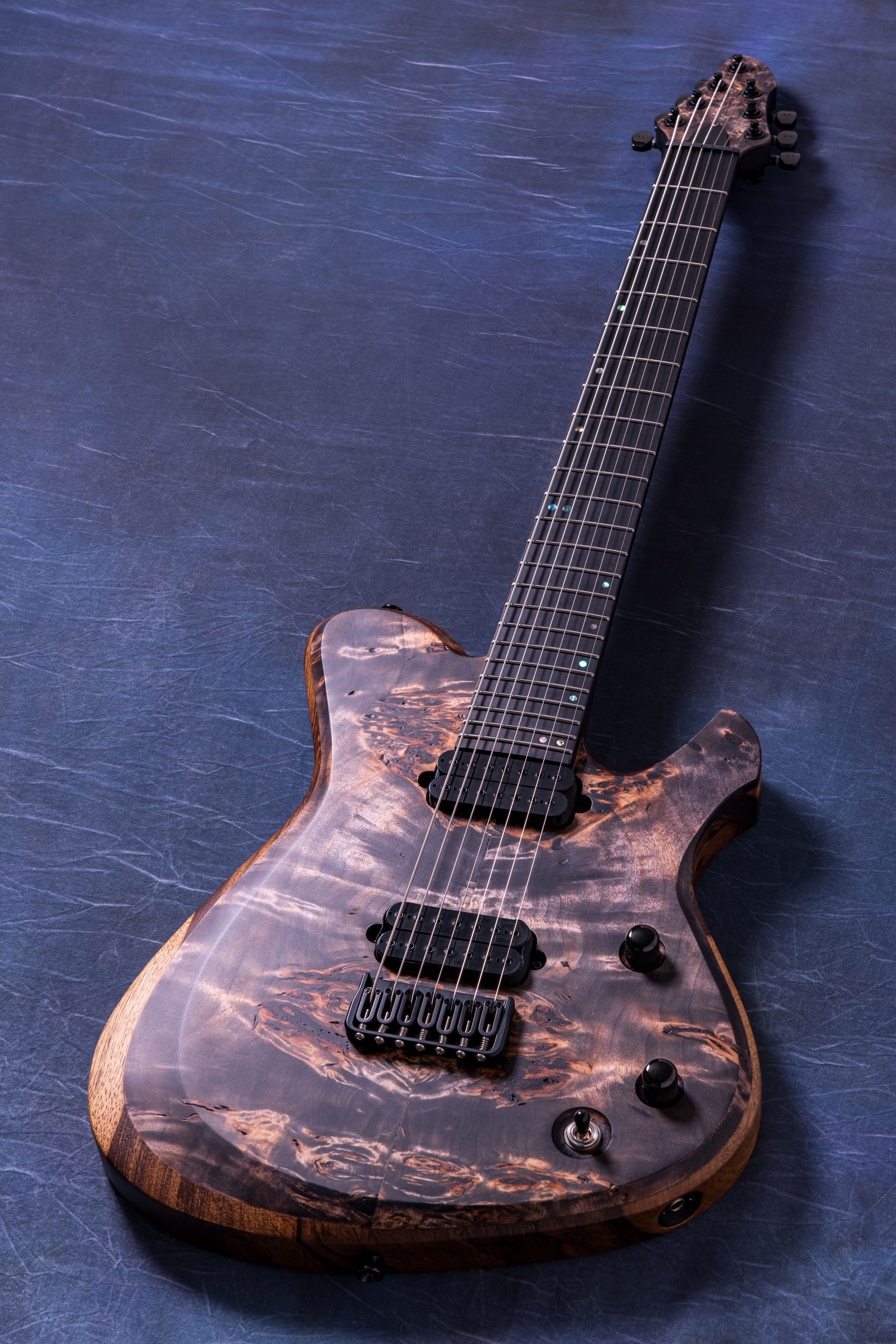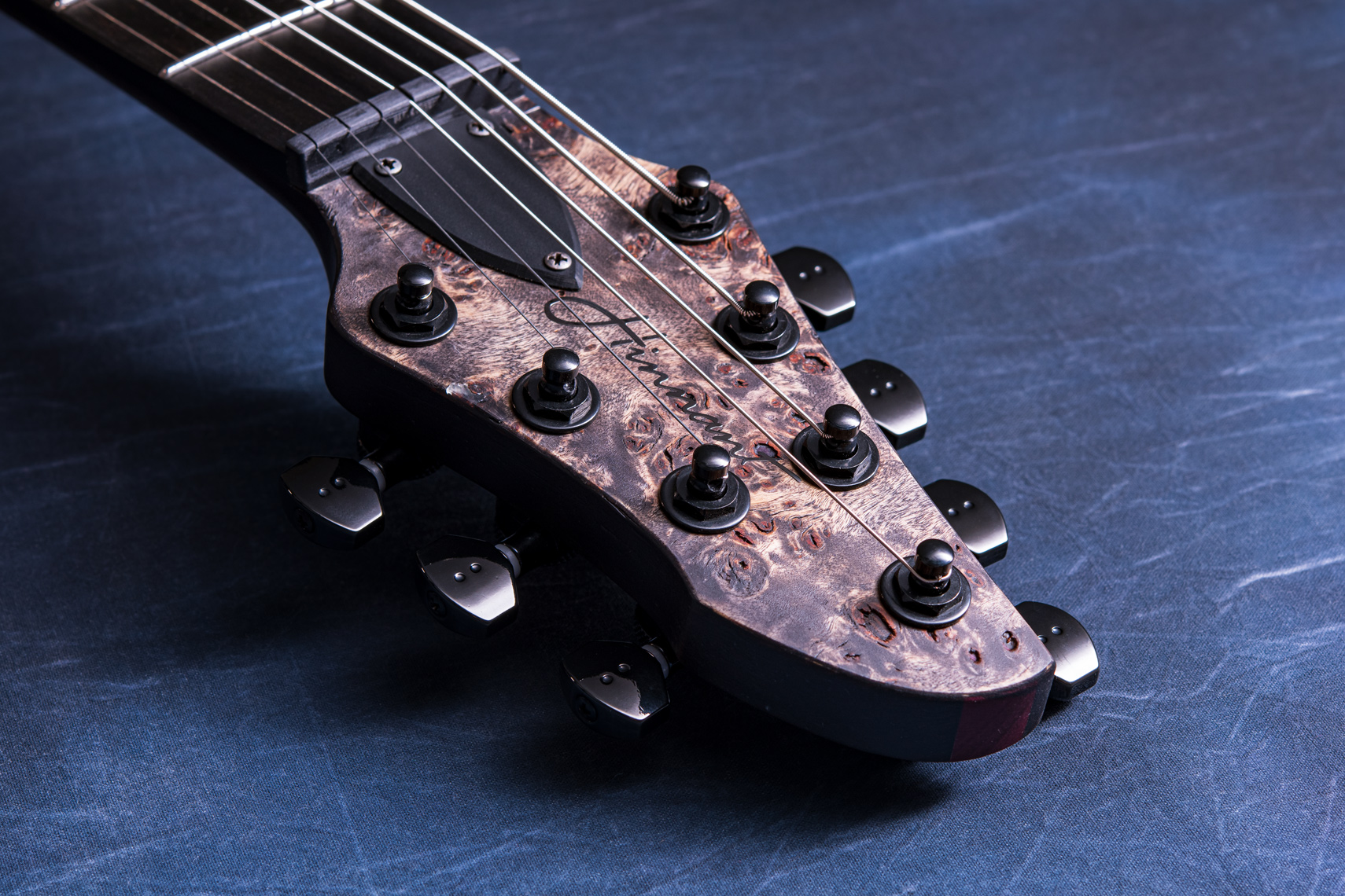 5Aグレードのフレイムメイプルネックに黒々としたエボニーの指板材を使用。ボディは中音域特性の良いブラックリンバに担当者がセレクトしたバールメイプルをラミネイト。
