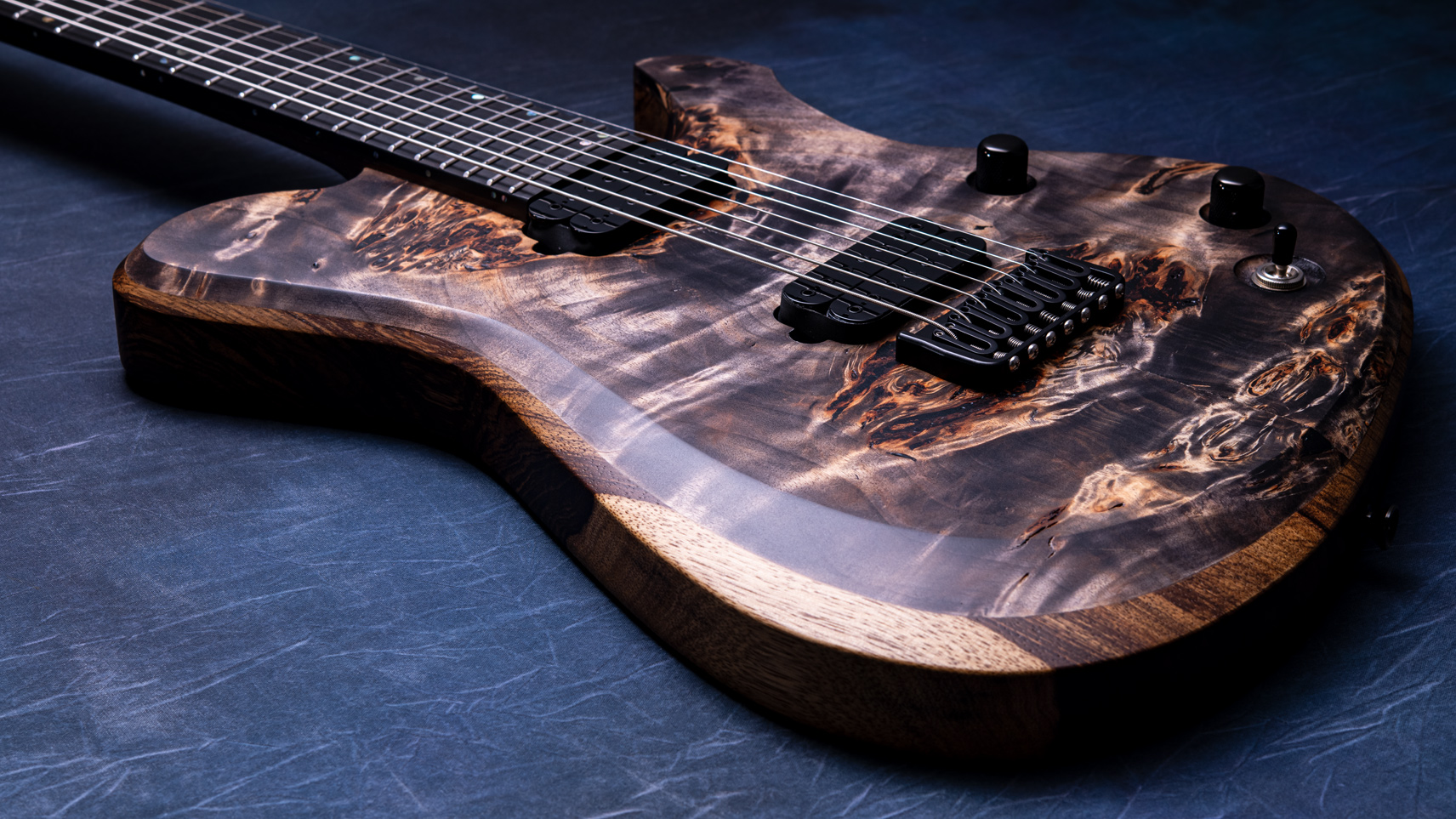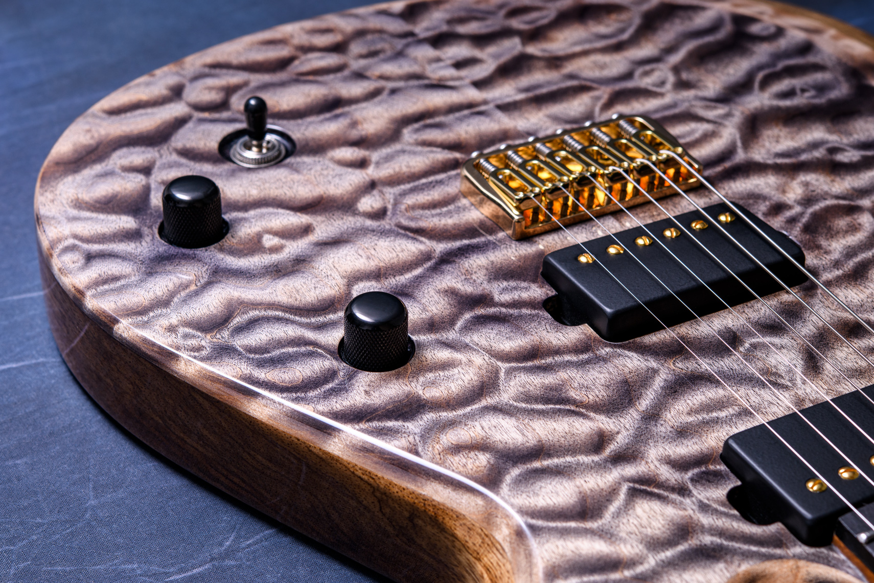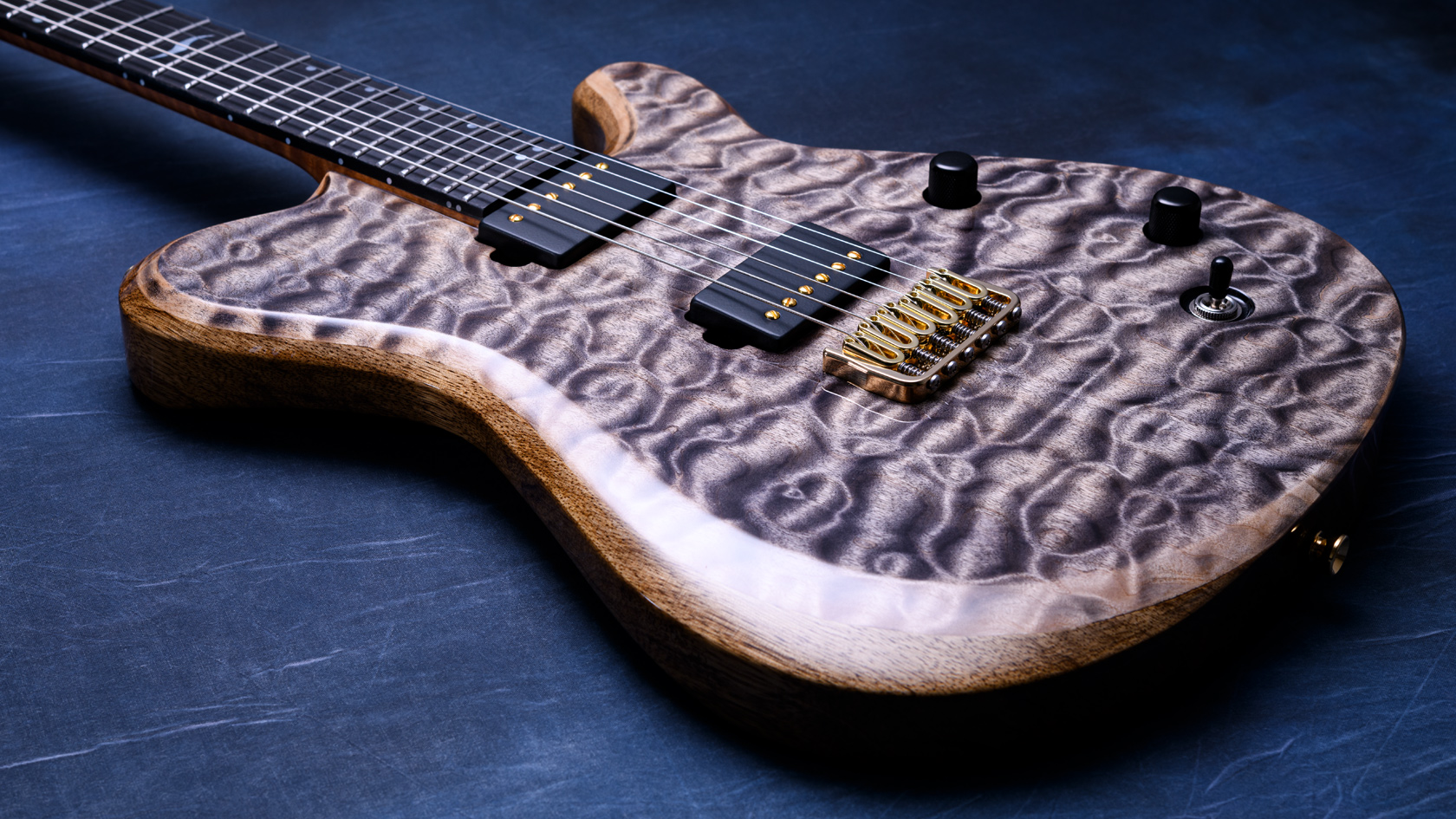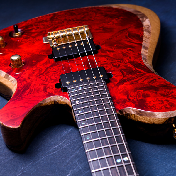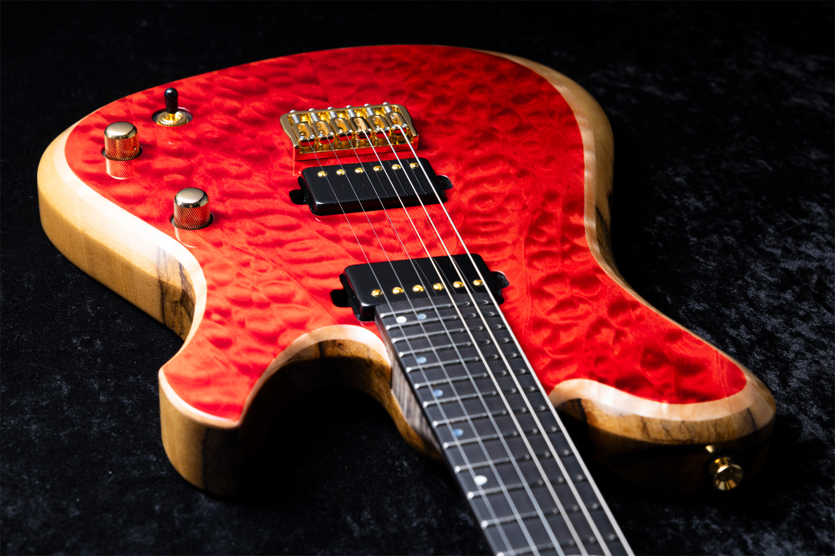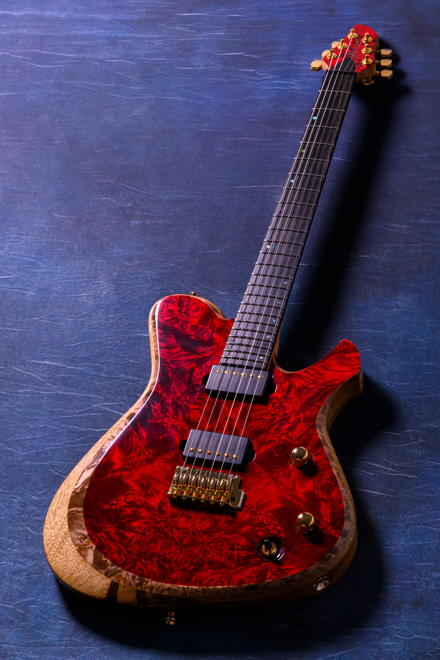 5Aグレードのフレイムメイプルネックに黒々としたエボニーの指板材を使用。ボディは中音域特性の良いブラックリンバに担当者がセレクトしたバールメイプルをラミネイト。