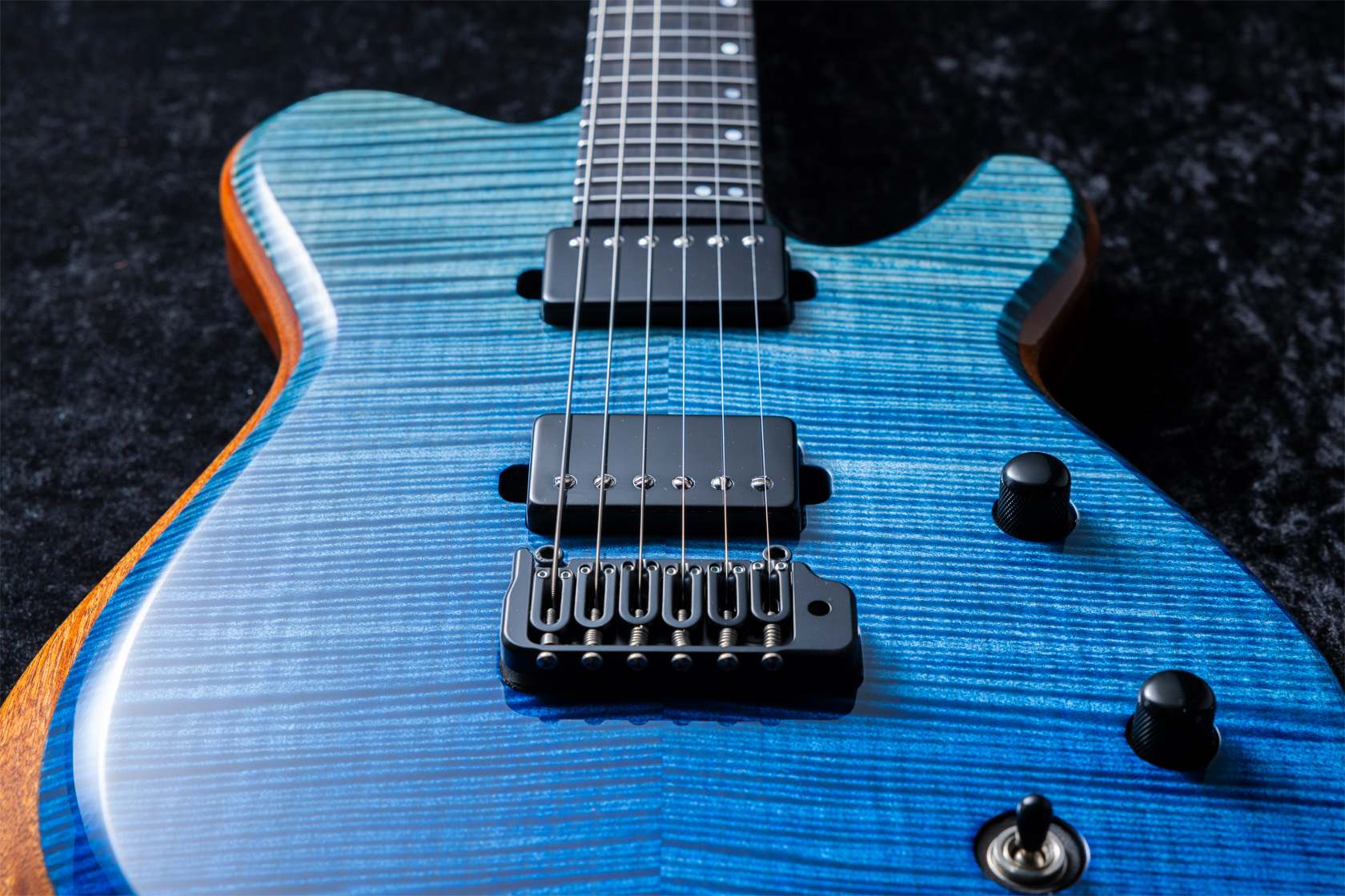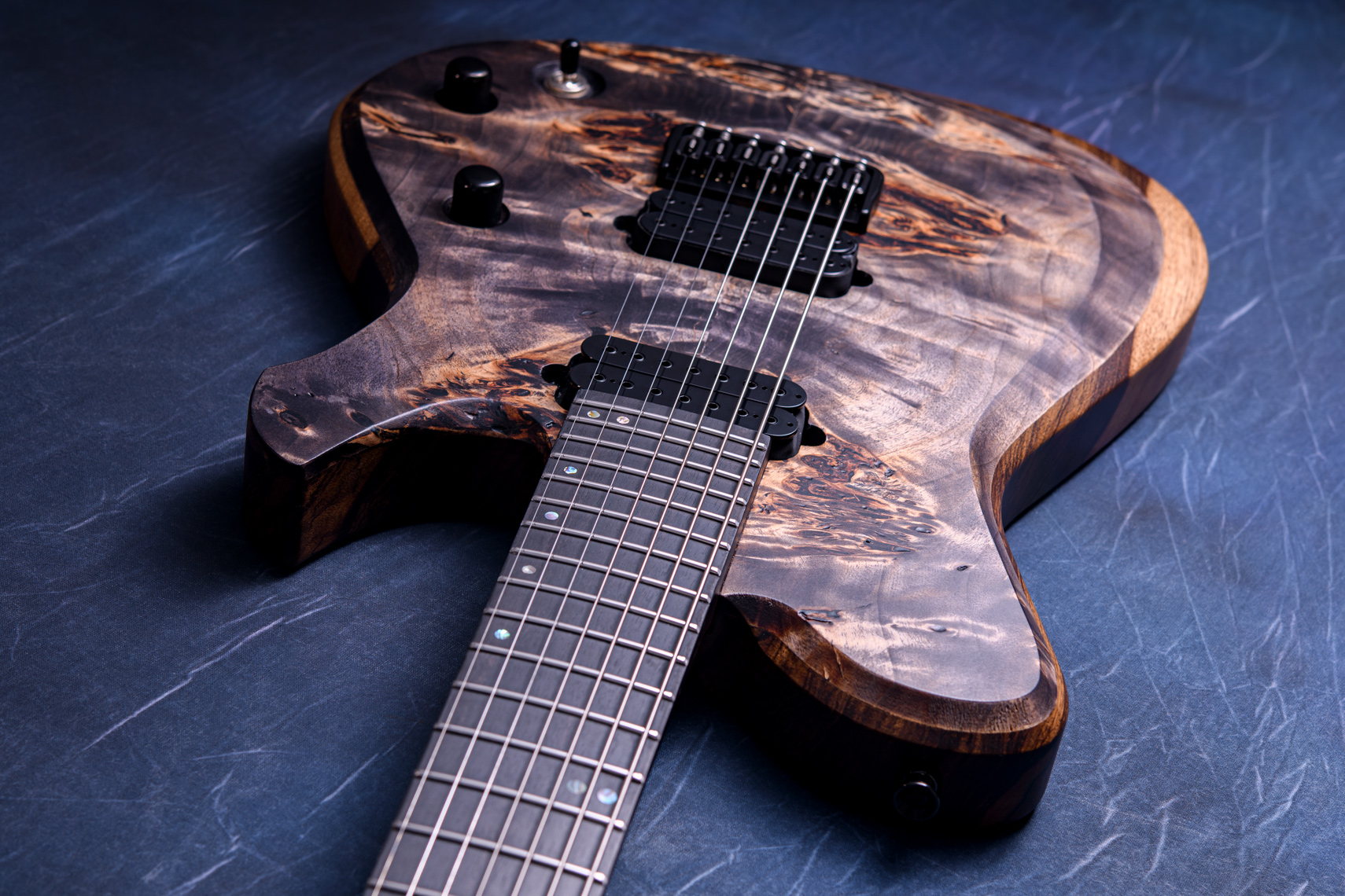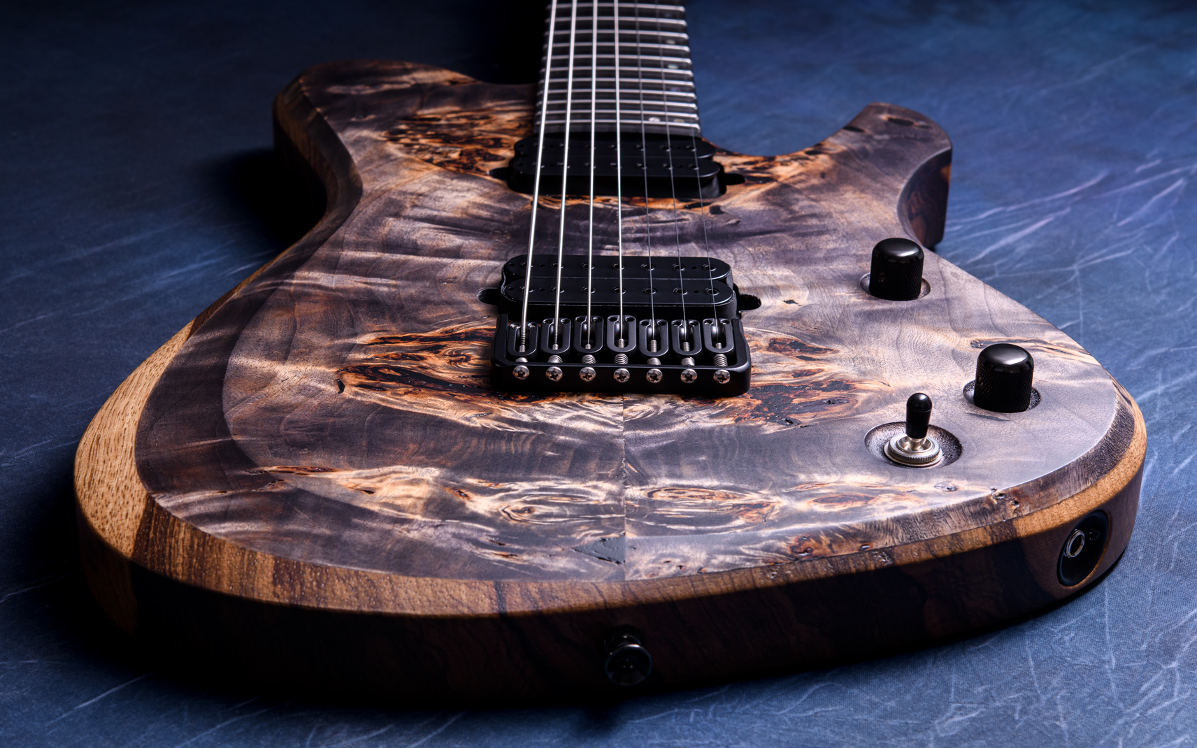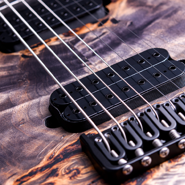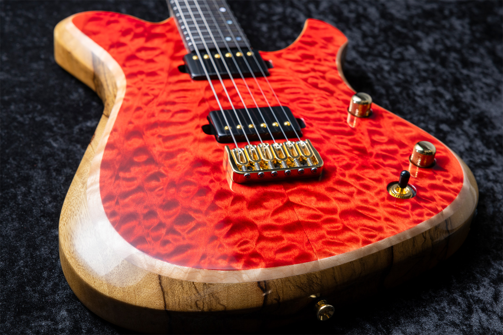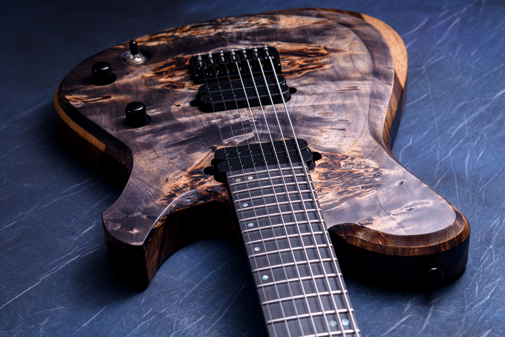 5Aグレードのフレイムメイプルネックに黒々としたエボニーの指板材を使用。ボディは中音域特性の良いブラックリンバに担当者がセレクトしたバールメイプルをラミネイト。