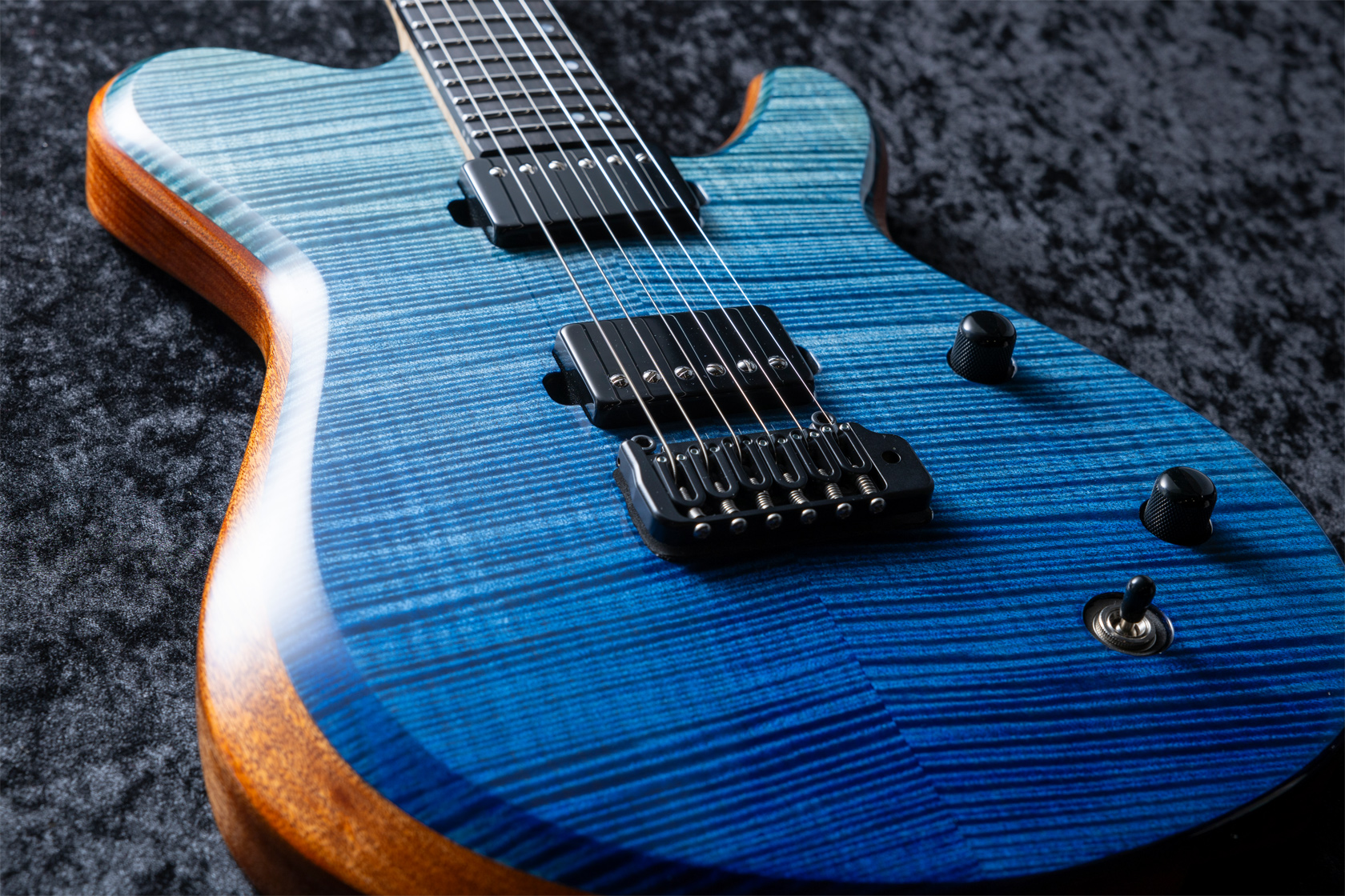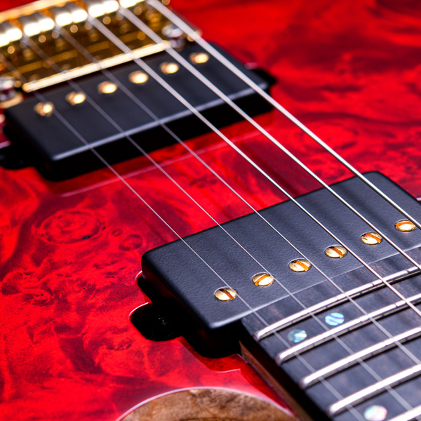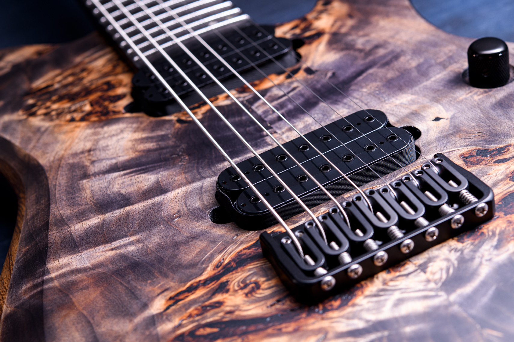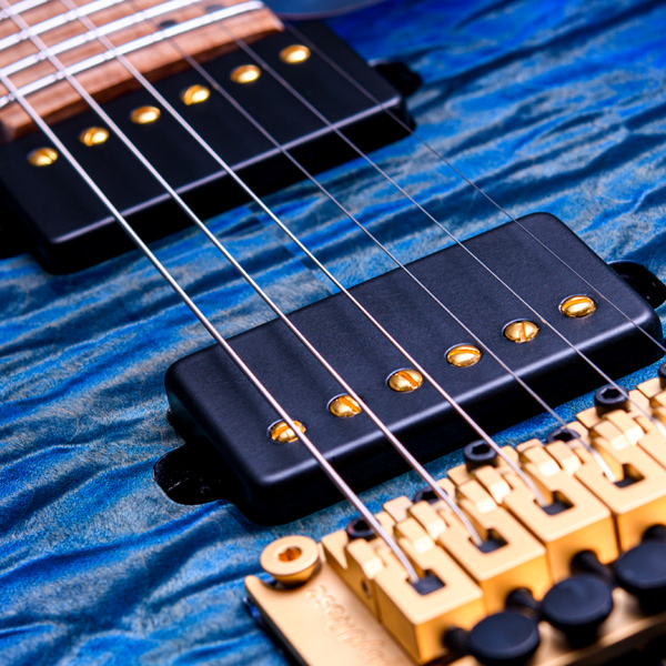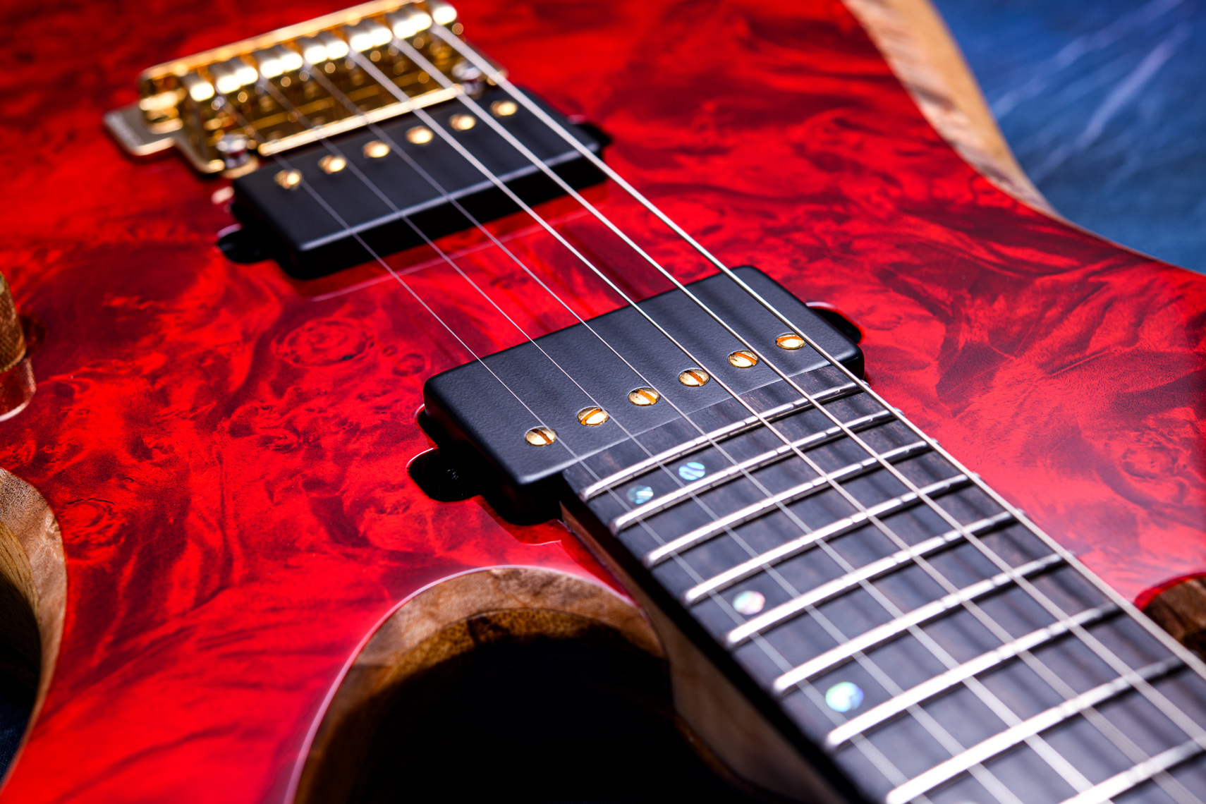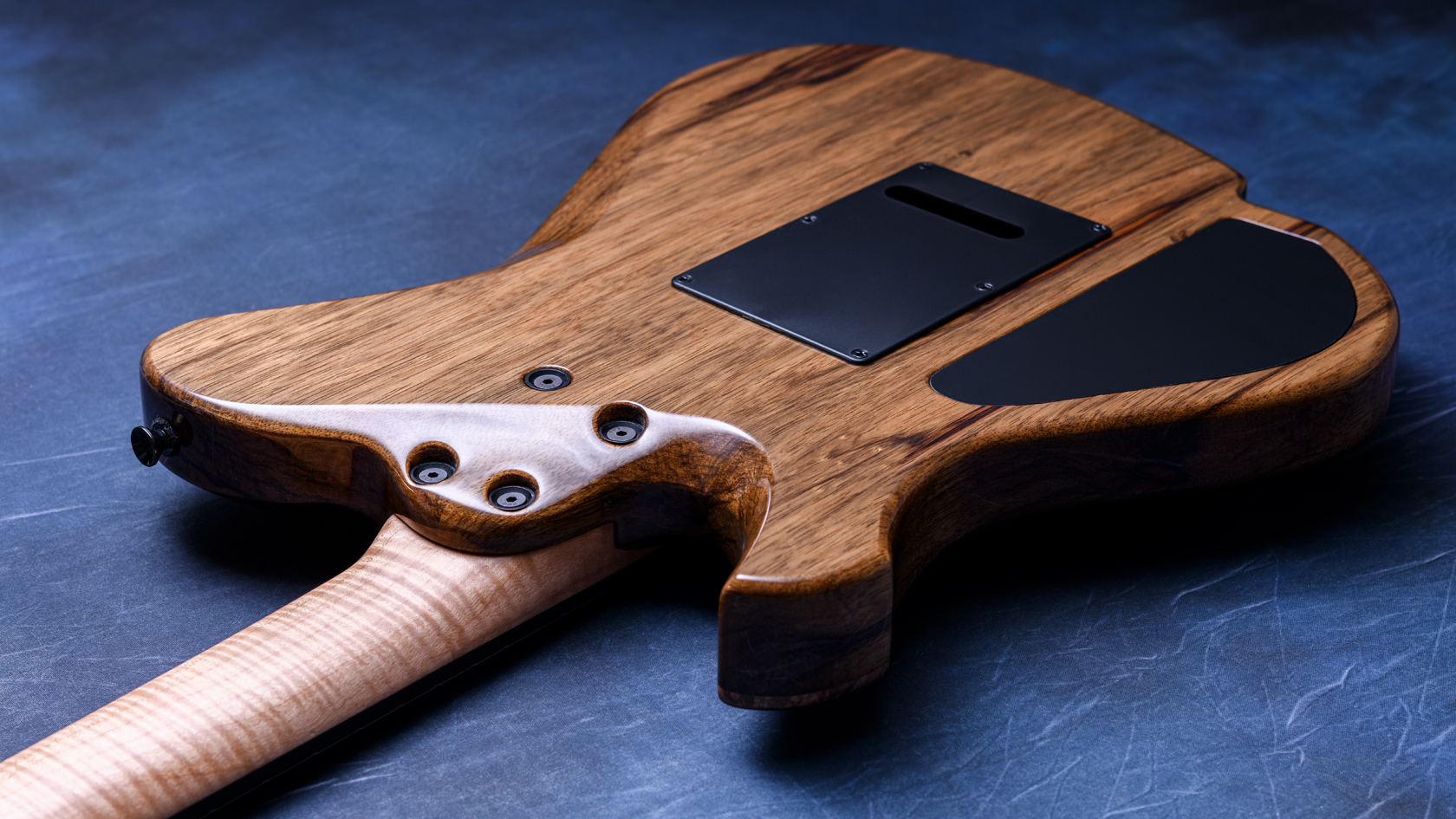 5Aグレードのフレイムメイプルネックに黒々としたエボニーの指板材を使用。ボディは中音域特性の良いブラックリンバに担当者がセレクトしたバールメイプルをラミネイト。