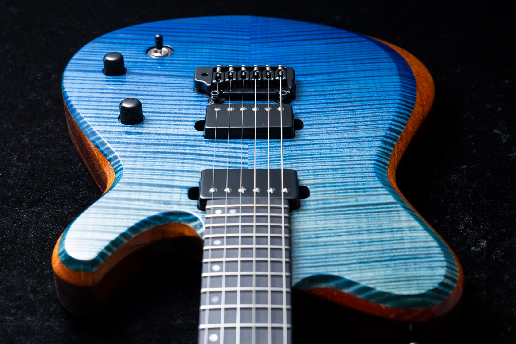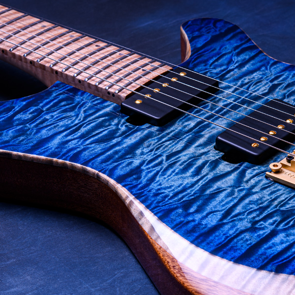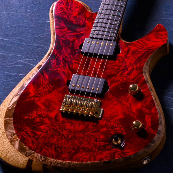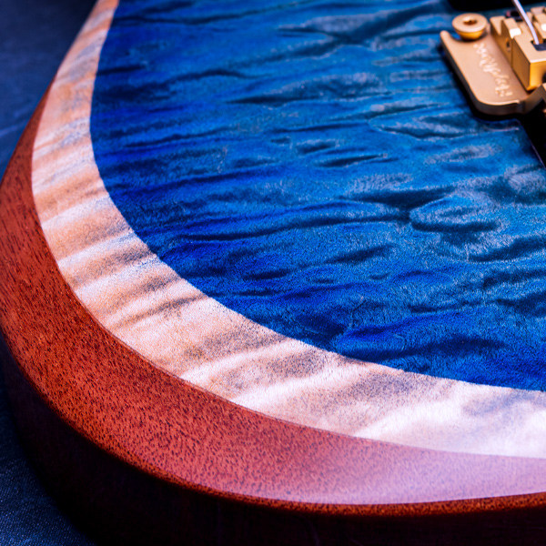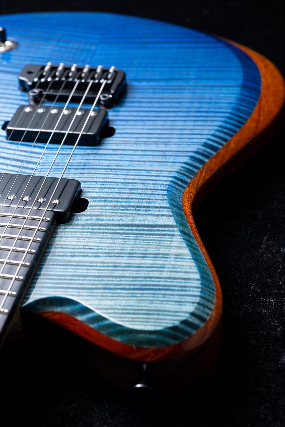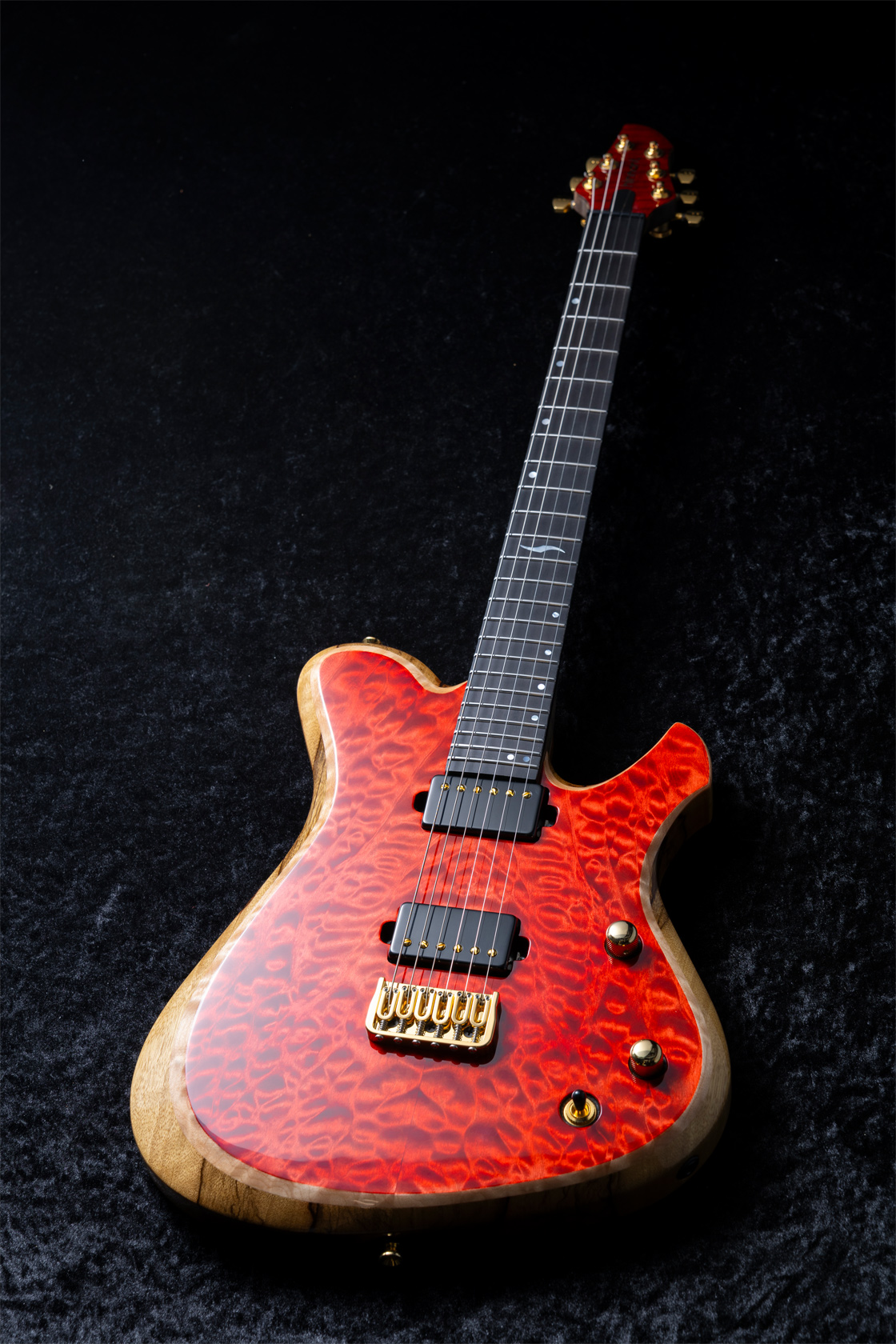 よりトラディショナルなトーンを目指しマホガニーにメイプルをラミネイトした伝統的なスタイル。極上の5Aキルトメイプルを透き通った水面を彷彿とさせるトランスルーセントカラーで染めた贅沢な一本。