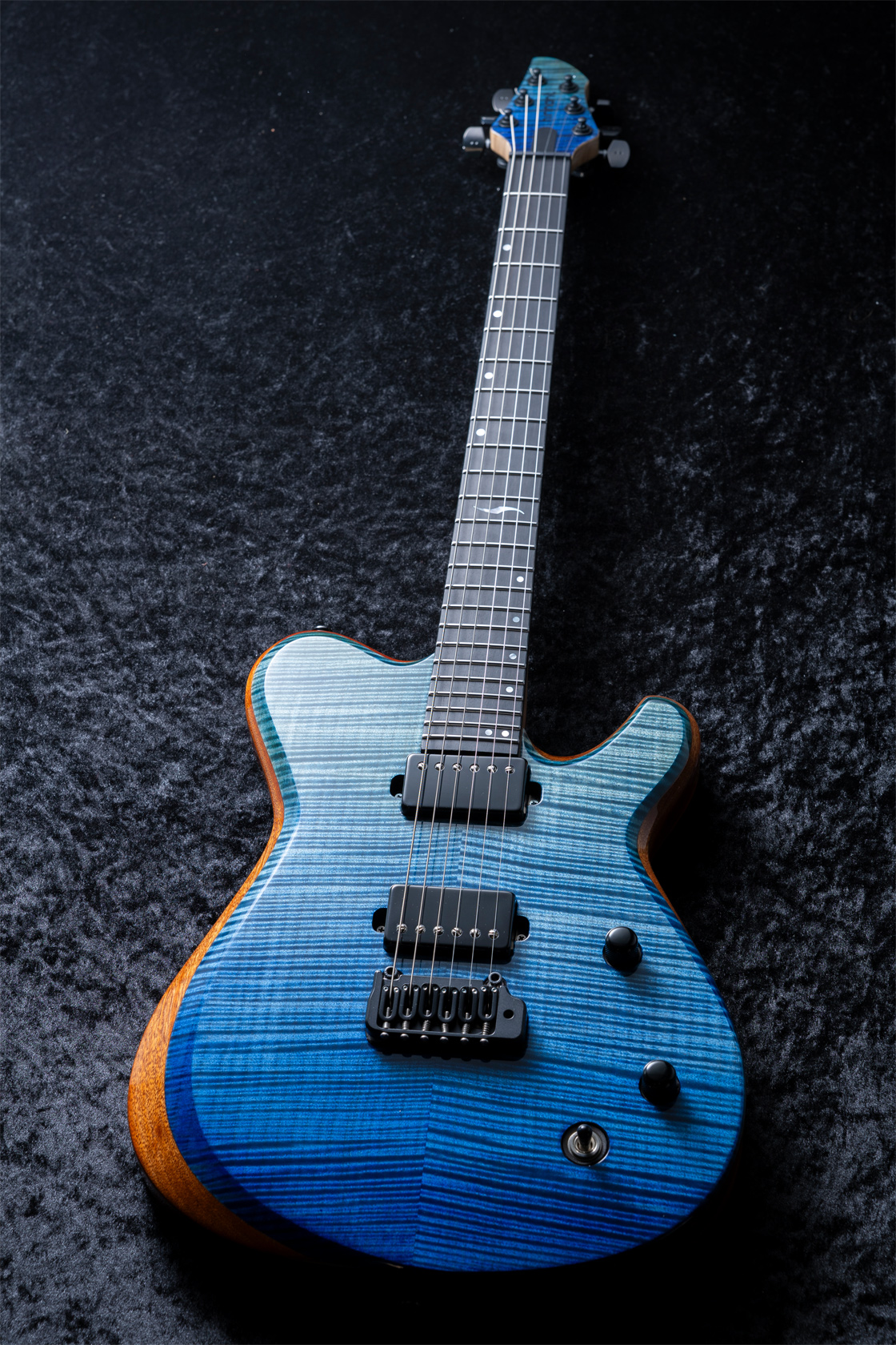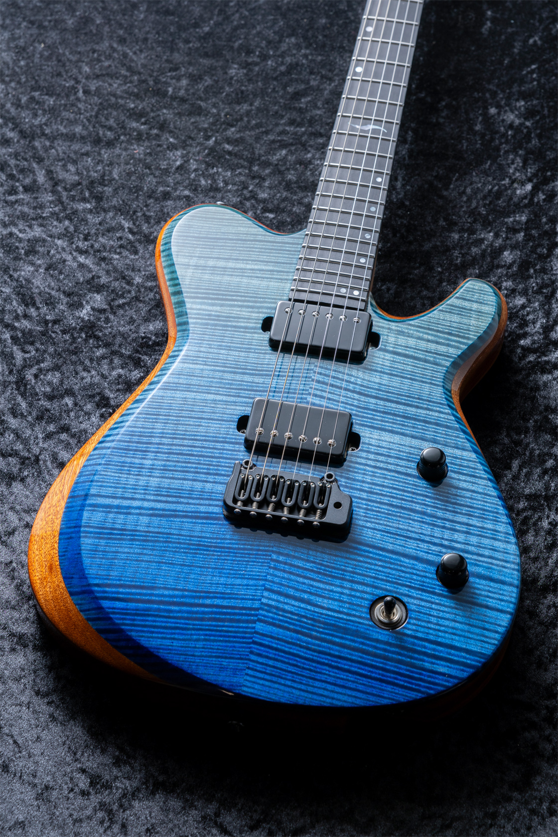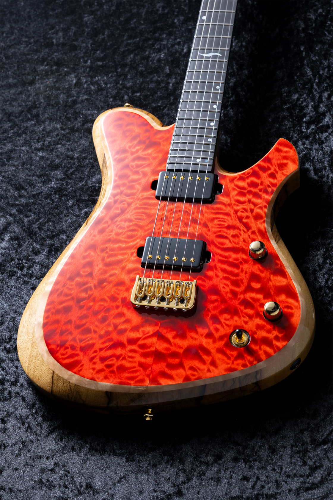 よりトラディショナルなトーンを目指しマホガニーにメイプルをラミネイトした伝統的なスタイル。極上の5Aキルトメイプルを透き通った水面を彷彿とさせるトランスルーセントカラーで染めた贅沢な一本。
