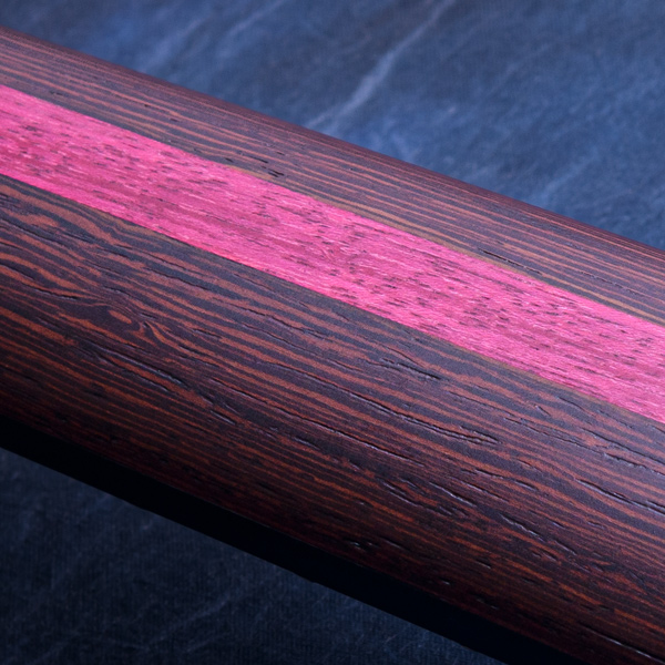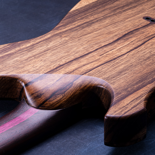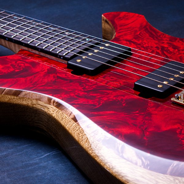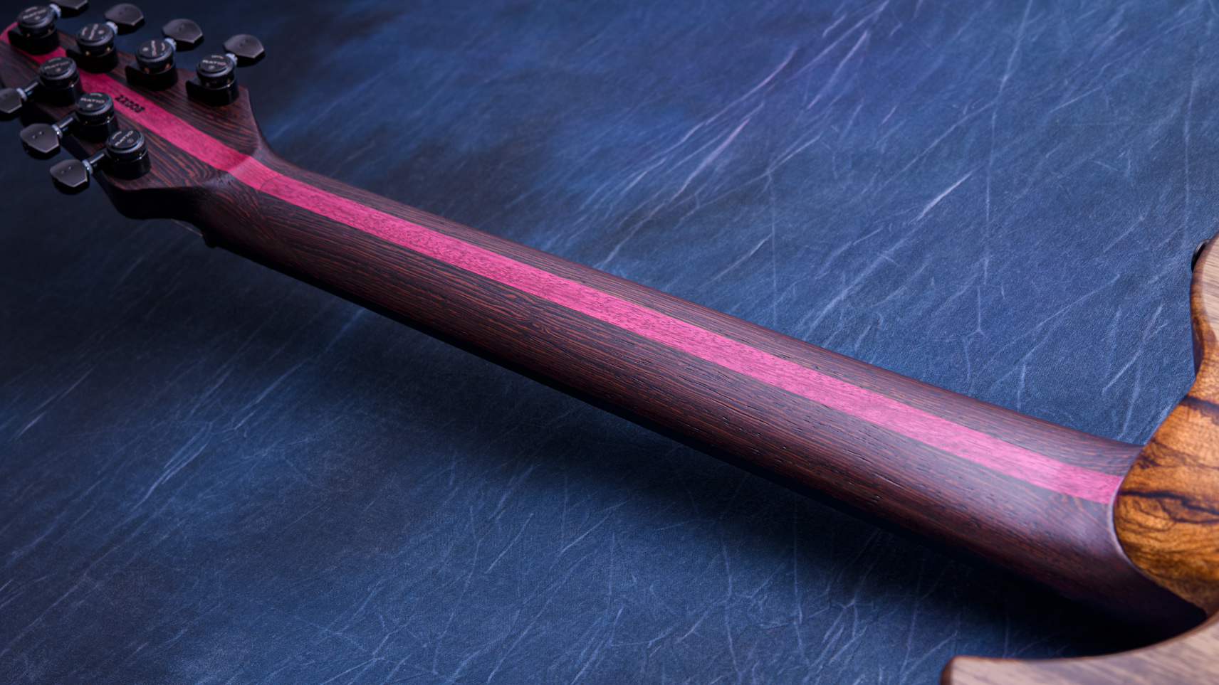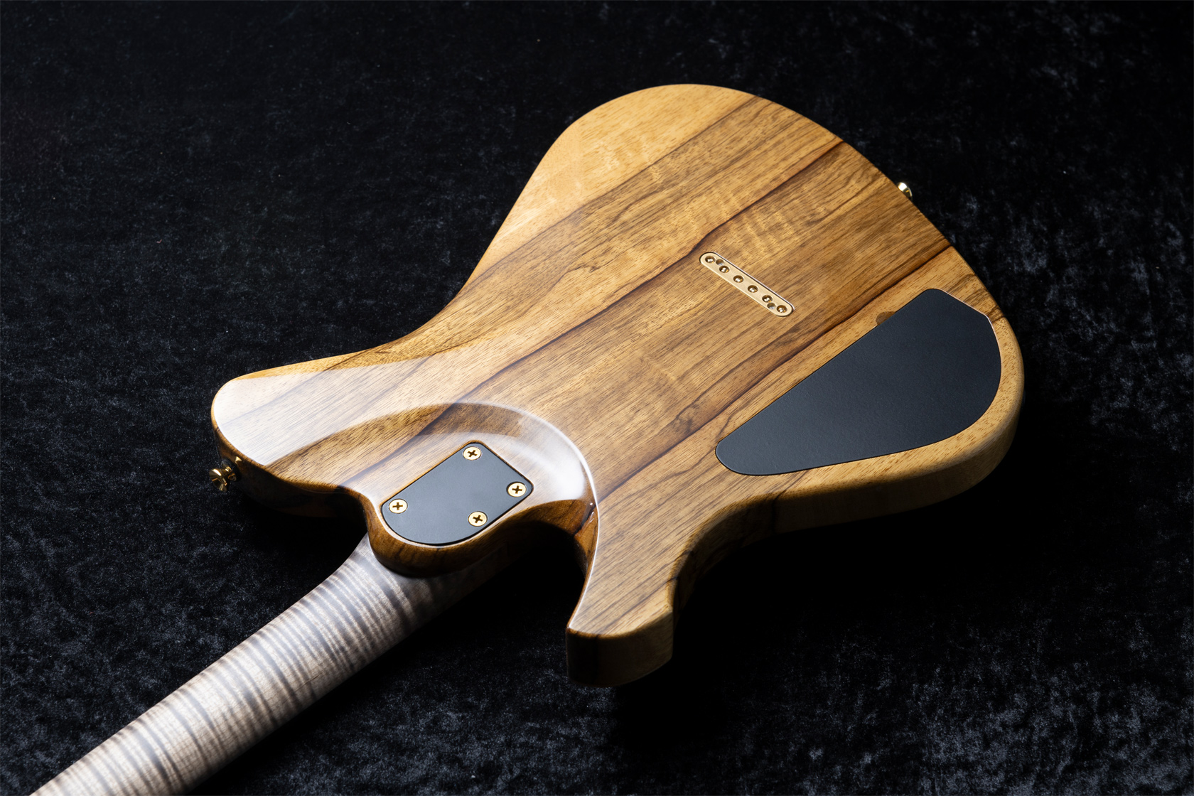 エクストラロングスケール(26.5inch)を採用したウエンジ&パープルハートの強固なネックと、ボディ中音域特性の良いブラックリンバに、担当者がセレクトしたポプラバールをラミネイト。