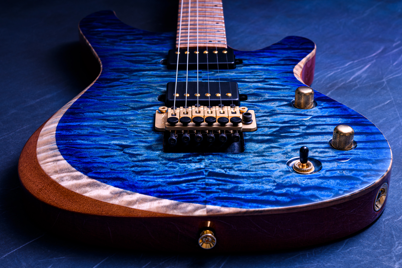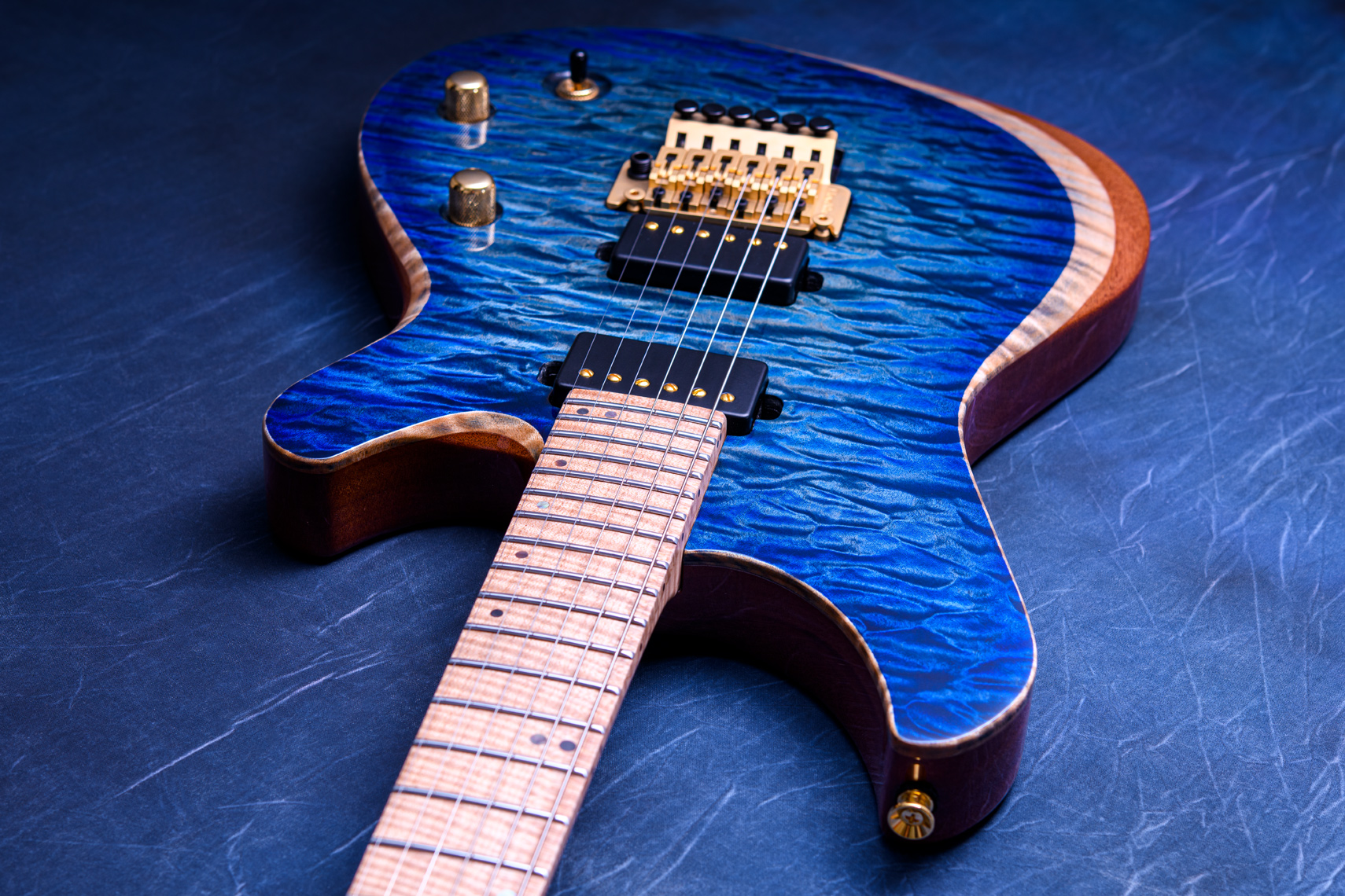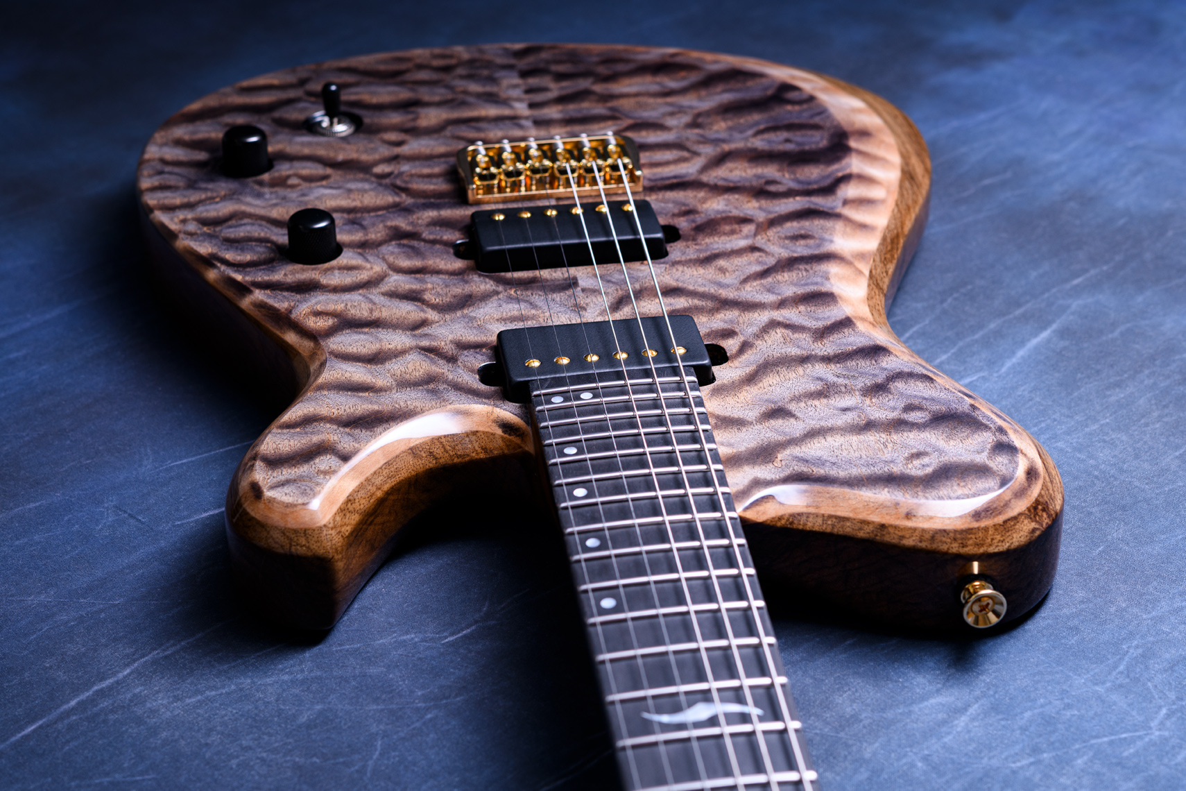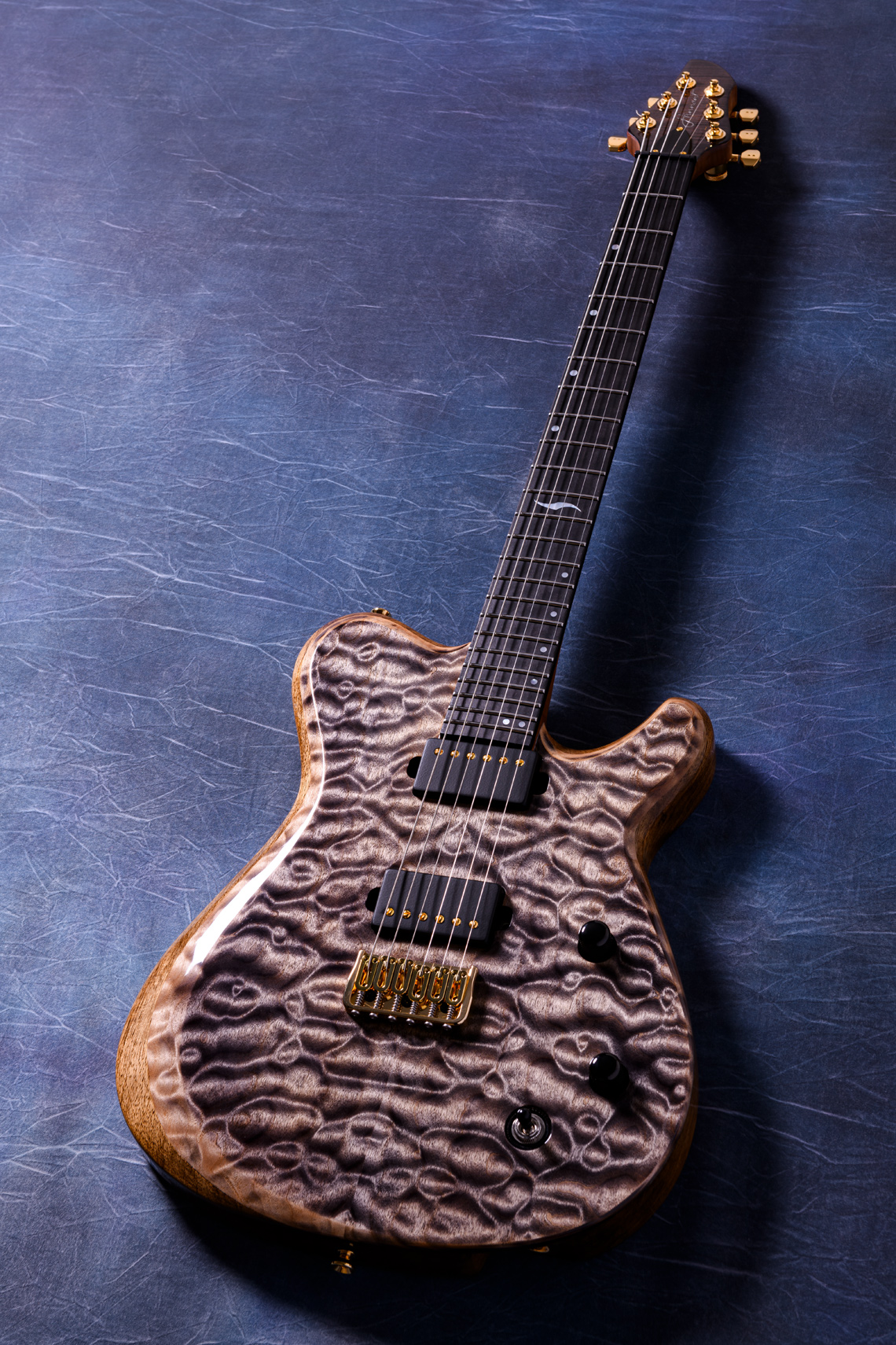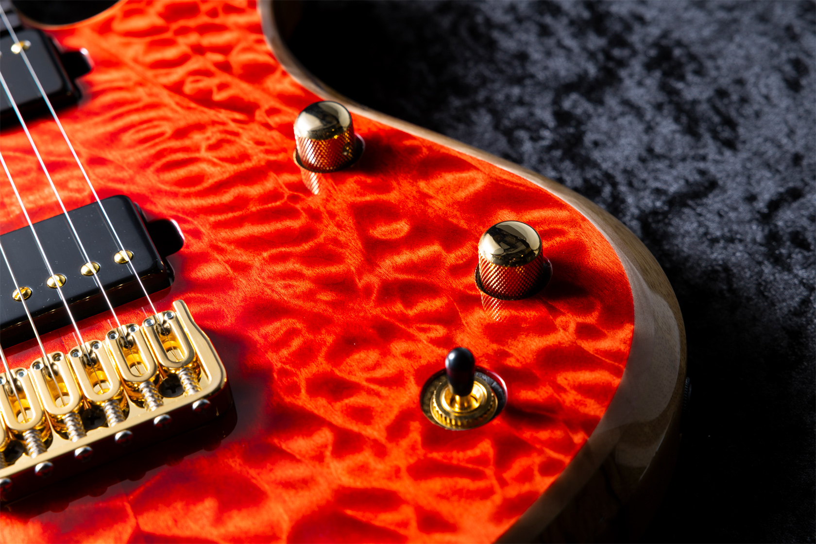 ボディには極上のキルトメイプルを贅沢に使用し、ウエイトレリーフ加工(チェンバー加工)が施されたブラックリンバとの組み合わせを採用。ラグジュアリーなルックスとタイトでクリアなサウンド、機能性のすべてを兼ね備えております。