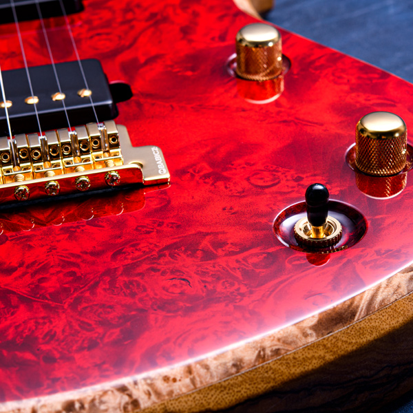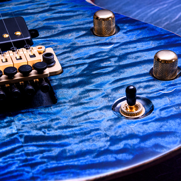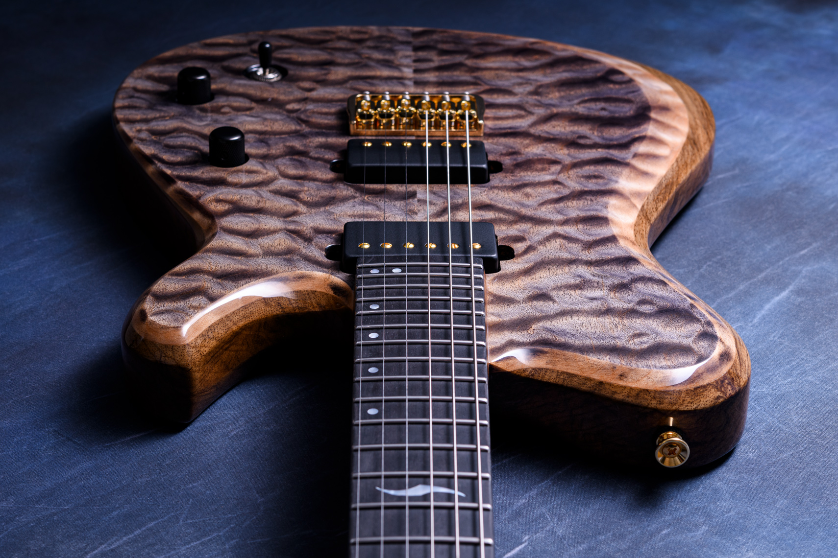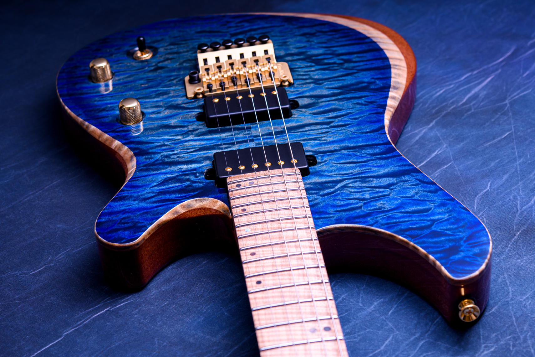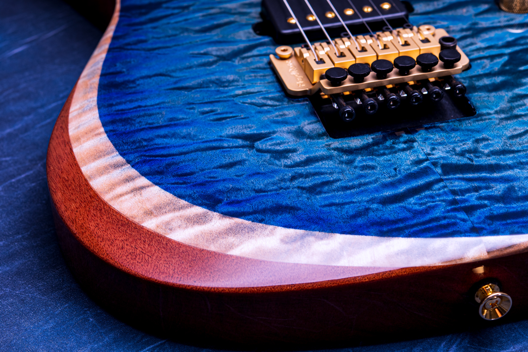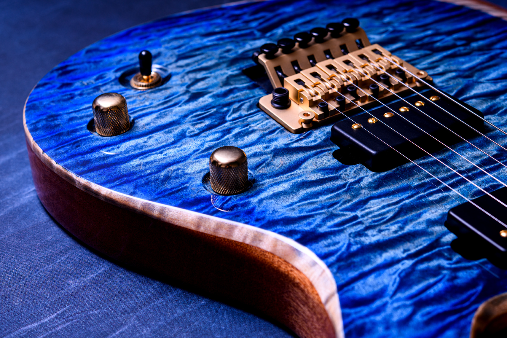 ボディには極上のキルトメイプルを贅沢に使用し、ウエイトレリーフ加工(チェンバー加工)が施されたブラックリンバとの組み合わせを採用。ラグジュアリーなルックスとタイトでクリアなサウンド、機能性のすべてを兼ね備えております。