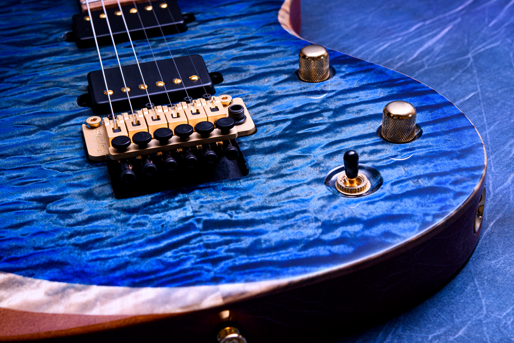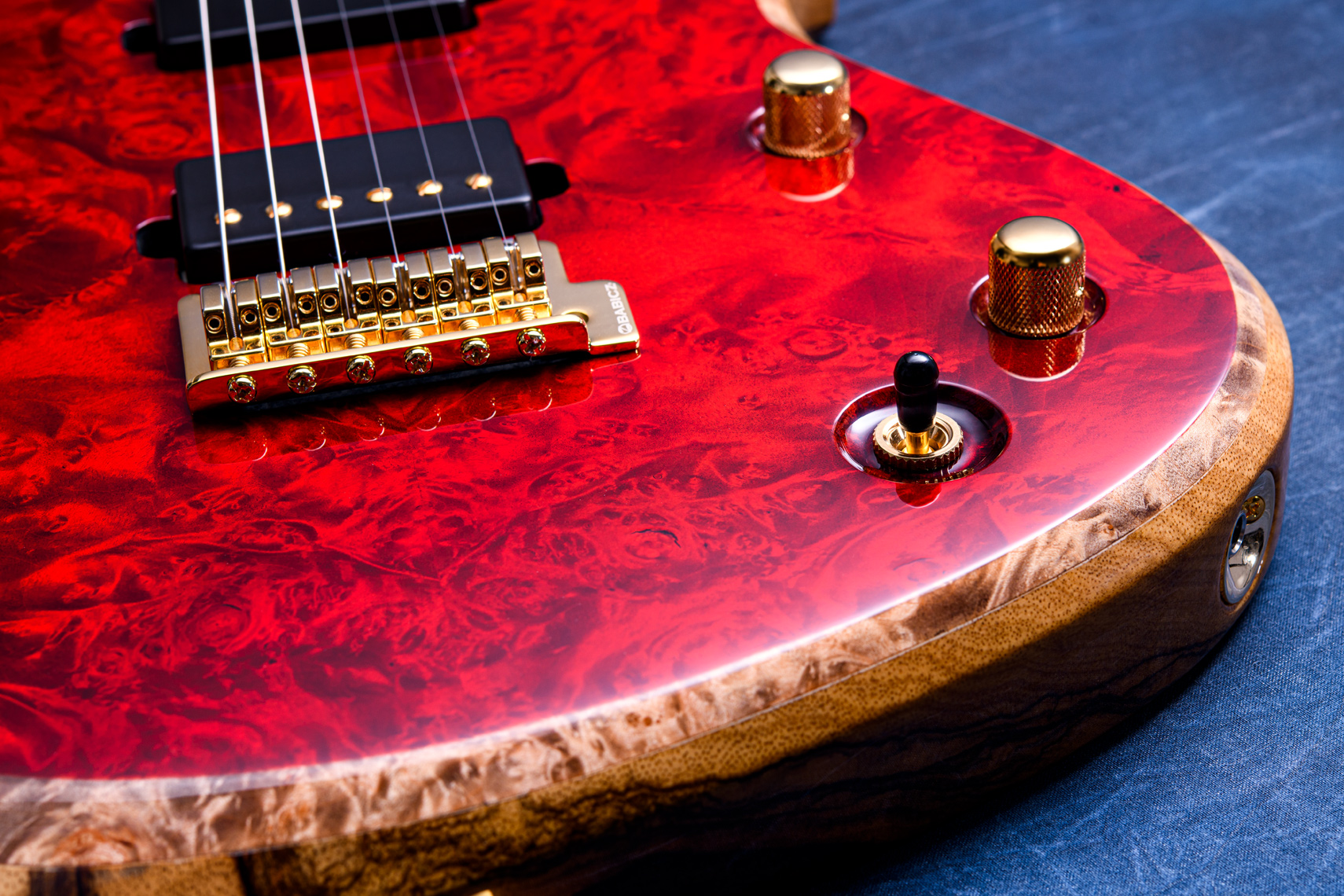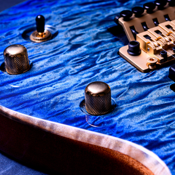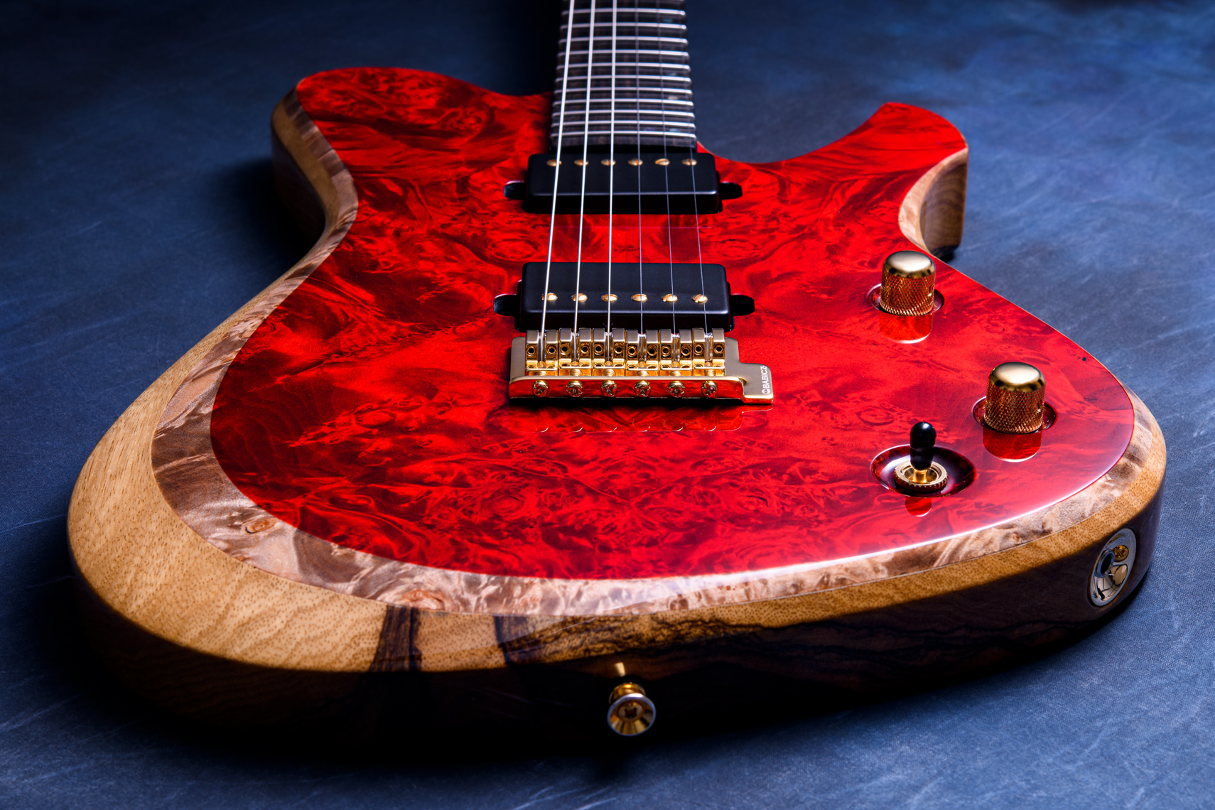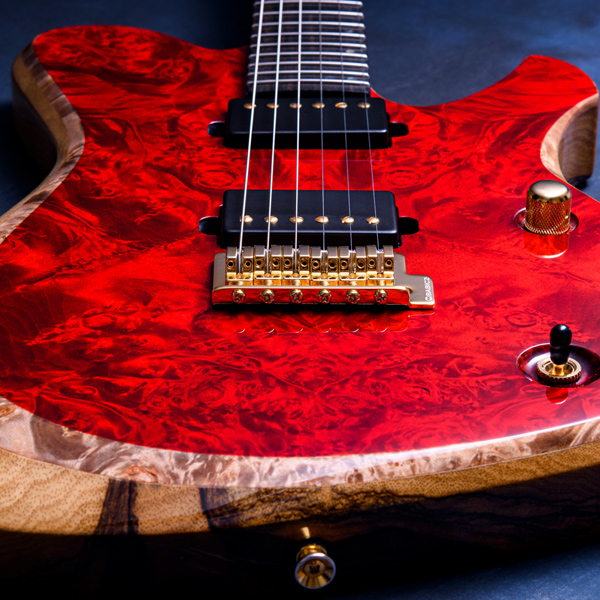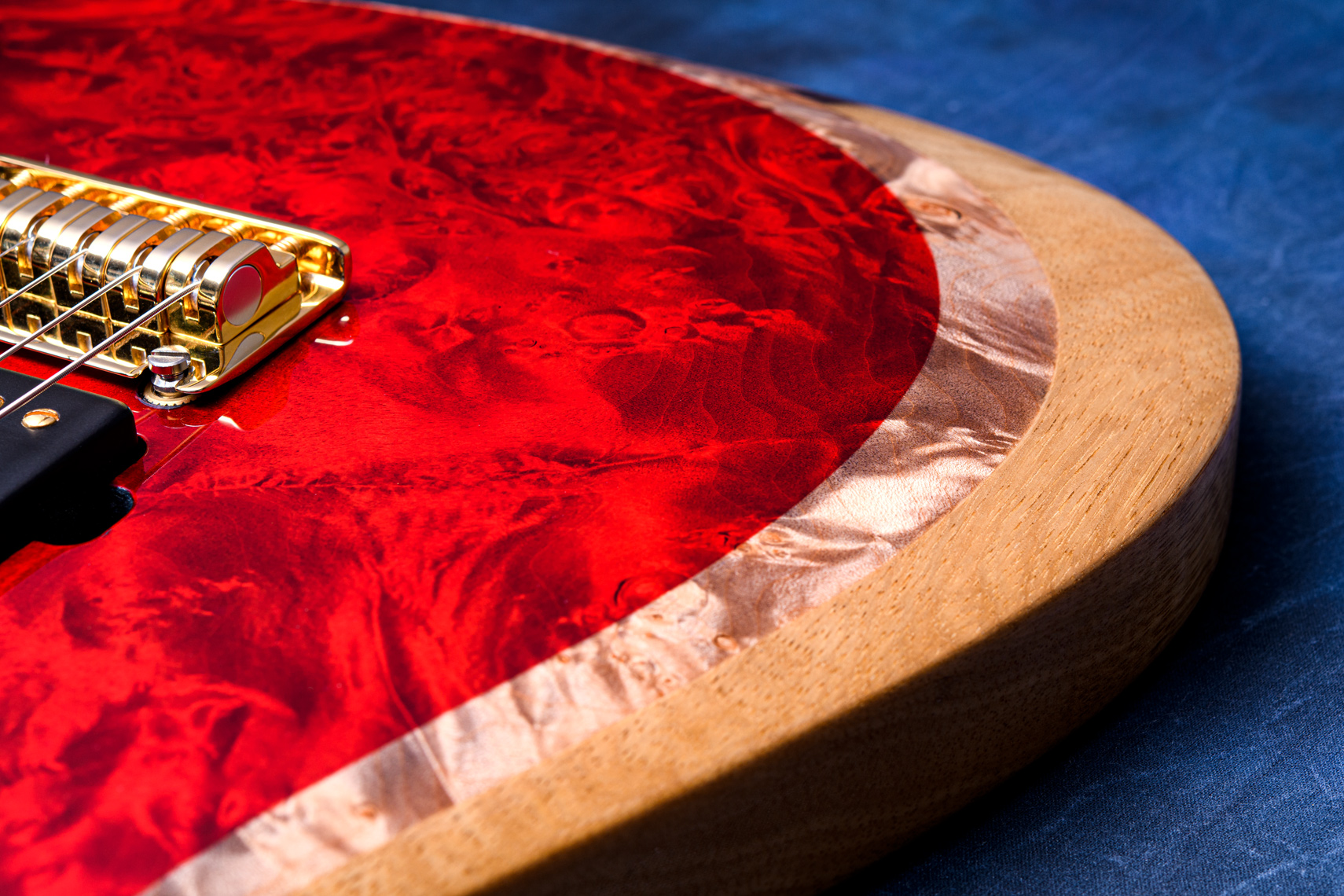 ボディには極上のキルトメイプルを贅沢に使用し、ウエイトレリーフ加工(チェンバー加工)が施されたブラックリンバとの組み合わせを採用。ラグジュアリーなルックスとタイトでクリアなサウンド、機能性のすべてを兼ね備えております。
