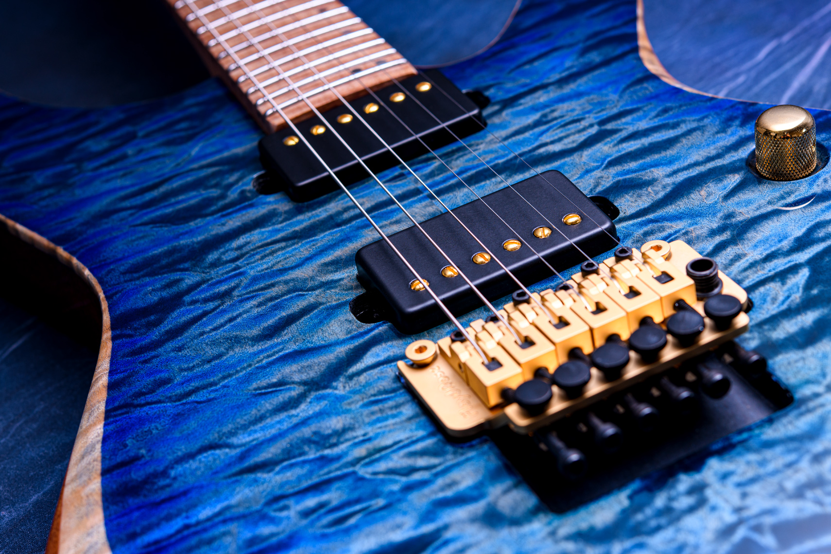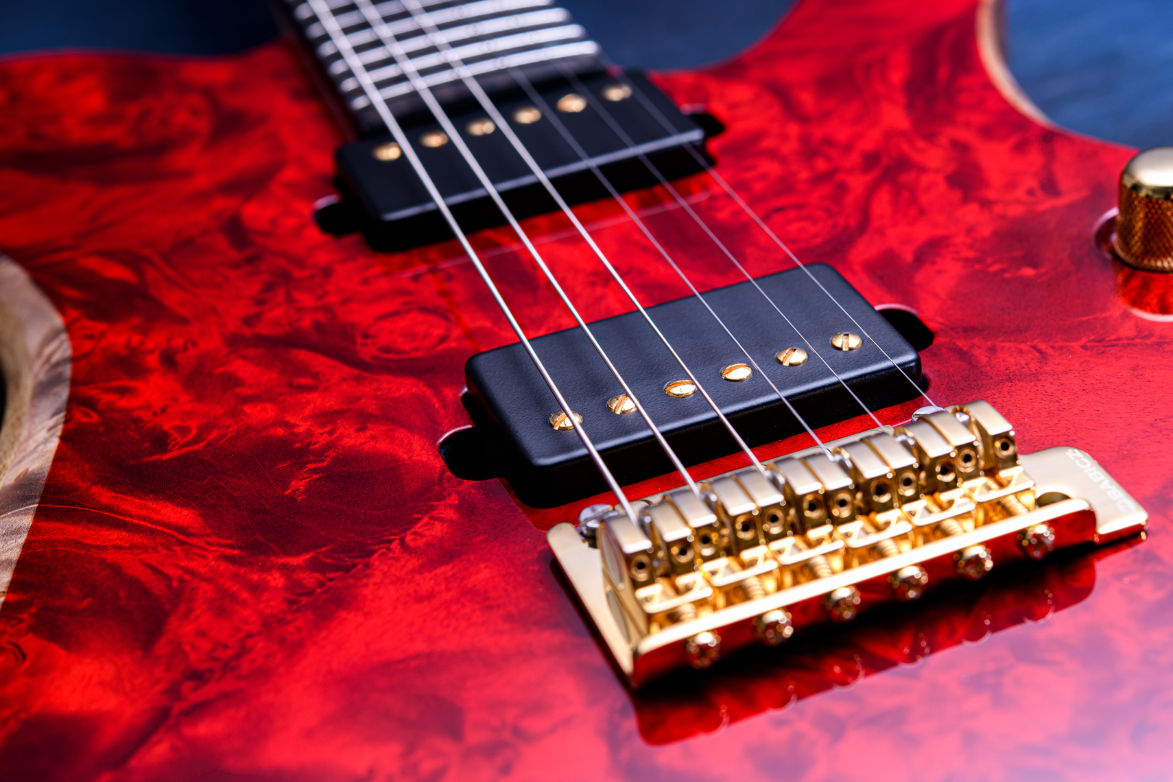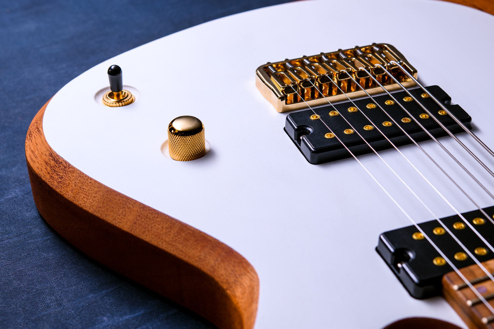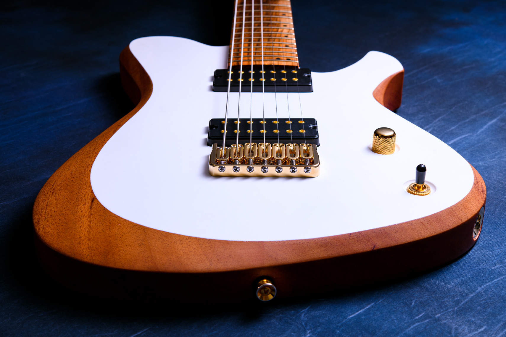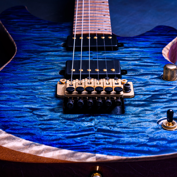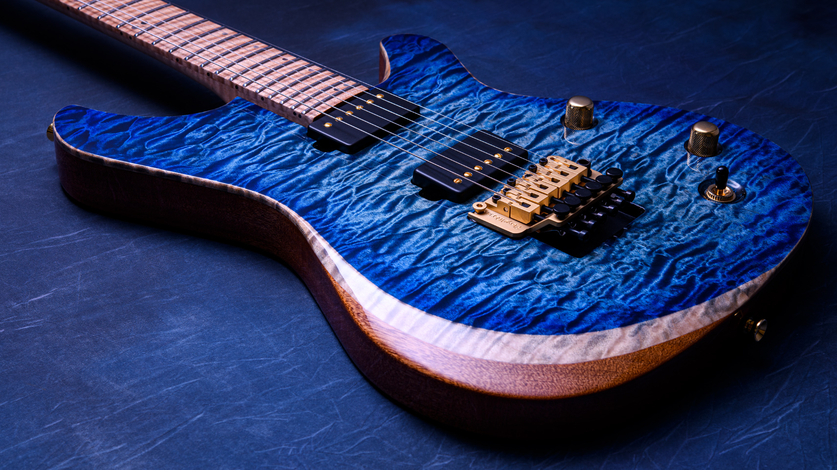 ボディには極上のキルトメイプルを贅沢に使用し、ウエイトレリーフ加工(チェンバー加工)が施されたブラックリンバとの組み合わせを採用。ラグジュアリーなルックスとタイトでクリアなサウンド、機能性のすべてを兼ね備えております。