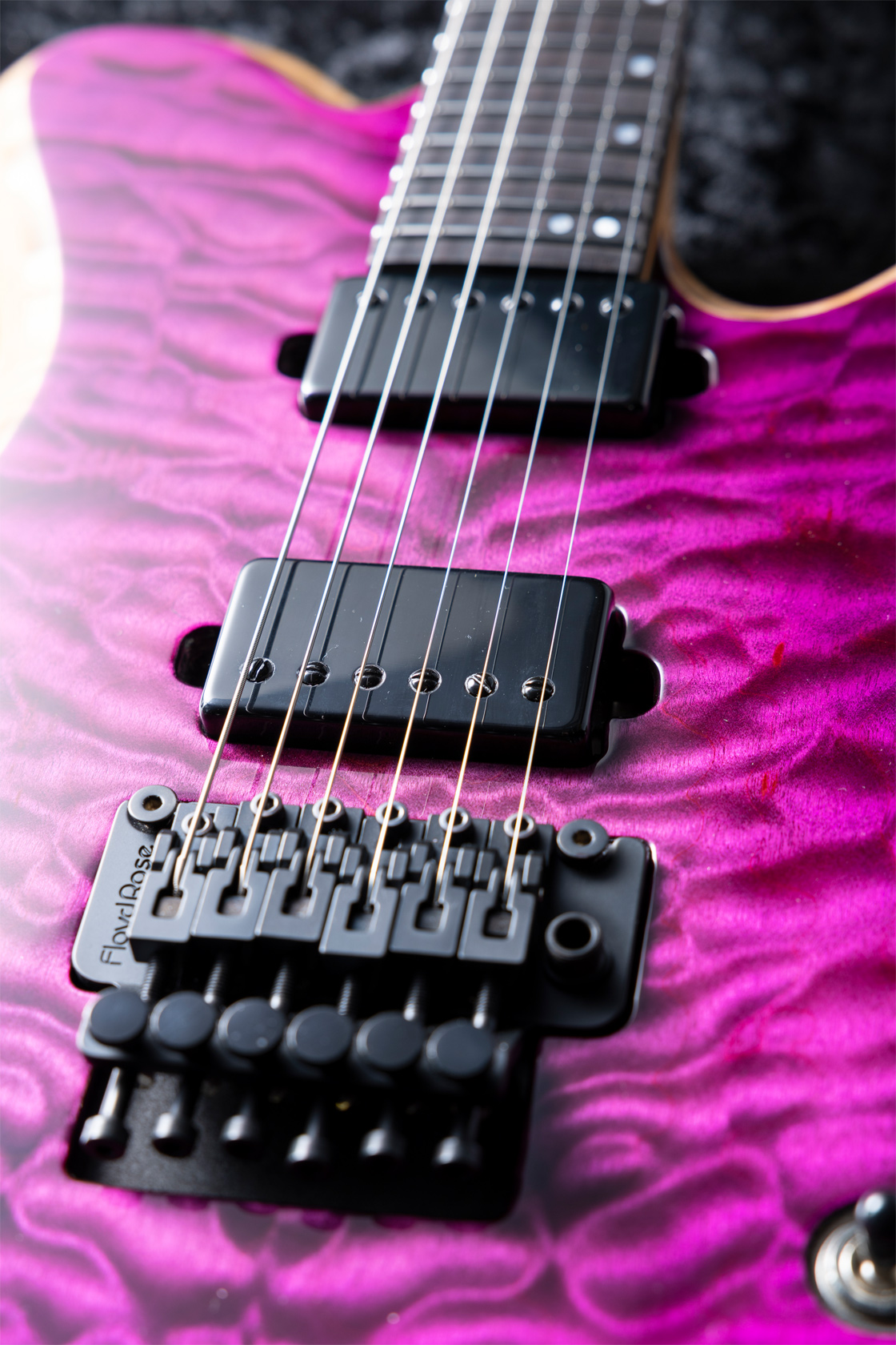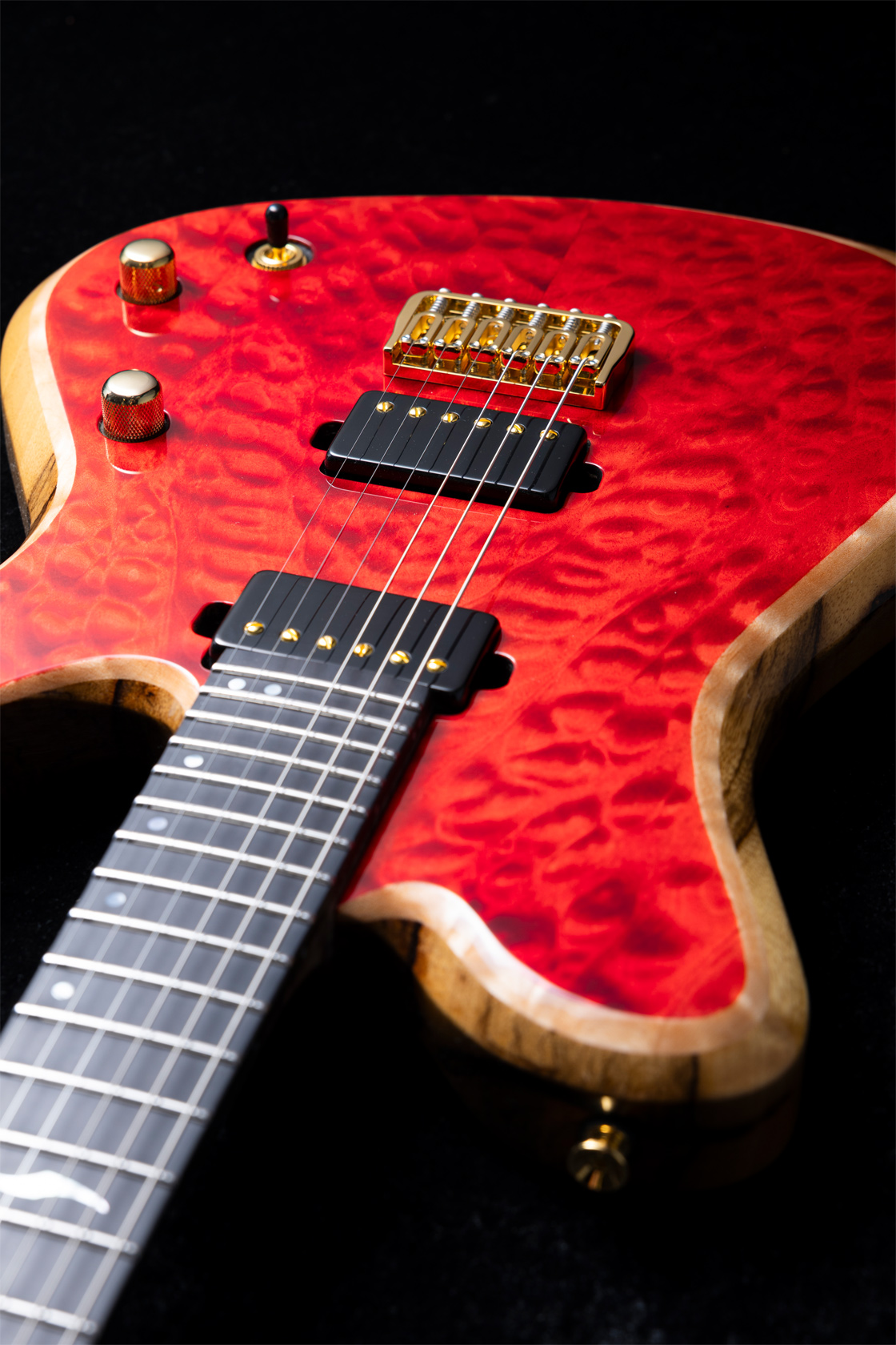 Impulseはテレキャスターを彷彿とさせるシングルカットのボディシェイプをオフセットさせ、シャープなアウトラインを追加したデザインとなっています。見た目の第一印象を決定づけるボディトップ材には厳選されたキルトメイプル材をセレクトし、赤みがかったパープルステインにて着色を行ったカラーリングに仕上がっております。独創的なアウトラインも目を惹きますが、ボディ全周にわたってベベルド(面)カットが入れられており、良好な体へのフィット感はもちろん、見た目のアクセントにも一役買っております。