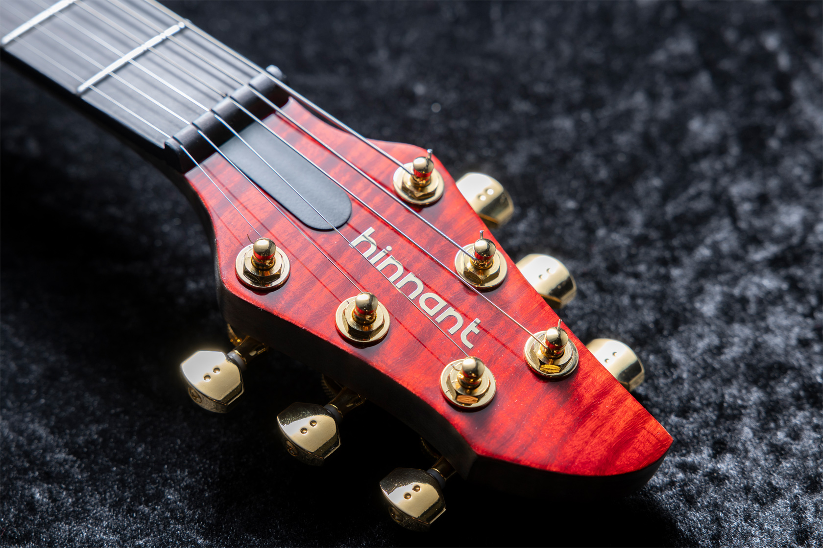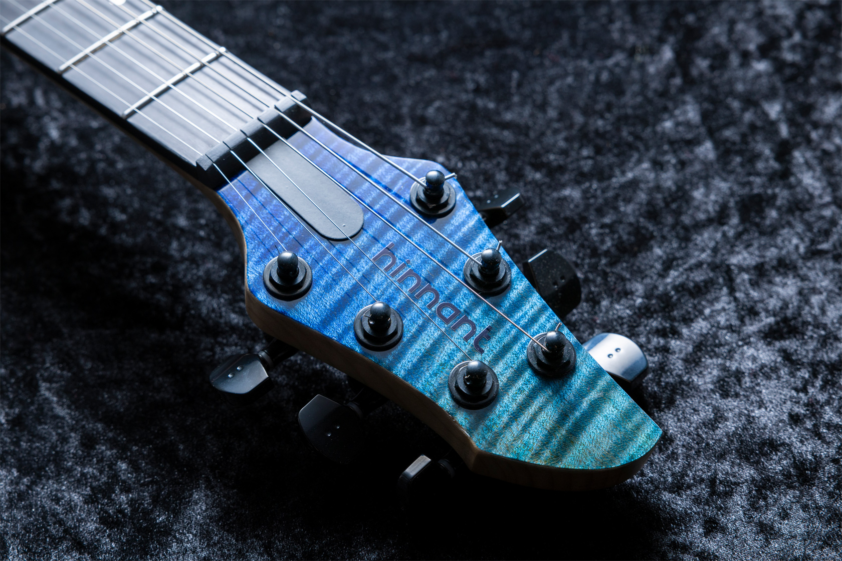 ボディバックのブラックリンバにはウエイトレリーフ加工(チェンバー加工)が施されており、重量感も非常に軽量で取り回しの良さも魅力です。ネック材に使用されているフレイムメイプルや漆黒のエボニー指板など、各部のマテリアルには Hinnant 氏が厳選した良質な木材が使用されております。