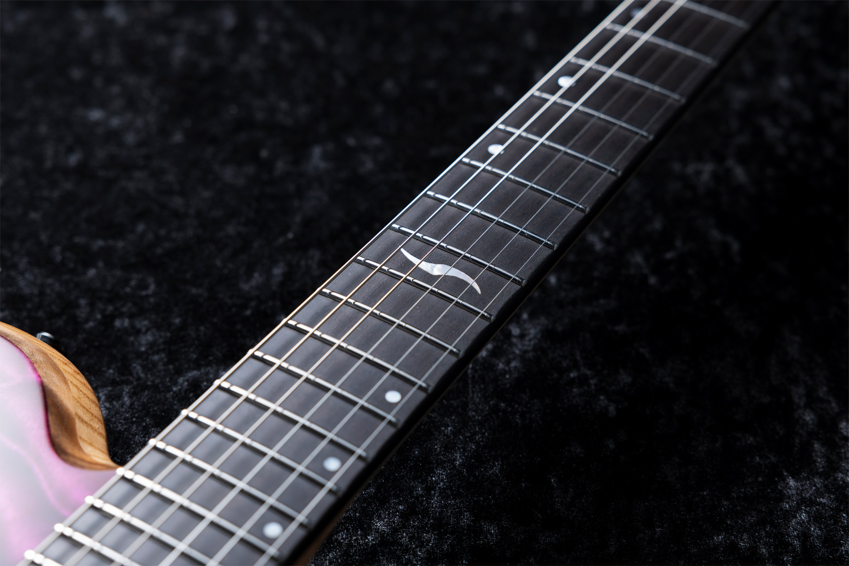 ボディバックにはスワンプアッシュ材を使用しており、ウエイトレリーフ加工(チェンバー加工)も施されておりますので、重量感も非常に軽量で取り回しの良さも実現しております。ネック材にも良質なフレイムメイプルネックをセレクト。演奏時のフィーリングを決定づけるフィンガーボードには黒く良質なエボニーが使用されております。現在、大手メーカーではこのような均一に黒く良質なエボニー材を一定数用意することが難しく、製品に使用することが困難となっていますが、小規模かつ完全ハンドメイドで製作しているからこそ、このような希少な材も出し惜しみせず使用することが可能なのです。