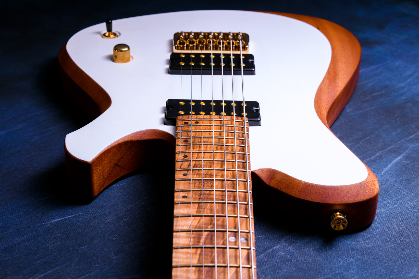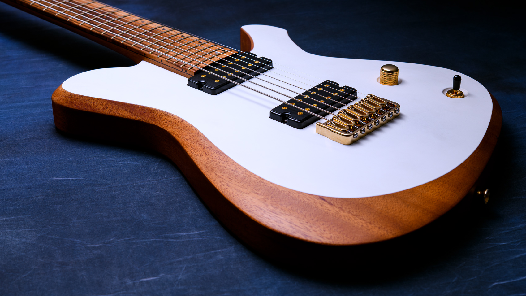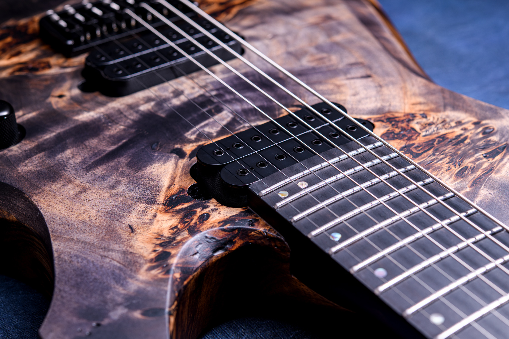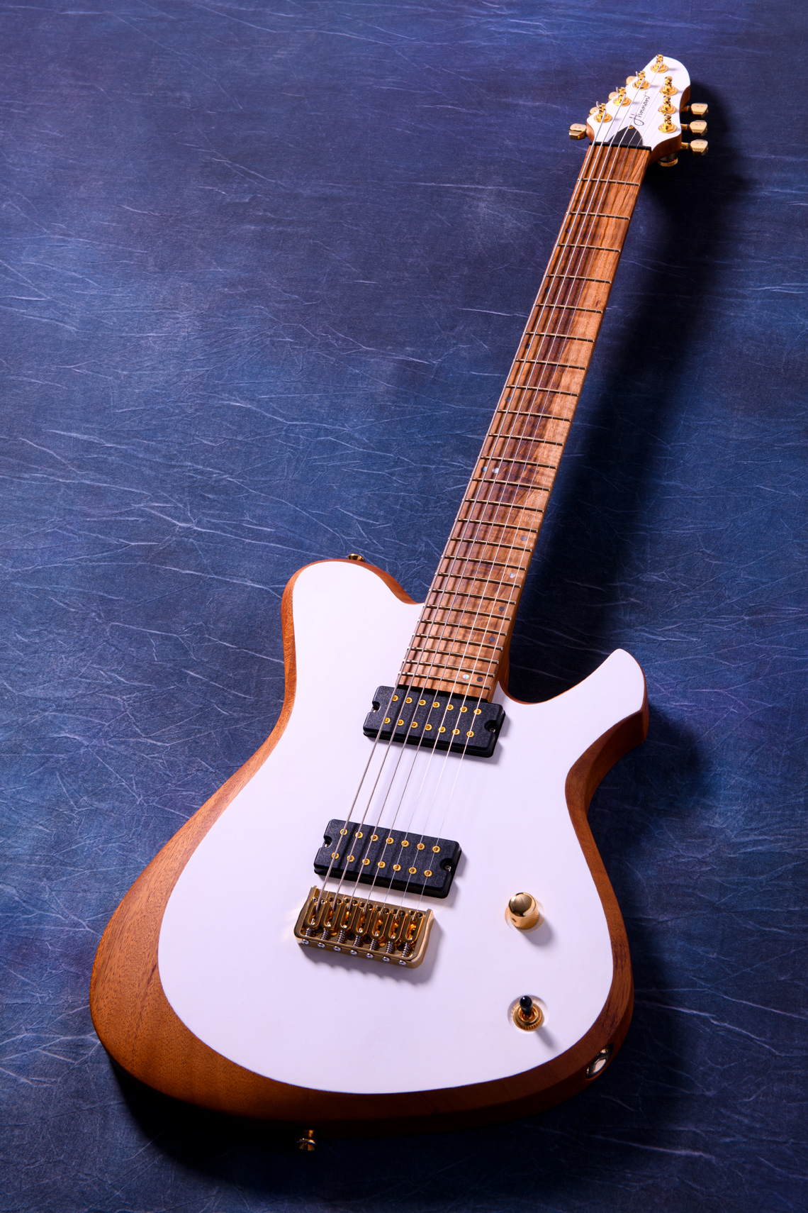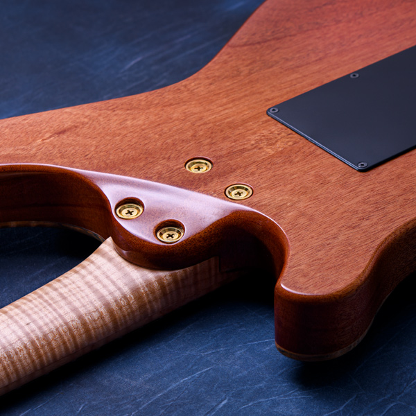 特徴的なオールマホガニーのボディ&ネックを採用。マホガニー単板の7弦ギターは珍しくありませんが、ネックまでマホガニーを採用しているモデルは珍しいのではないでしょうか。メイプルやアッシュ等の木材に比べるとややマイルドなアタック感ですが、芳醇なローエンドと豊かな倍音が魅力です。