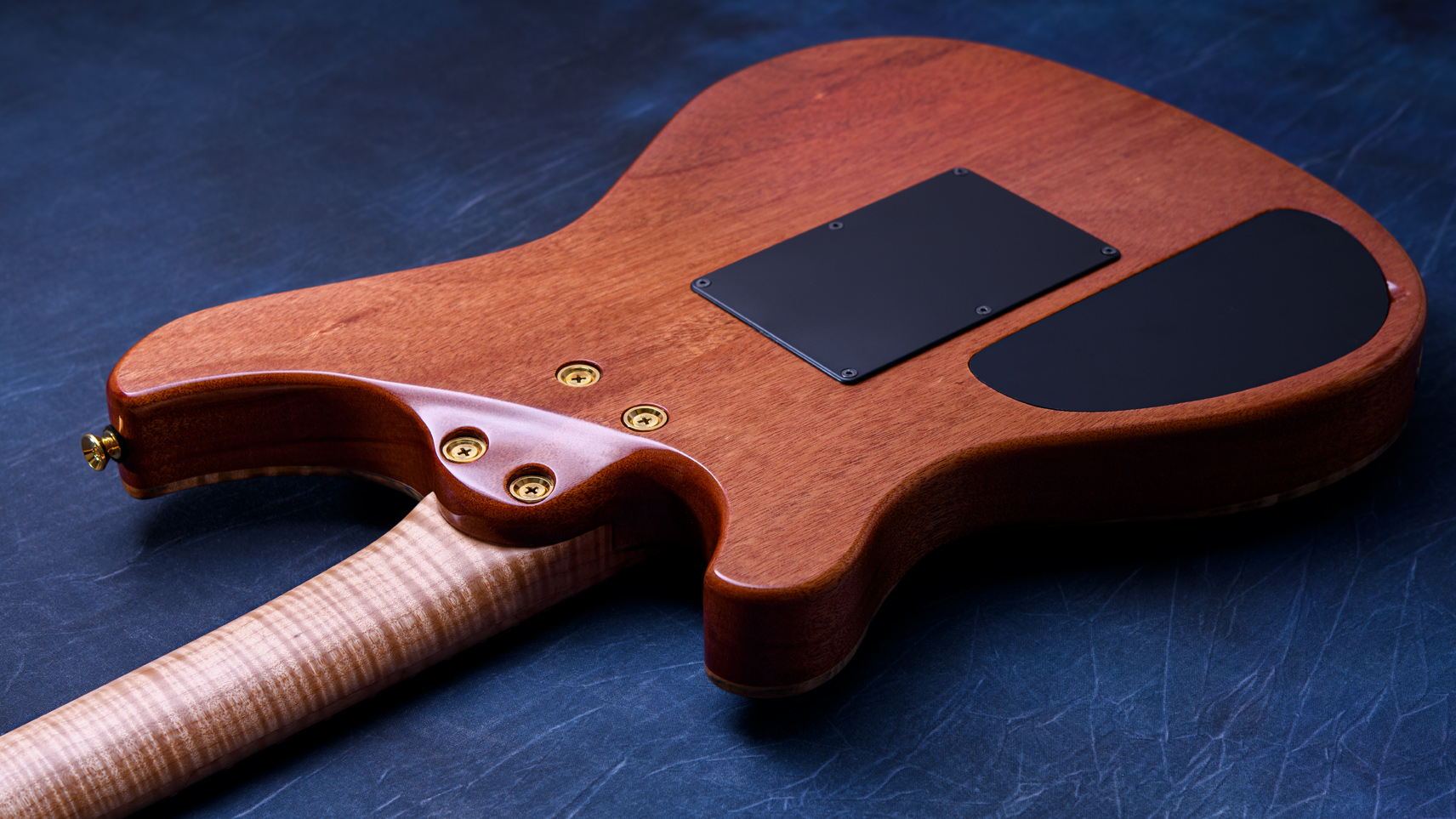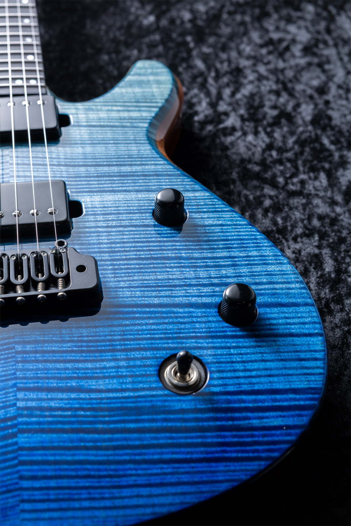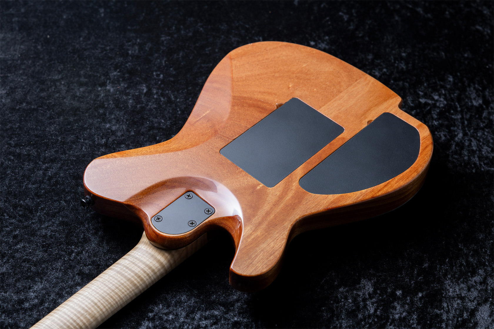 見た目の第一印象を決定づけるボディトップ材にはフレイムメイプルをセレクトし、フェイドカラーにて着色された落ち着いた印象の一本です。ボディバックには詰まった上質なマホガニーを採用。アッシュなどの材と比べ、芳醇でウォームなローエンドが魅力です。さらに、ウエイトレリーフ加工(チェンバー加工)が施されており、重量感も非常に軽量で取り回しの良さも実現しております。