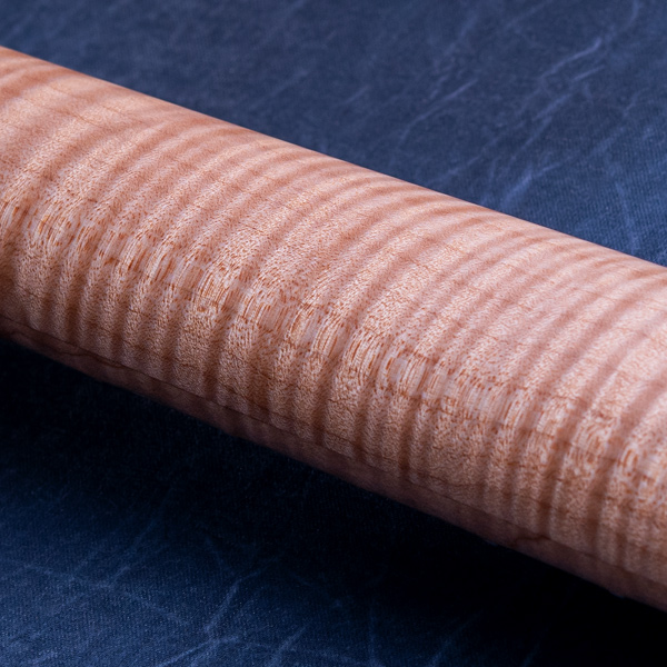 ネック材にも良質なフレイムメイプルネックをセレクト。演奏時のフィーリングを決定づけるフィンガーボードには黒く良質なエボニーが使用されております。現在、大手メーカーではこのような均一に黒く良質なエボニー材を一定数用意することが難しく、製品に使用することが困難となっていますが、小規模かつ完全ハンドメイドで製作しているからこそ、このような希少な材も出し惜しみせず使用することが可能なのです。