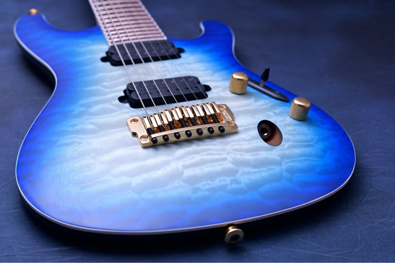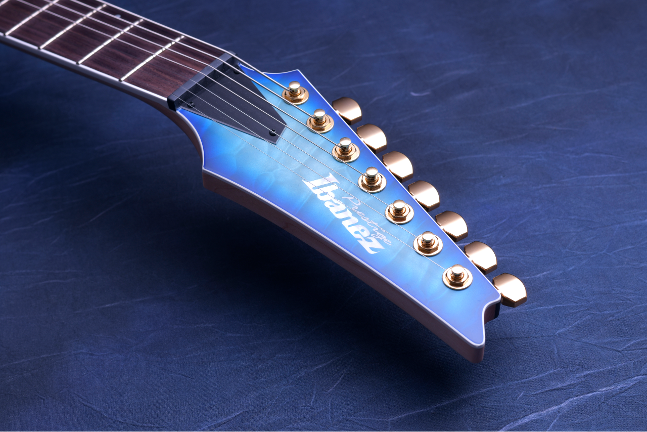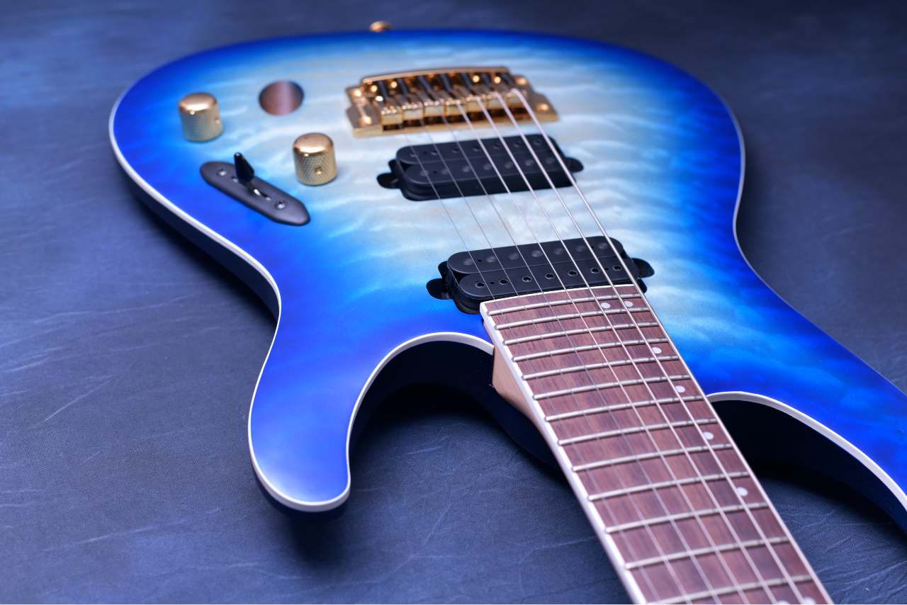 ① 美しい杢目が特徴のキルテッドメイプルトップのマホガニーバックボディ。カラーはブルーからグリーンへのバーストが美しい「Surreal Blue Burst Gloss」を採用。