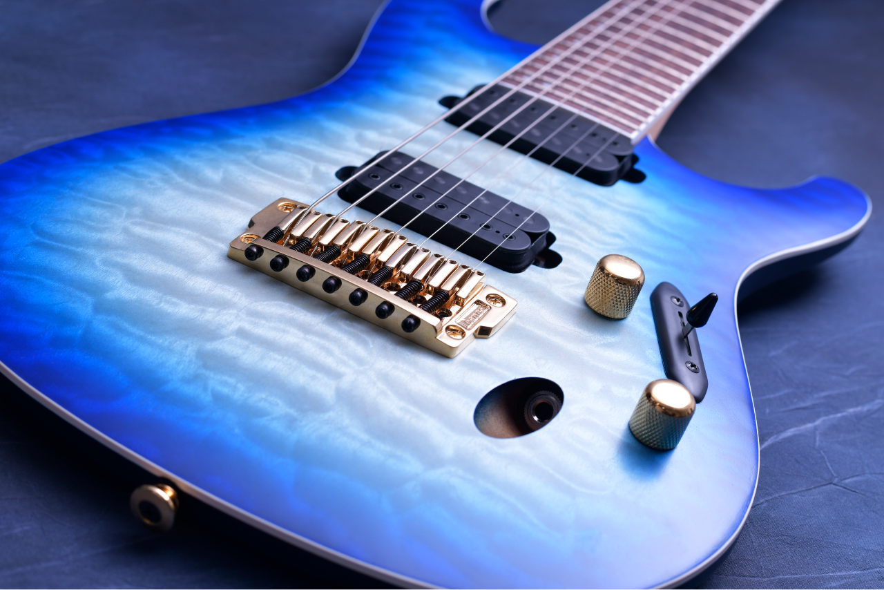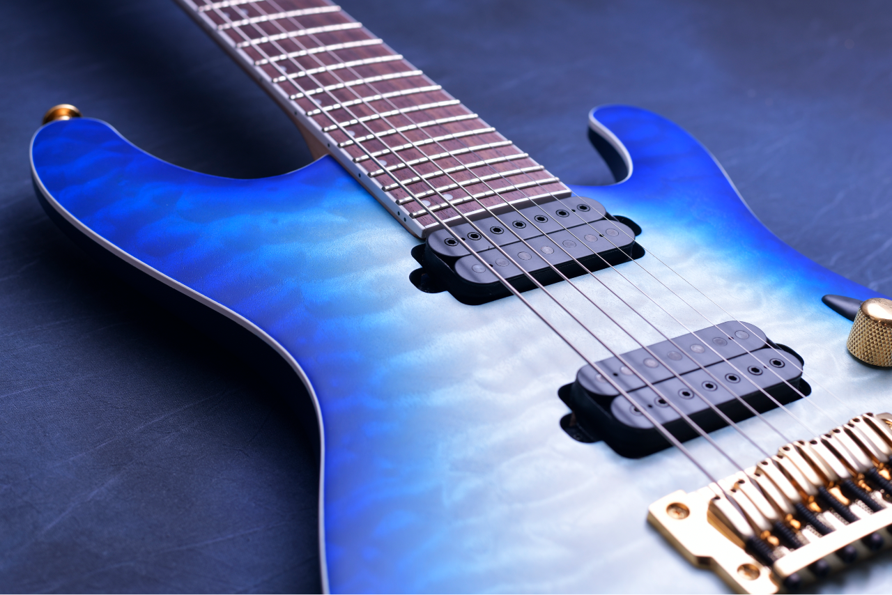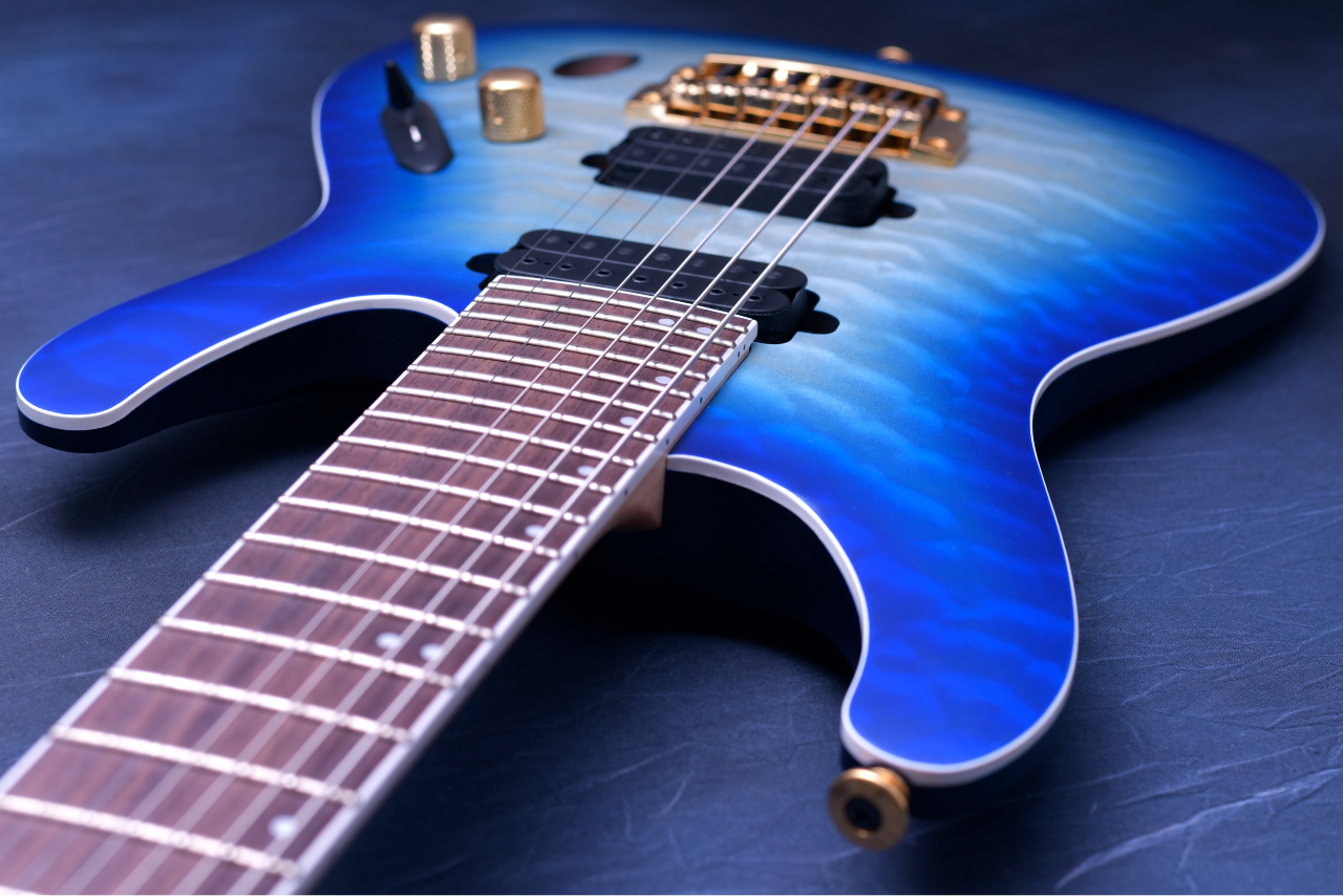 ① 美しい杢目が特徴のキルテッドメイプルトップのマホガニーバックボディ。カラーはブルーからグリーンへのバーストが美しい「Surreal Blue Burst Gloss」を採用。