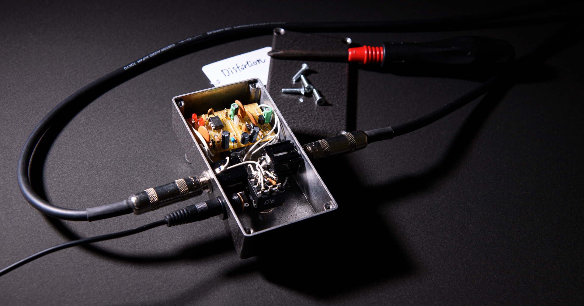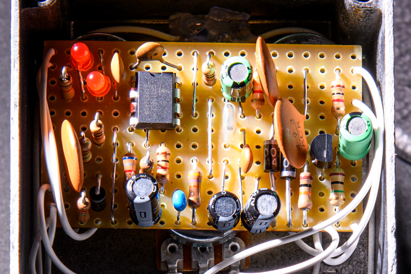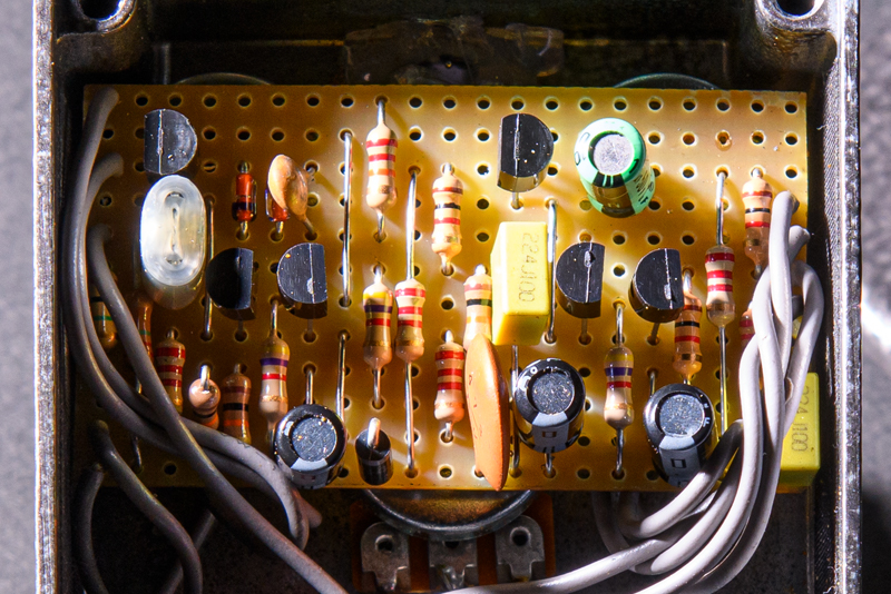 プリント基板を使わずに、エフェクター黎明期に使用されていたこともあるストリップボード(ベロボード)を使った基板をデザインしました。プリント基板でのパターンよりも太いパターンでの配線が可能になります。それにより、音色の芯が太く感じられます。