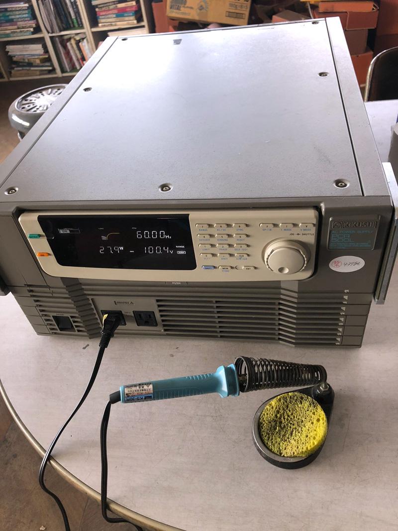 それと今回、実験としてハンダコテに繋げる電源を「交流化安定化電源」という装置を通した電気でハンダコテを駆動しました。間に入れる時と入れない時の比較した初めの感想は、「入れるとミッドが目立つようになるなぁ」という印象でしたが、やはり大きな回路が電源に入るためか、線の細い音色になる印象もあり、今後は入れないで、改めて音作りをしていく予定です。