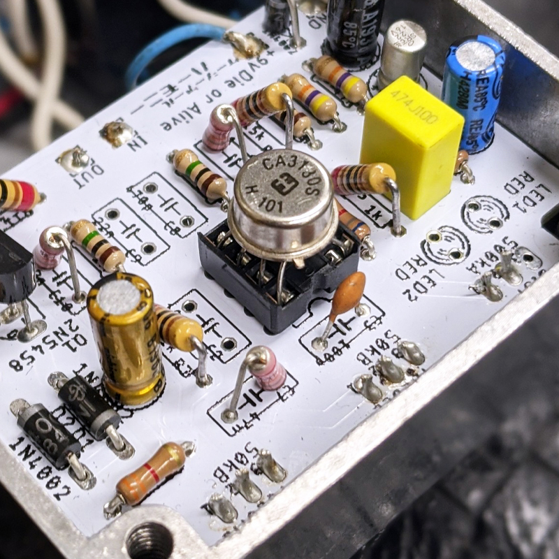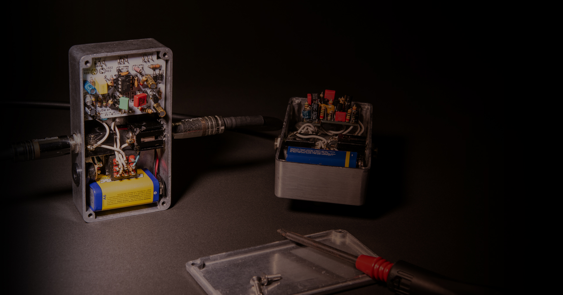 ゲインを下げたときの自然でグラッシーな歪みから濃密なディストーションまで、ドライブの可変でキャラクターを変化させる音色を理想とし作り始めました。やはりゲインを下げた時に腰砕けにならない音圧を保ち、ピッキングに小気味よく反応をさせることが課題でした。現状、RAT に近い回路になっていますが、アクは強くなく、ワイドレンジな歪みです。