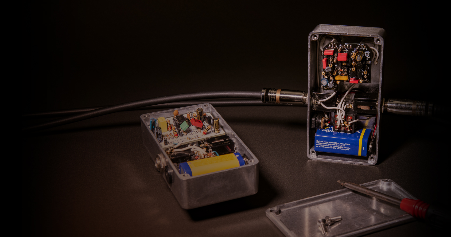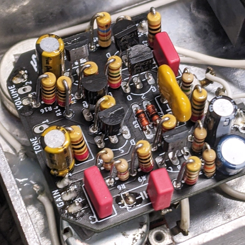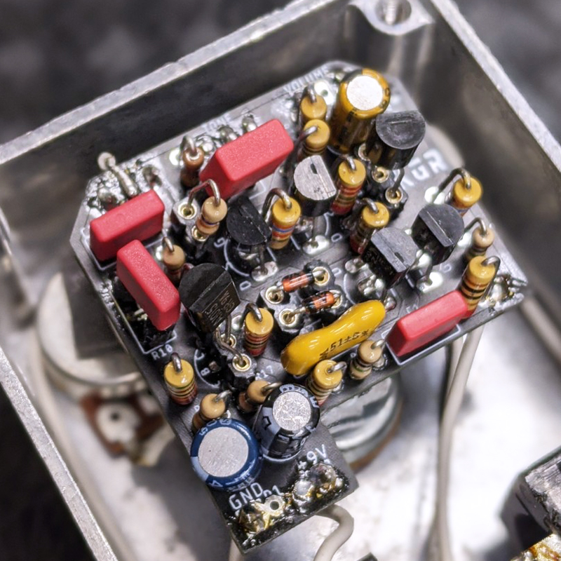 大部分としては回路構成を変更しました。元の回路は主にふたつの増幅段での構成ですが、初段は歪みを作り、後段はレベルを調整するものでした。トーンはその間にフィルターを入れ調整できるようにしていましたが、変更後は、後段の増幅分でトーン調整を行うような回路構成で、いわゆる TS 系の回路をディスクリートにしたような回路です。