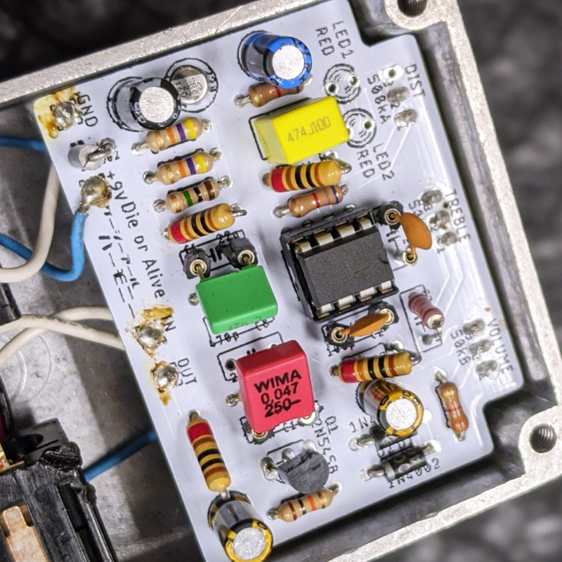 もうひとつは、しっかりとしたディストーションからドライブを絞ってクランチペダルとしても成立する、シングル回路オペアンプのドライブエフェクター。